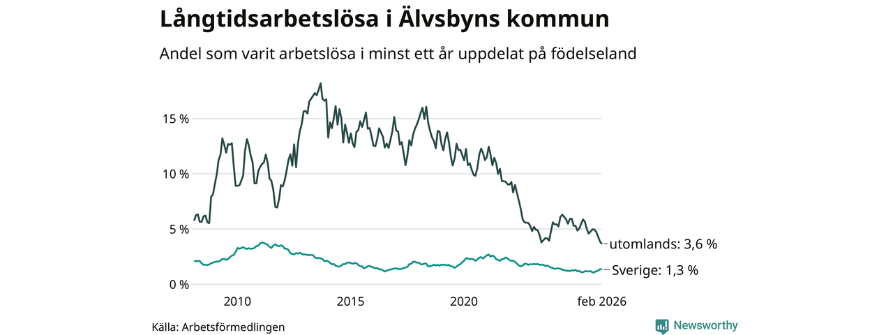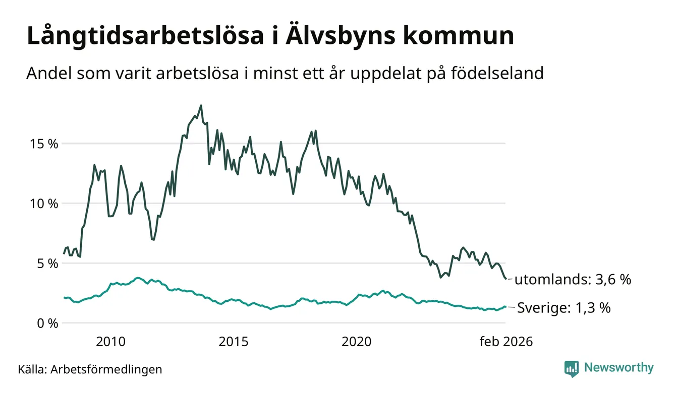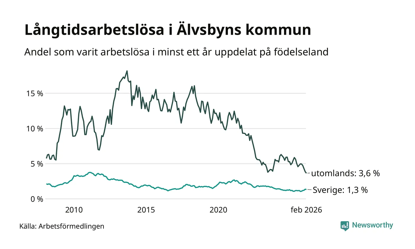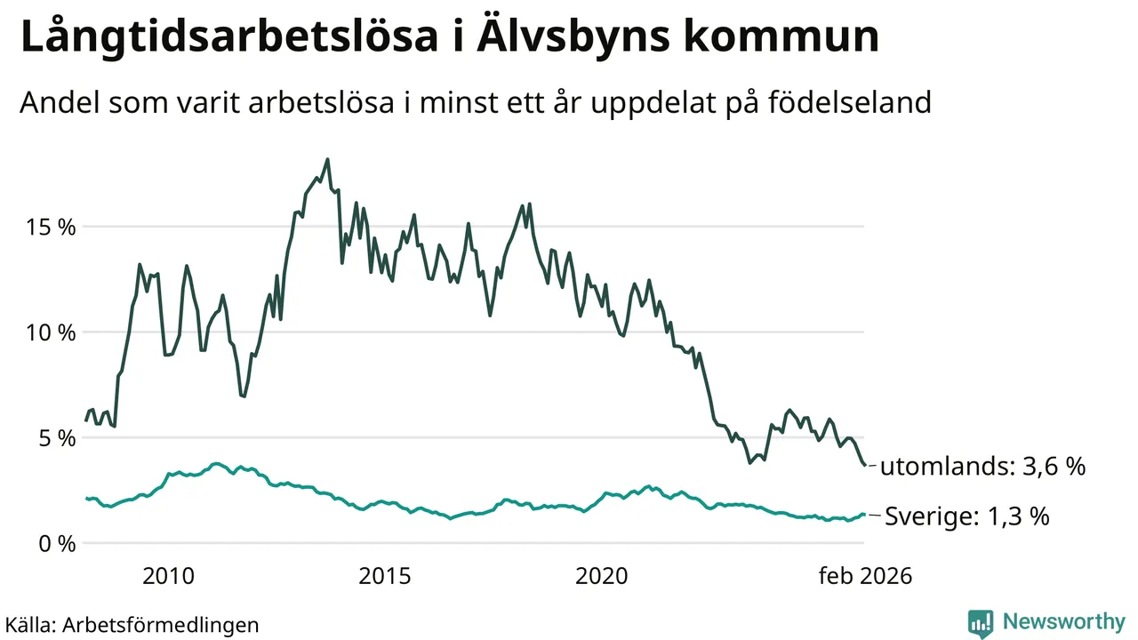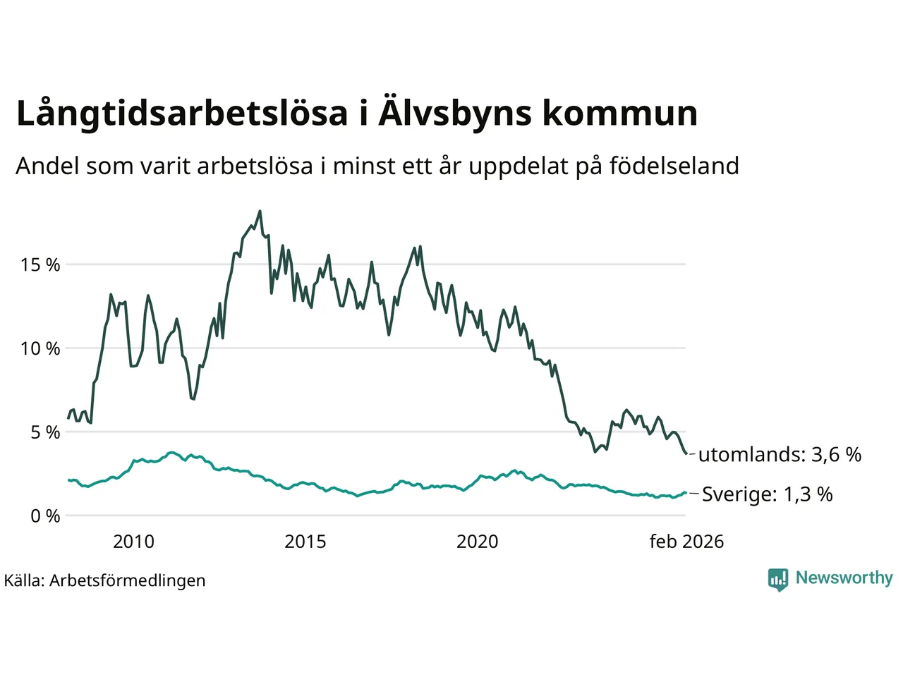42 av de långtidsarbetslösa i Älvsbyn är födda i Sverige, medan 18 är födda utomlands. Det innebär att långtidsarbetslösheten bland Sverigefödda är 1,3 procent, medan den är tre gånger så hög – 3,6 procent – bland födda utomlands. Även i riket som helhet är arbetslösheten högre bland utrikesfödda.