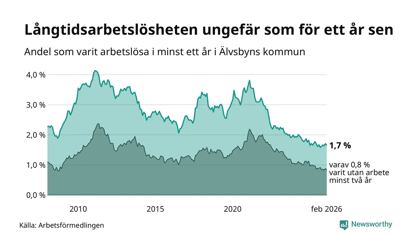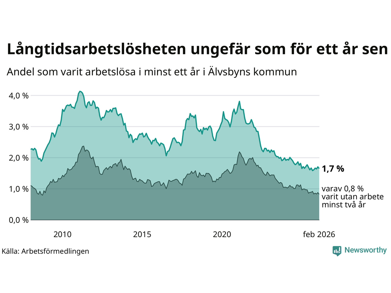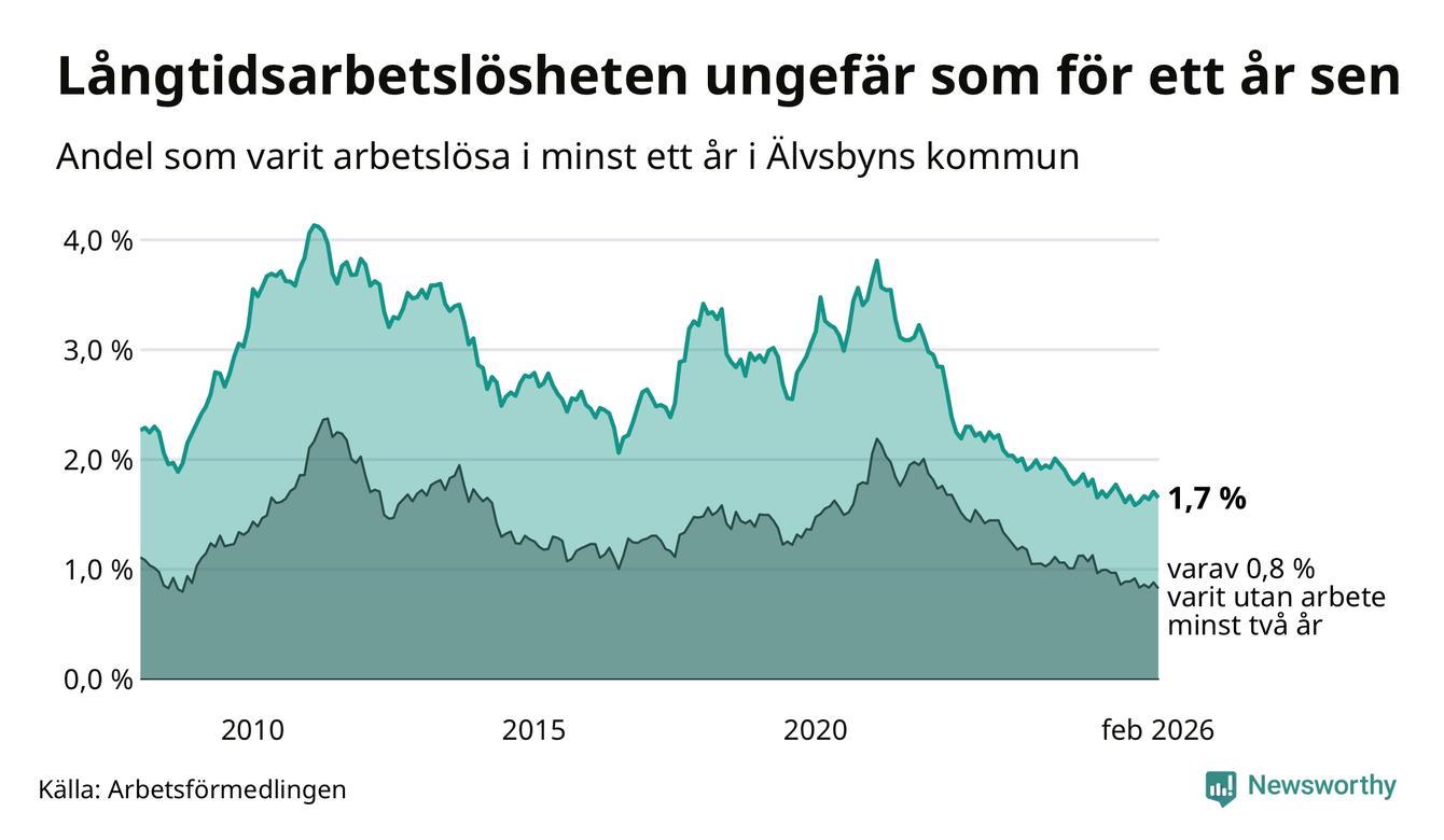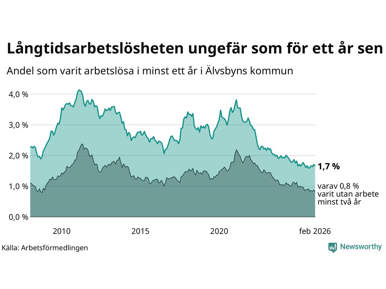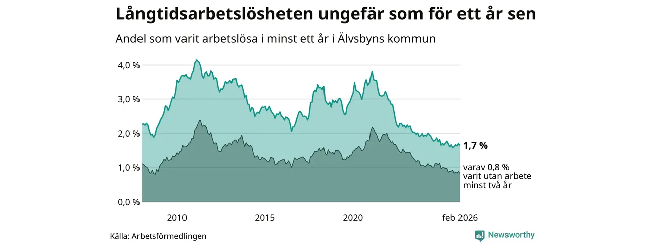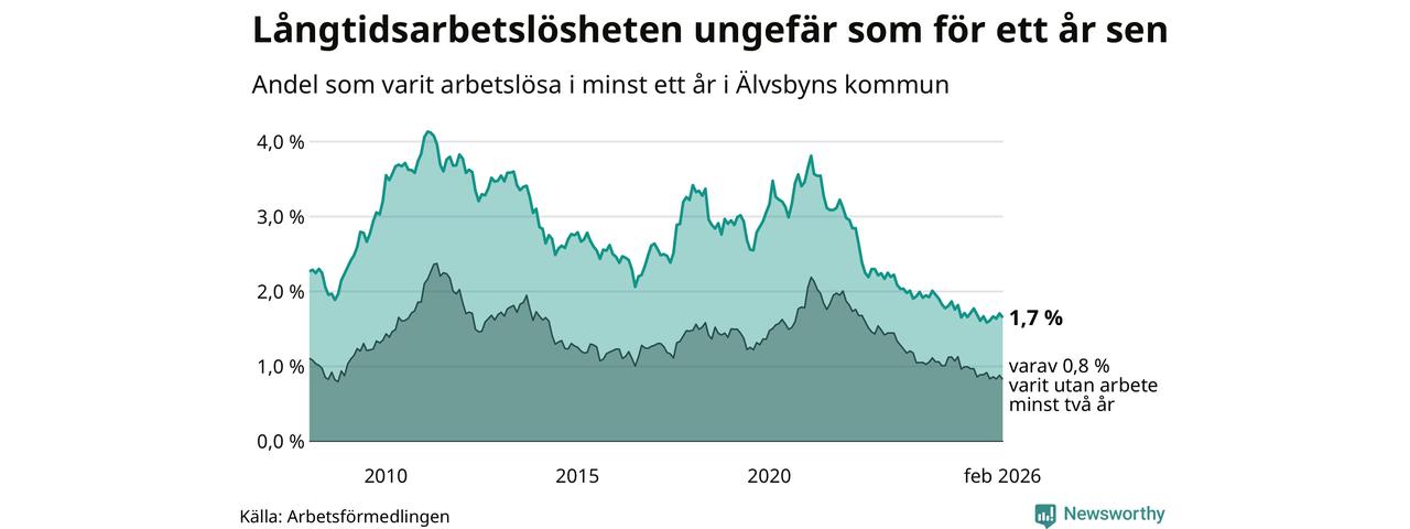 Andelen som varit utan arbete i minst ett år i Älvsbyn var ungefär lika stor i februari jämfört med samma månad för ett år sedan. Det visar Arbetsfömedlingens senaste månadsstatistik.