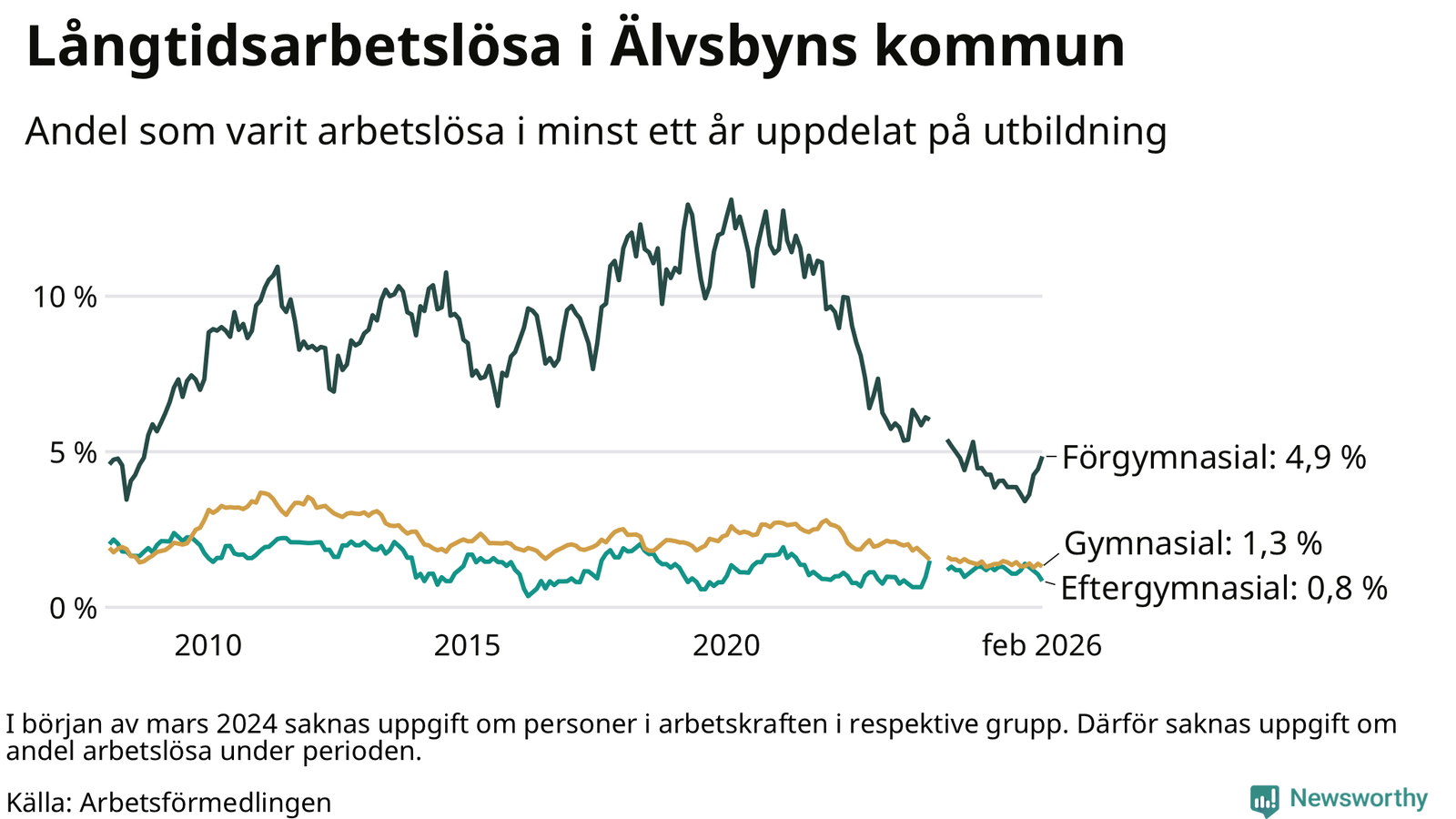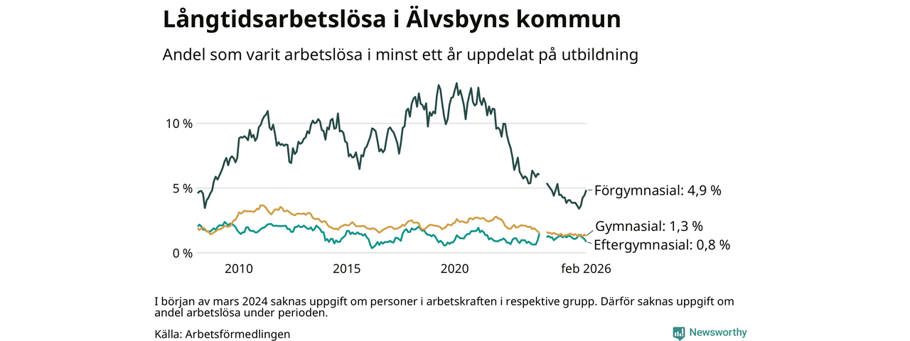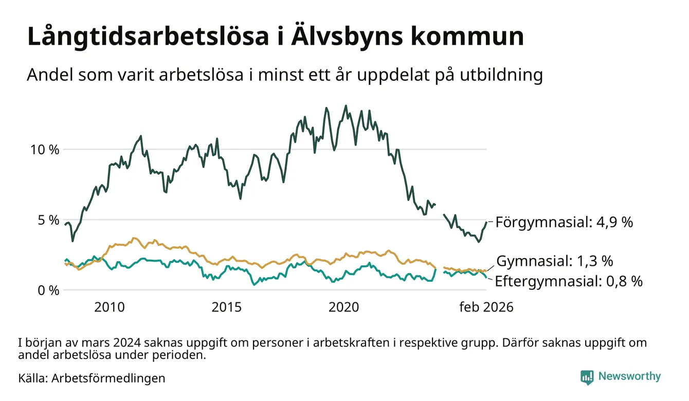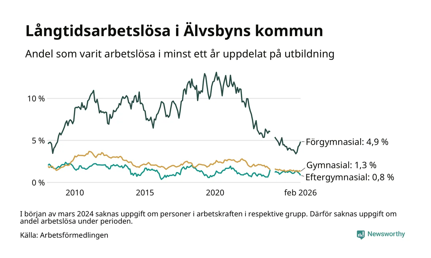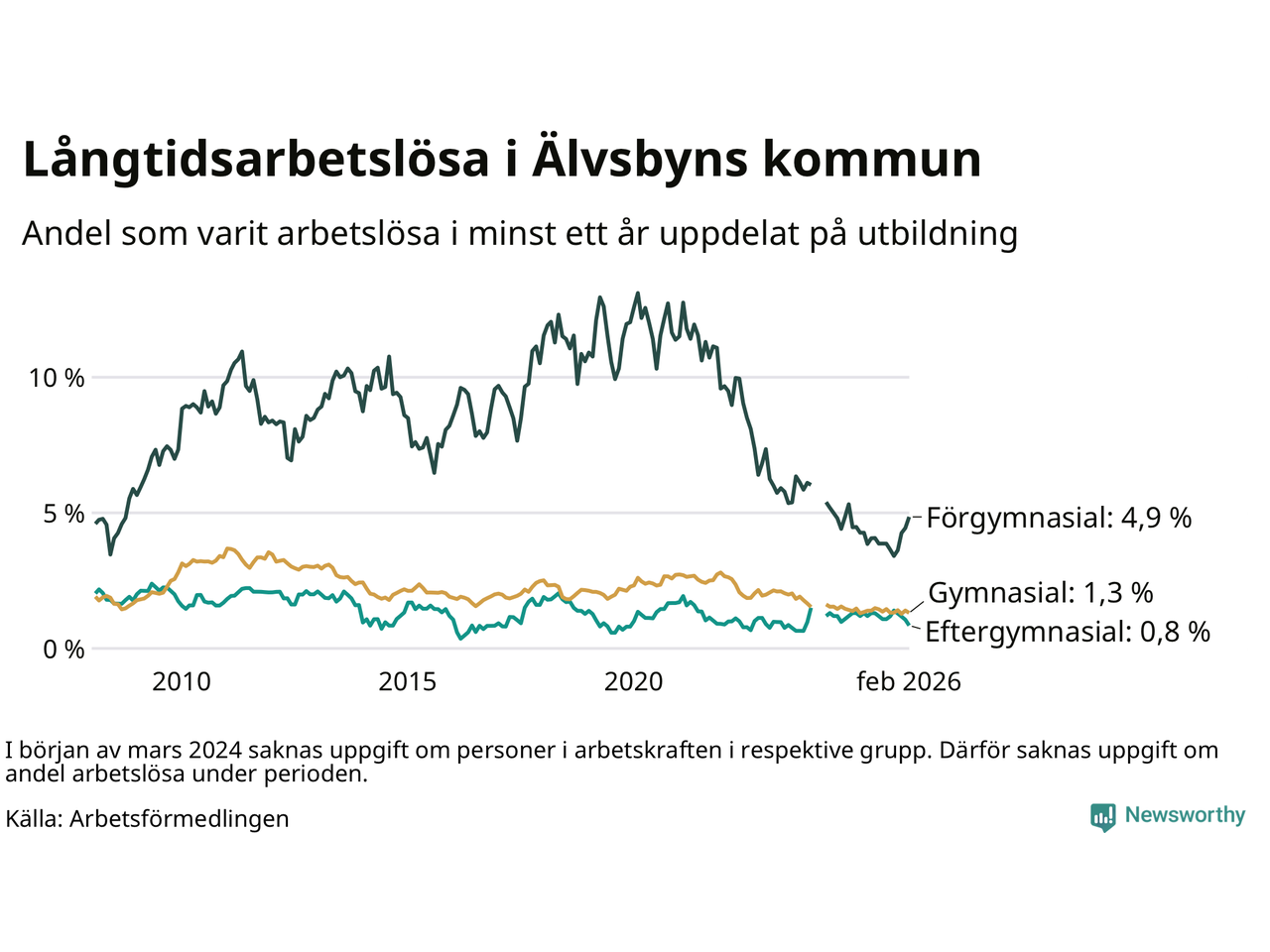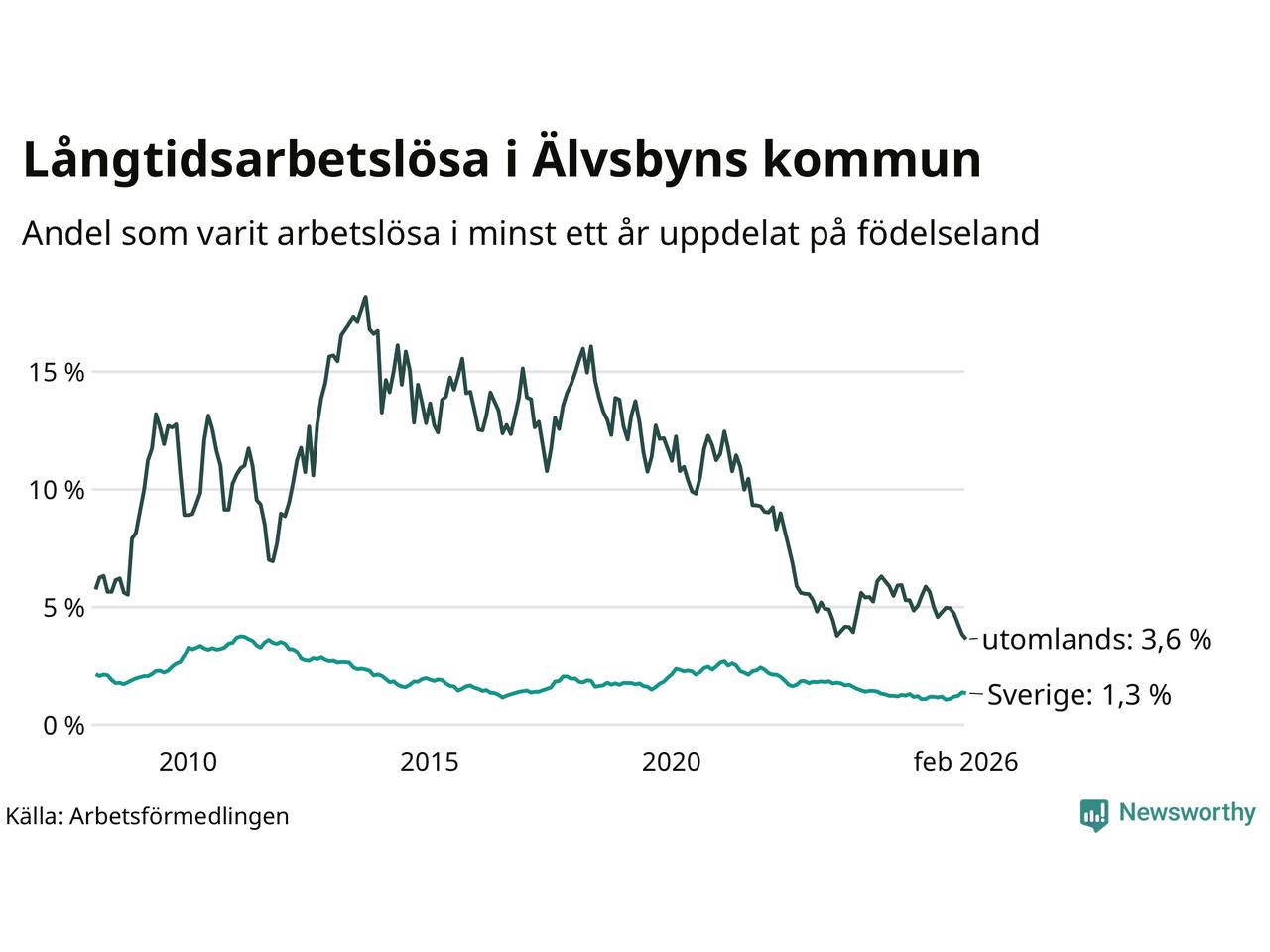 Andelen som varit utan arbete i minst ett år i Älvsbyn var ungefär lika stor i februari jämfört med samma månad för ett år sedan. Det visar Arbetsfömedlingens senaste månadsstatistik.