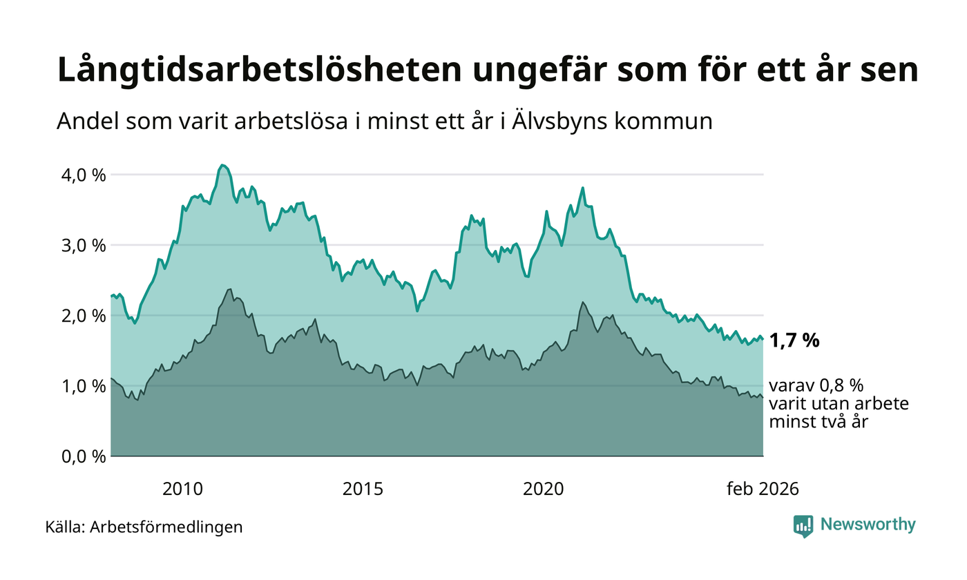 I februari hade 60 Älvsbybor varit arbetslösa i minst ett år, vilket är två färre än månaden innan. 60 personer motsvarar 1,7 procent av arbetskraften i kommunen – andelen långtidsarbetslösa är ungefär på samma nivå som för ett år sedan.
