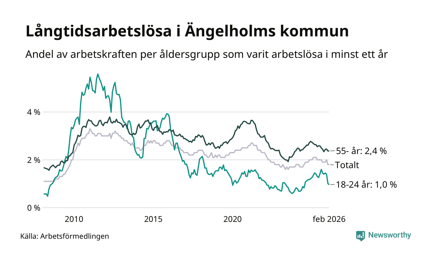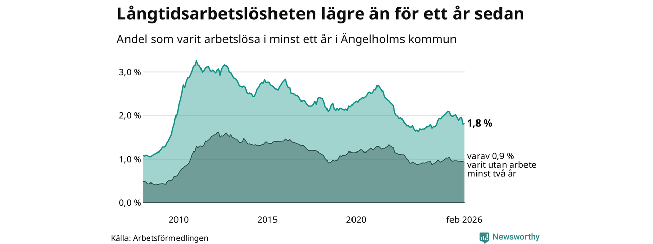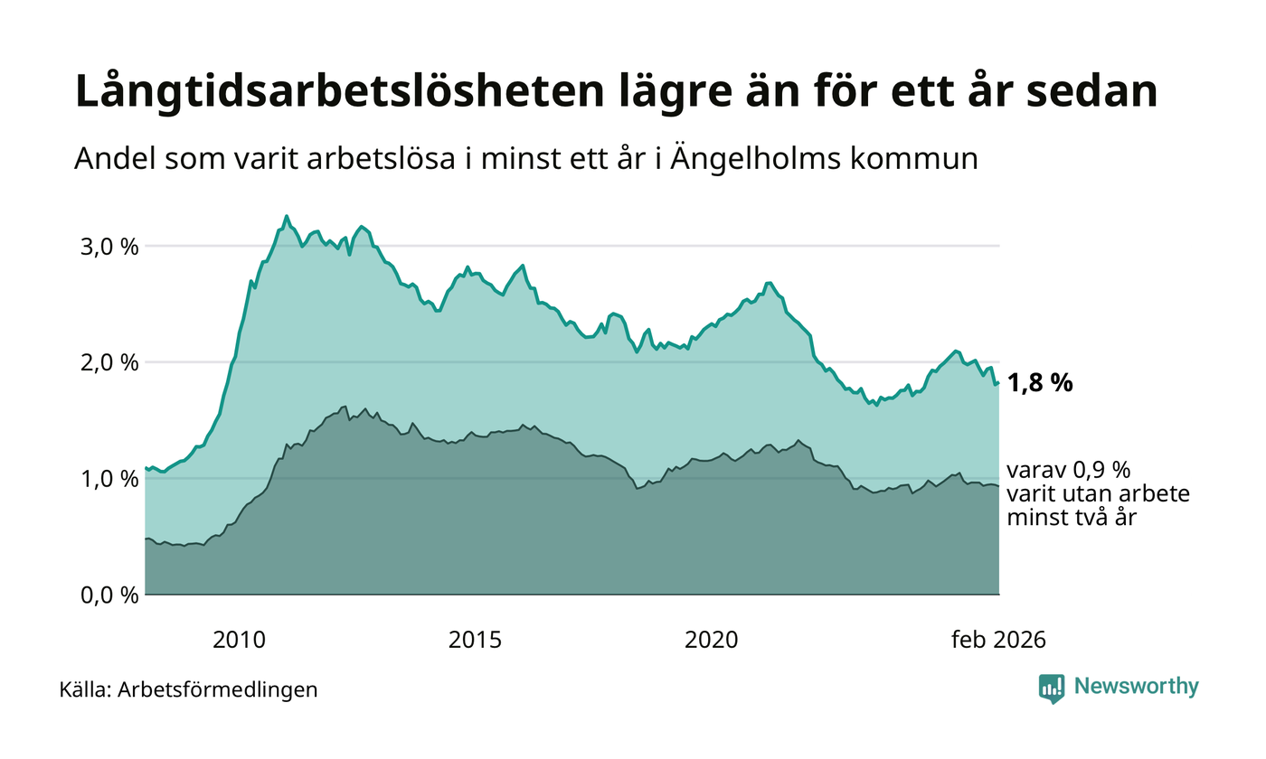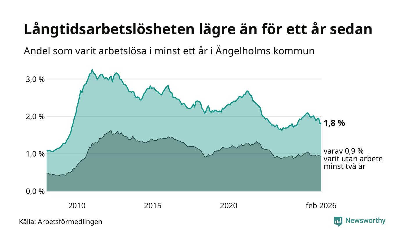 I februari hade 405 Ängelholmsbor varit arbetslösa i minst ett år, vilket är fem fler än månaden innan. 405 personer motsvarar 1,8 procent av arbetskraften i kommunen – andelen långtidsarbetslösa är 0,3 procentenheter lägre än samma månad för ett år sedan.