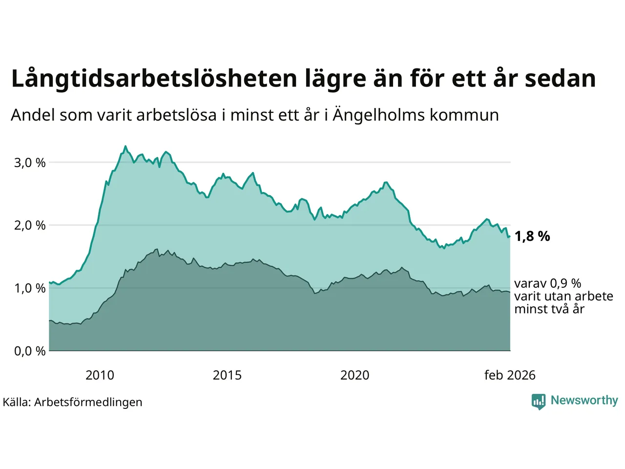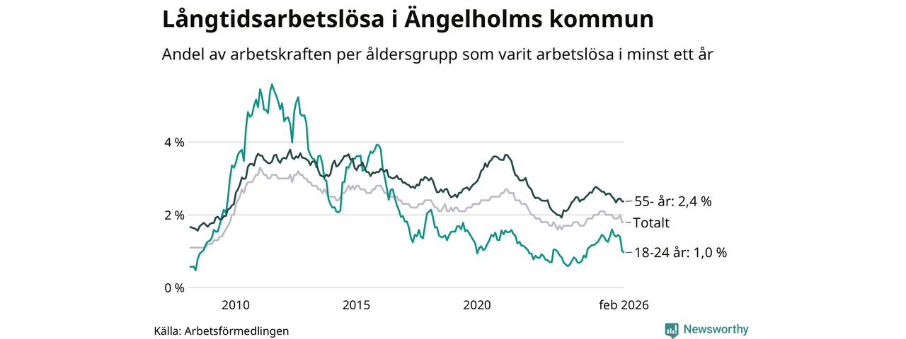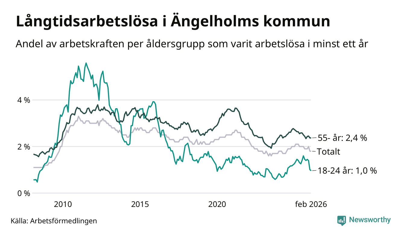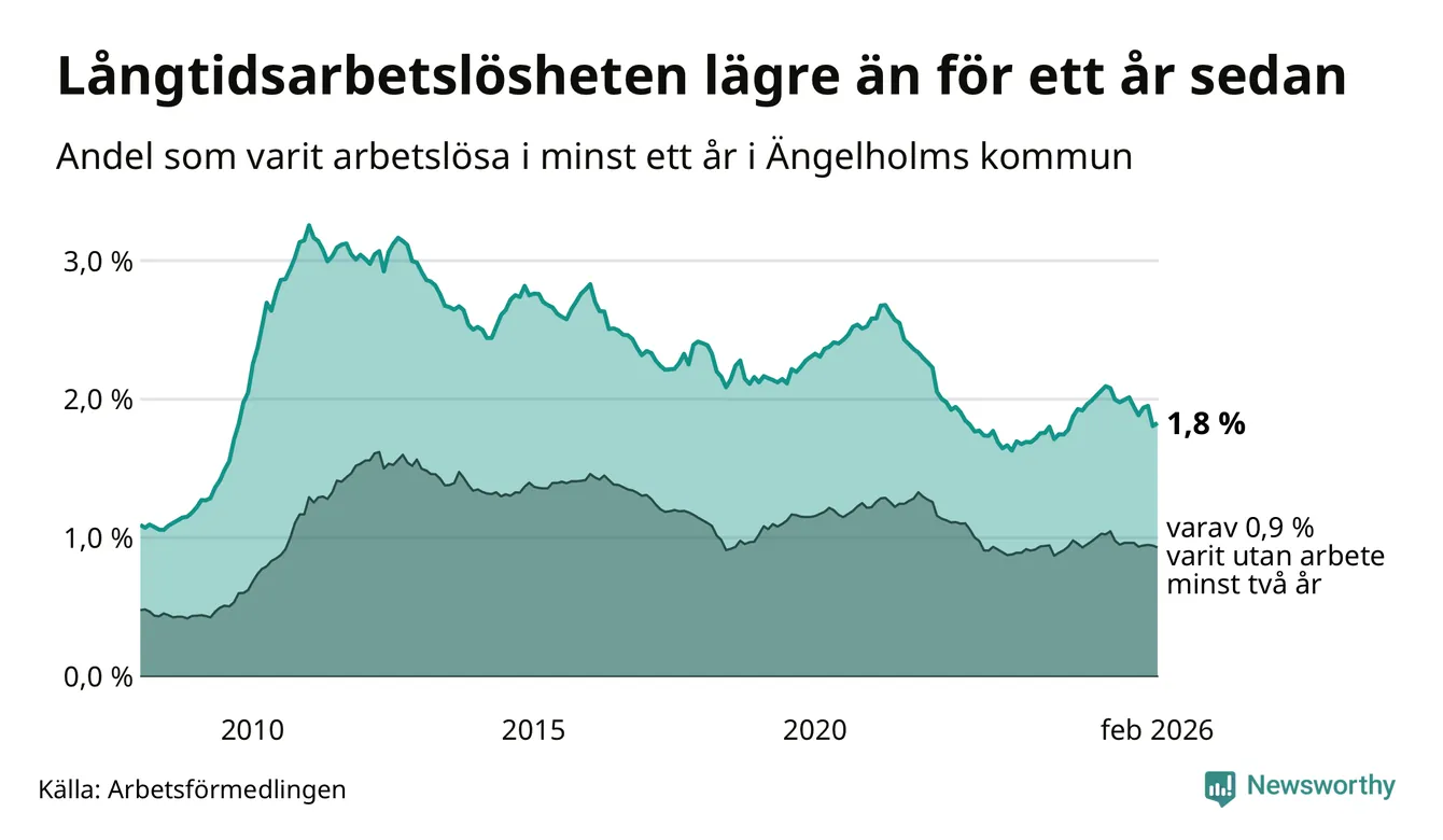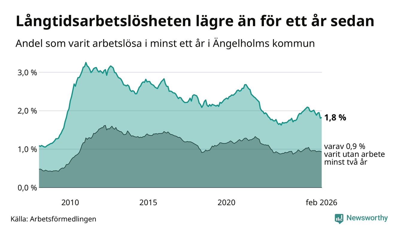 I februari hade 405 Ängelholmsbor varit arbetslösa i minst ett år, vilket är fem fler än månaden innan. 405 personer motsvarar 1,8 procent av arbetskraften i kommunen – andelen långtidsarbetslösa är 0,3 procentenheter lägre än samma månad för ett år sedan.