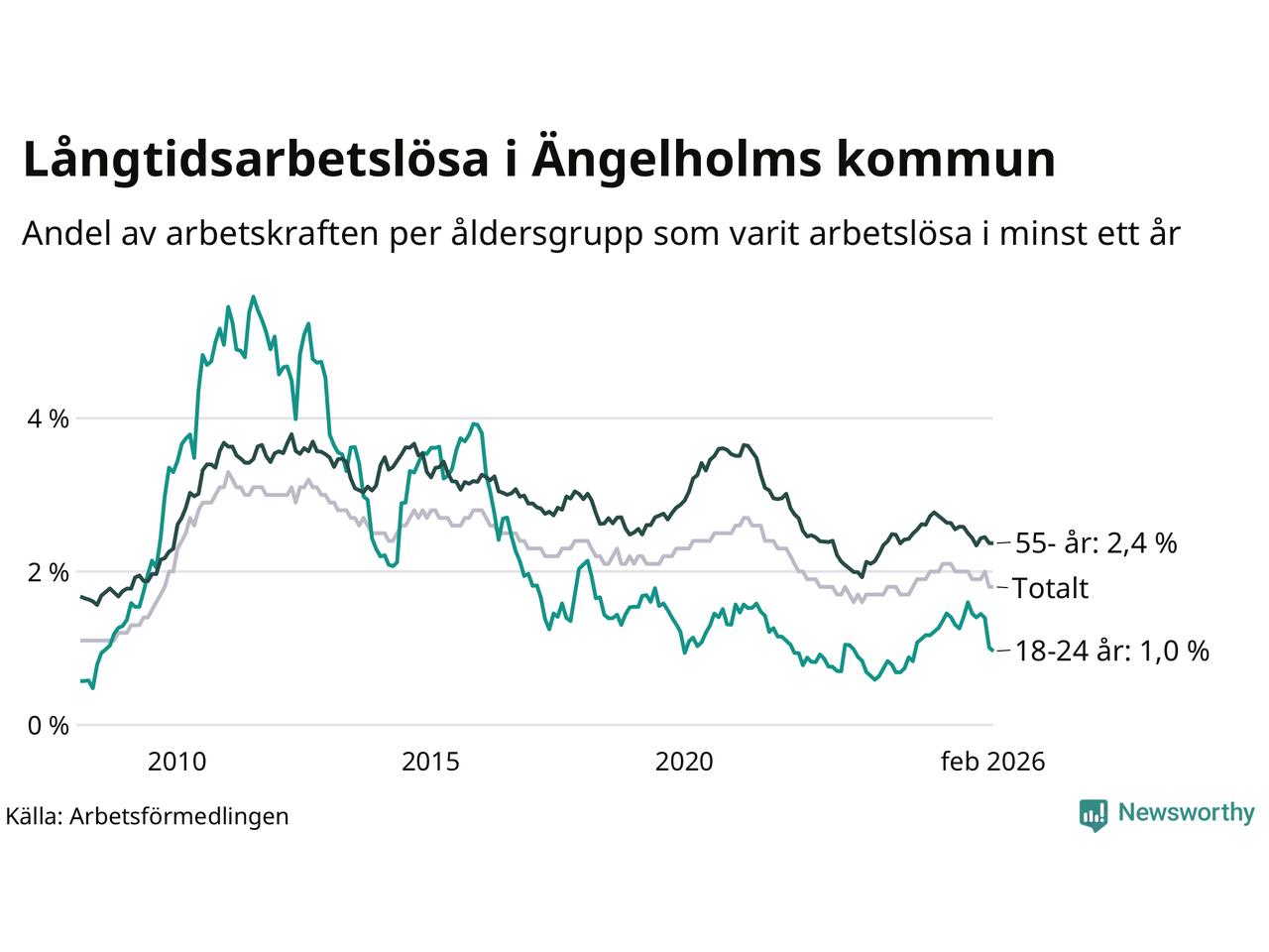 | Andel arbetslösa i minst två år | 0,9 % | 2,2 % | 1,6 % |