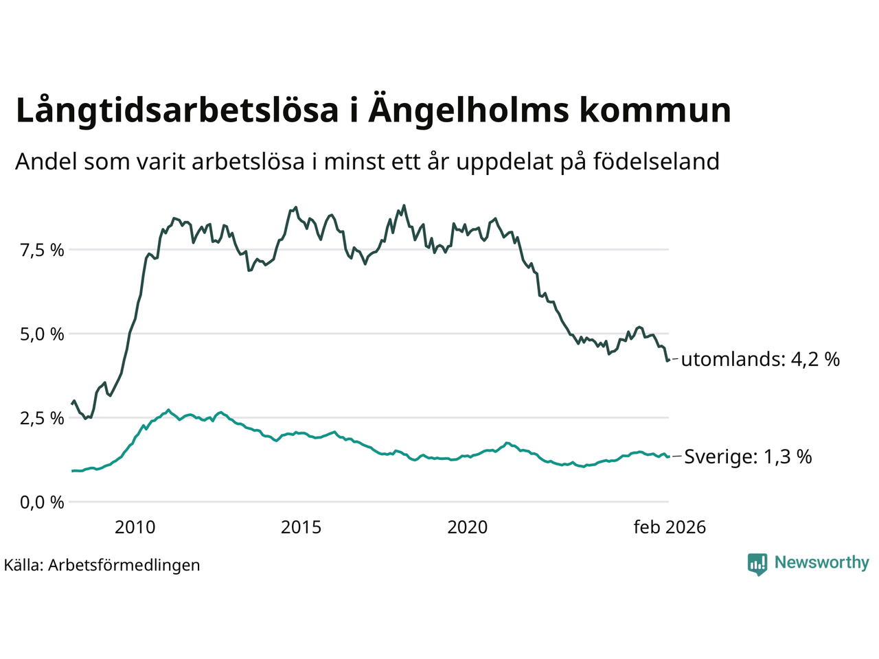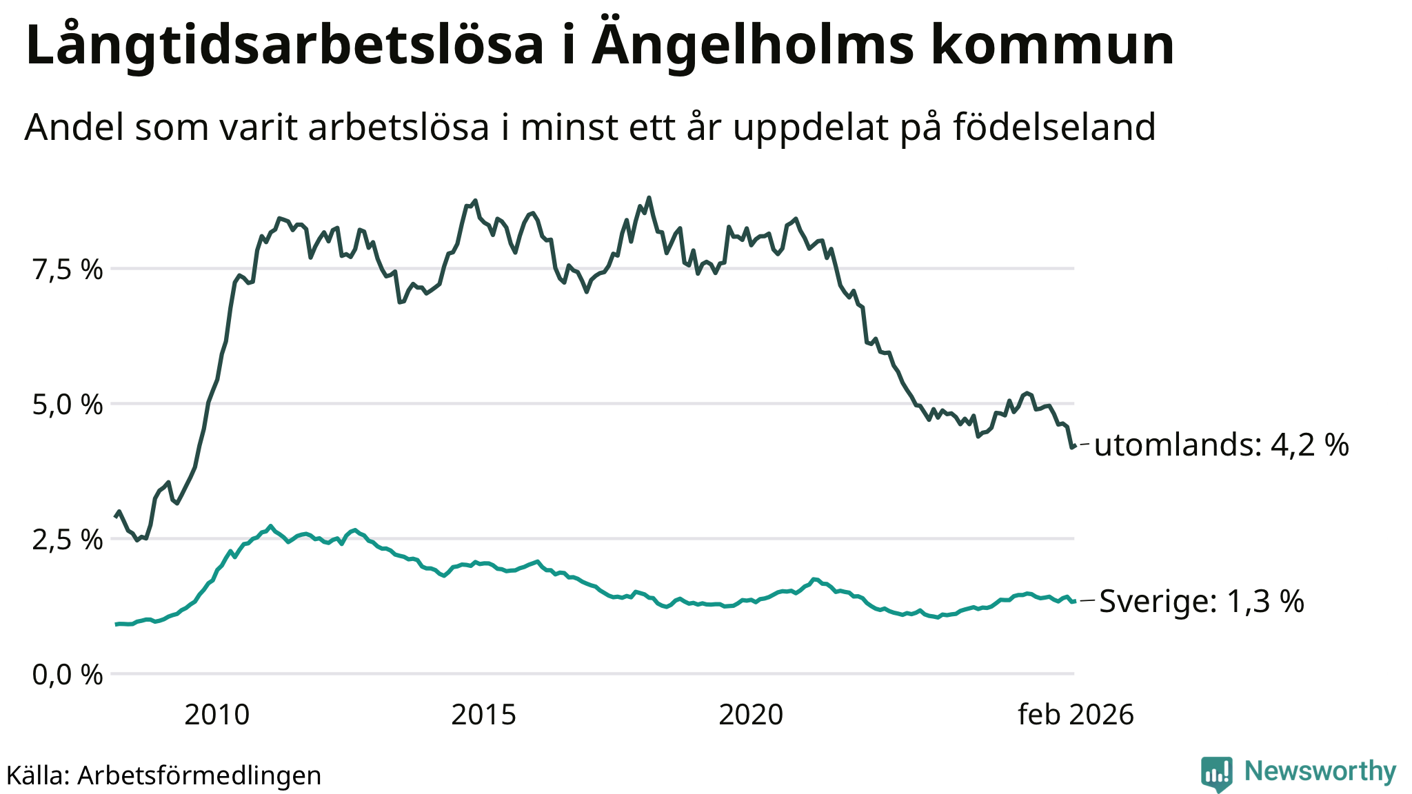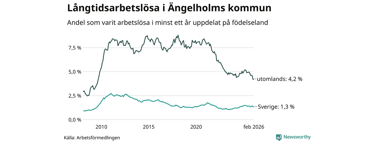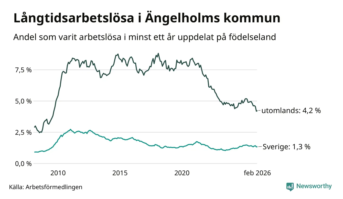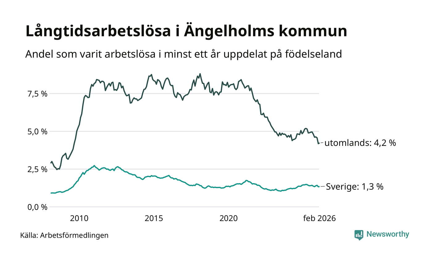 248 av de långtidsarbetslösa i Ängelholm är födda i Sverige, medan 157 är födda utomlands. Det innebär att långtidsarbetslösheten bland Sverigefödda är 1,3 procent, medan den är tre gånger så hög – 4,2 procent – bland födda utomlands. Även i riket som helhet är arbetslösheten högre bland utrikesfödda.