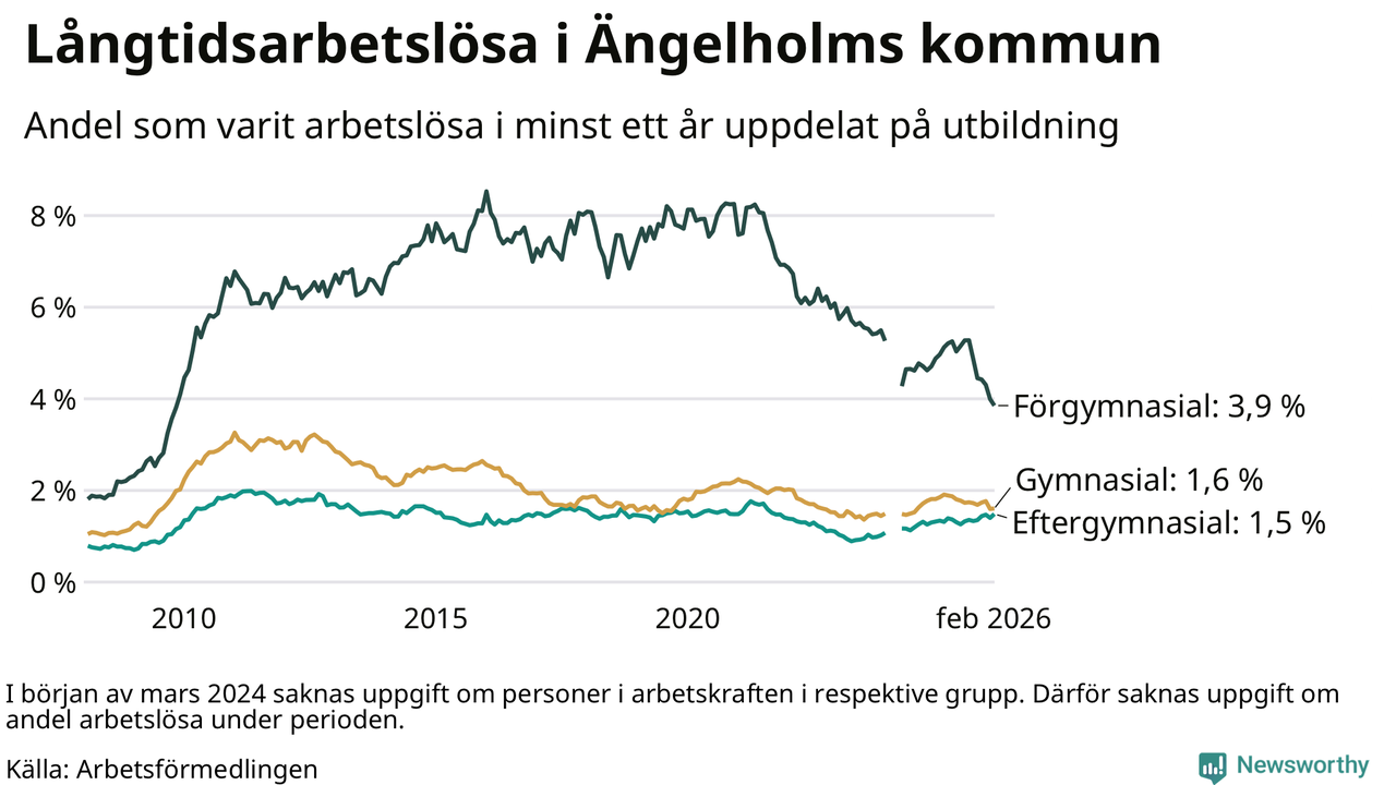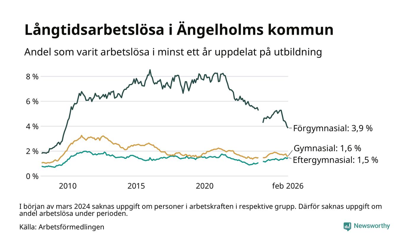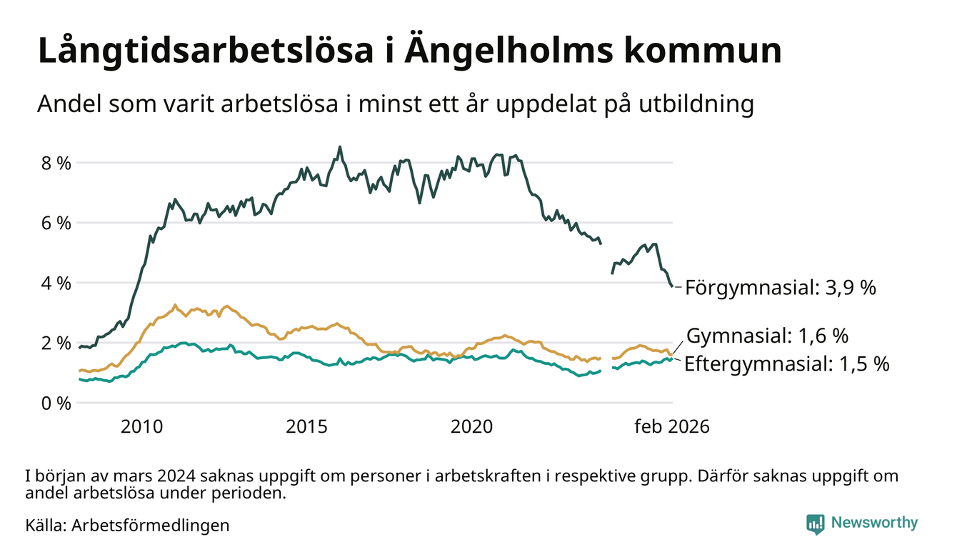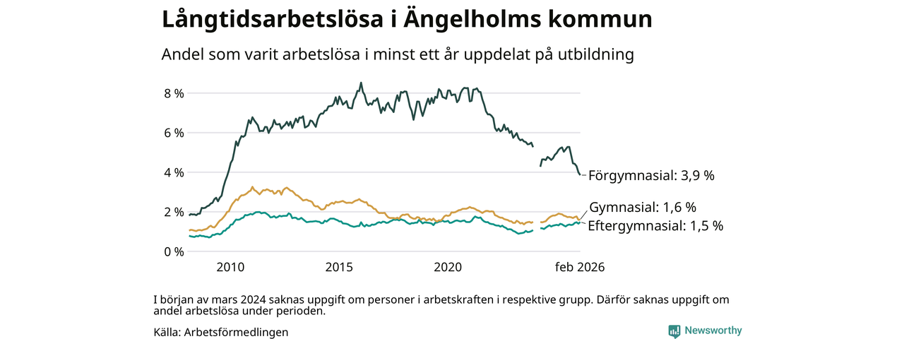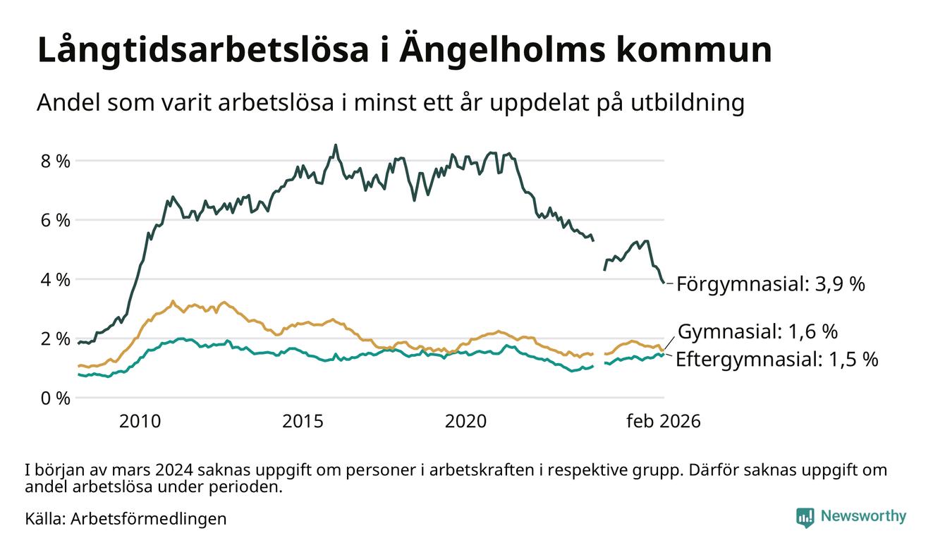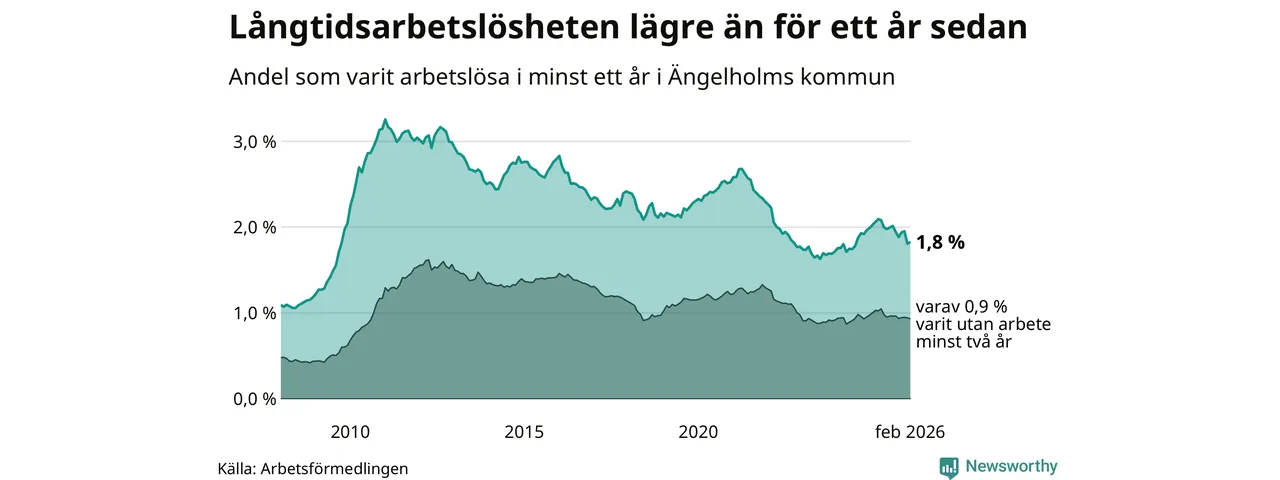 Andelen som varit utan arbete i minst ett år i Ängelholm i februari var lägre än för ett år sedan. Men jämfört med i januari har antalet långtidsarbetslösa ökat.