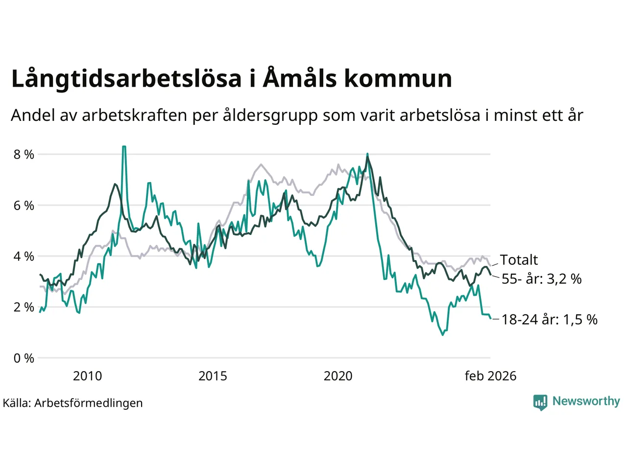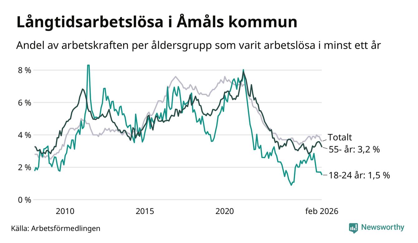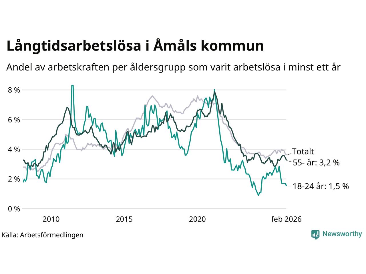 Av de 191 personerna som varit arbetslösa i mer än ett år i Åmåls kommun är 47 personer mellan 55 och 661 år och åtta är mellan 18 och 24 år. Som andel av arbetskraften innebär det att långtidsarbetslöheten är lägre i de båda grupperna än i arbetskraften totalt. I riket som helhet är andelen långtidsarbetslösa högre i den äldre gruppen.