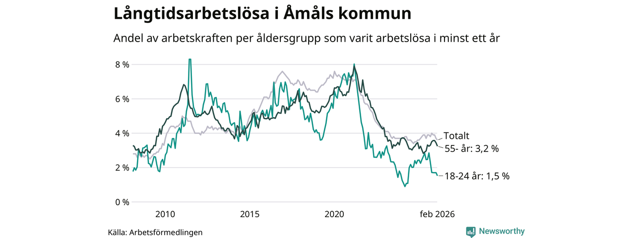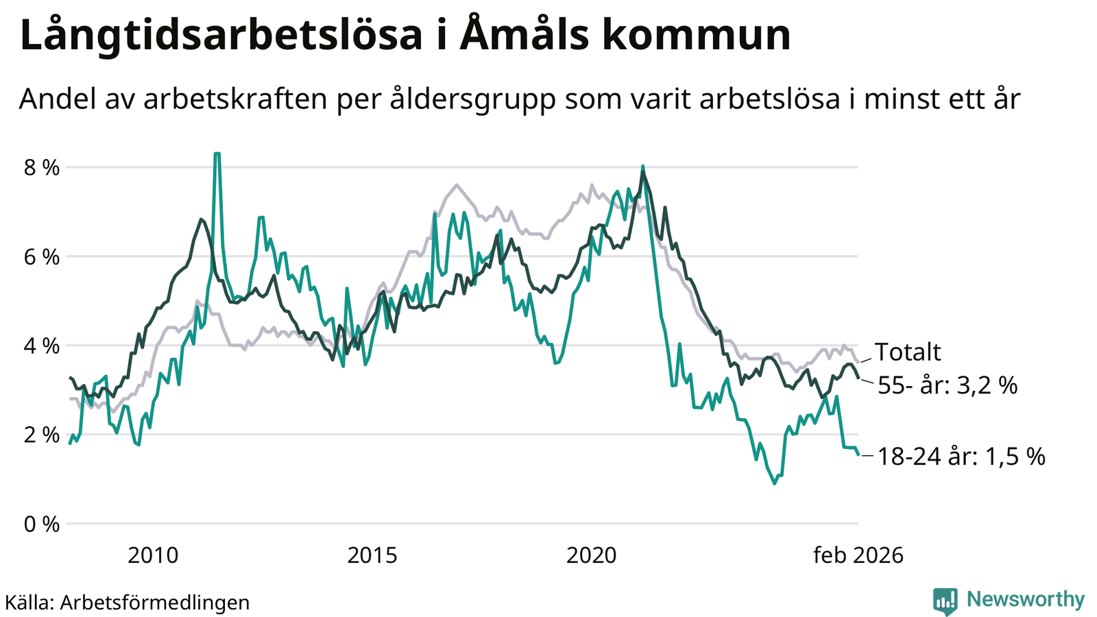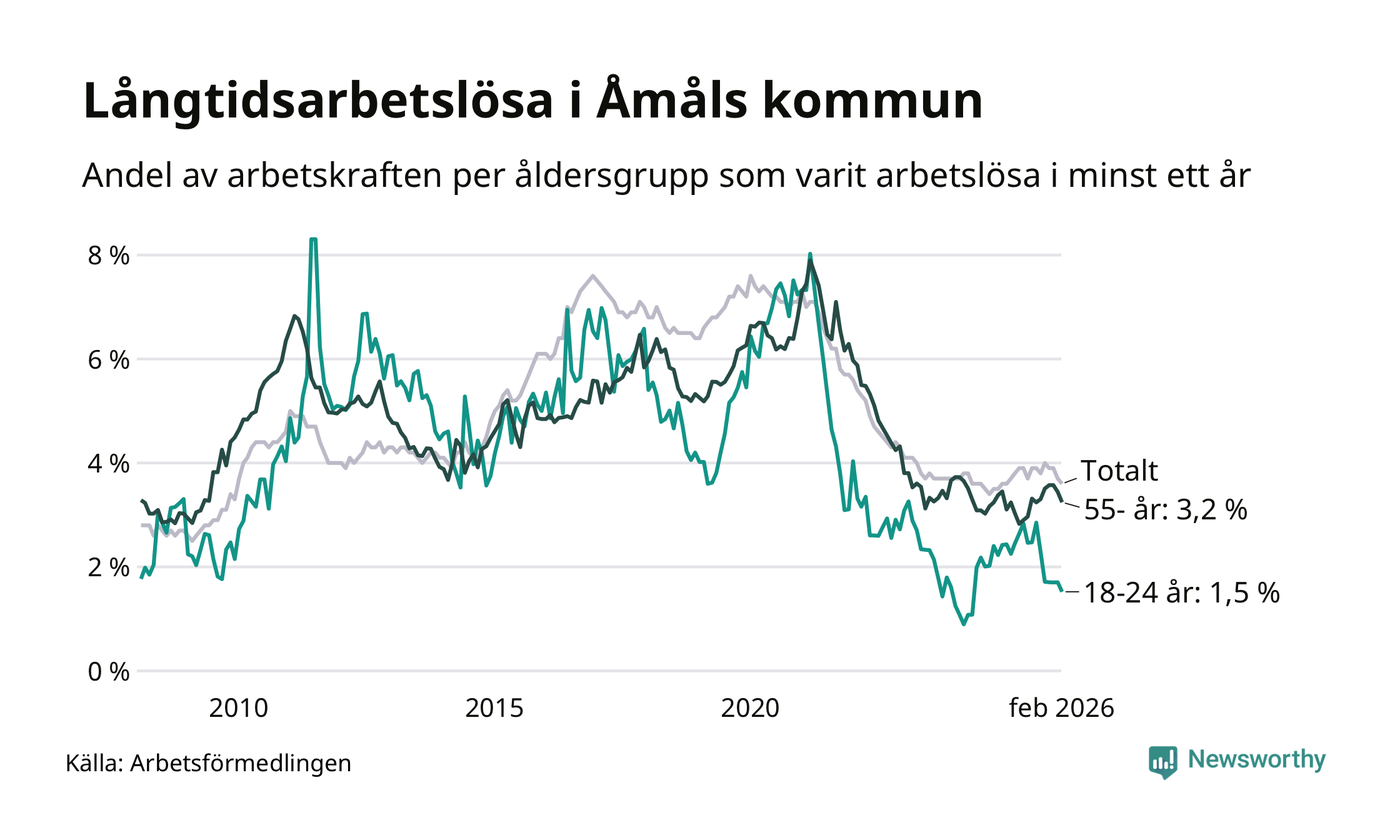 Av de 191 personerna som varit arbetslösa i mer än ett år i Åmåls kommun är 47 personer mellan 55 och 661 år och åtta är mellan 18 och 24 år. Som andel av arbetskraften innebär det att långtidsarbetslöheten är lägre i de båda grupperna än i arbetskraften totalt. I riket som helhet är andelen långtidsarbetslösa högre i den äldre gruppen.
