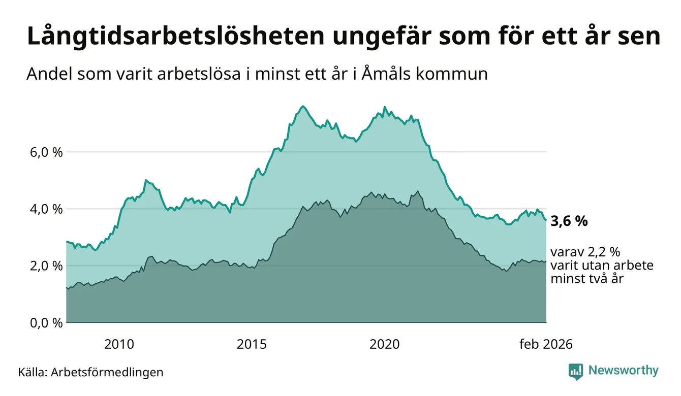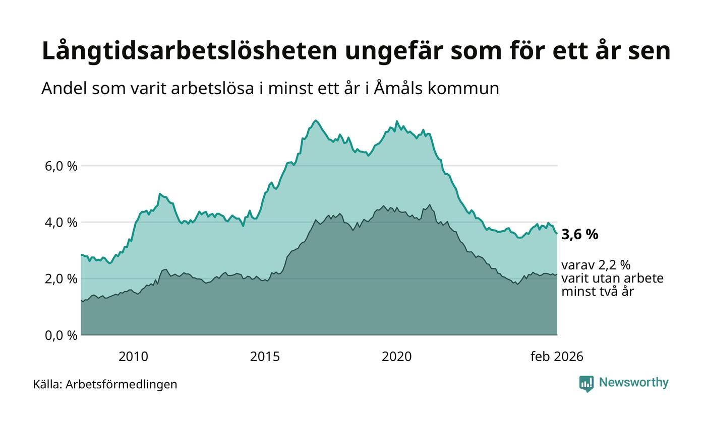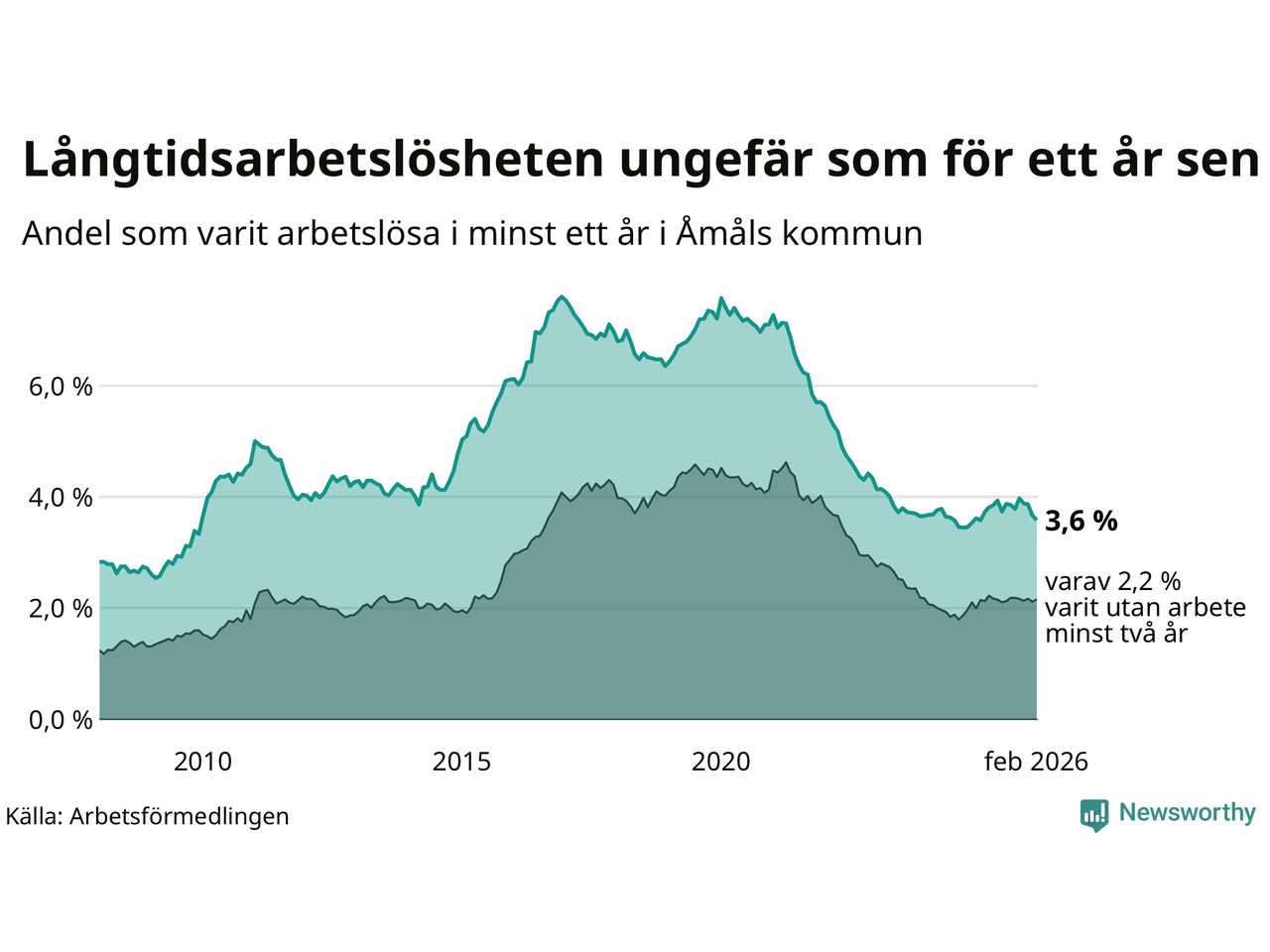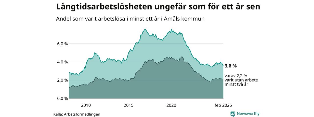 I februari hade 191 Åmålsbor varit arbetslösa i minst ett år, vilket är fem färre än månaden innan. Det är den fjärde månaden i rad med minskande antal långtidsarbetslösa. 191 personer motsvarar 3,6 procent av arbetskraften i kommunen – andelen långtidsarbetslösa är ungefär på samma nivå som för ett år sedan.