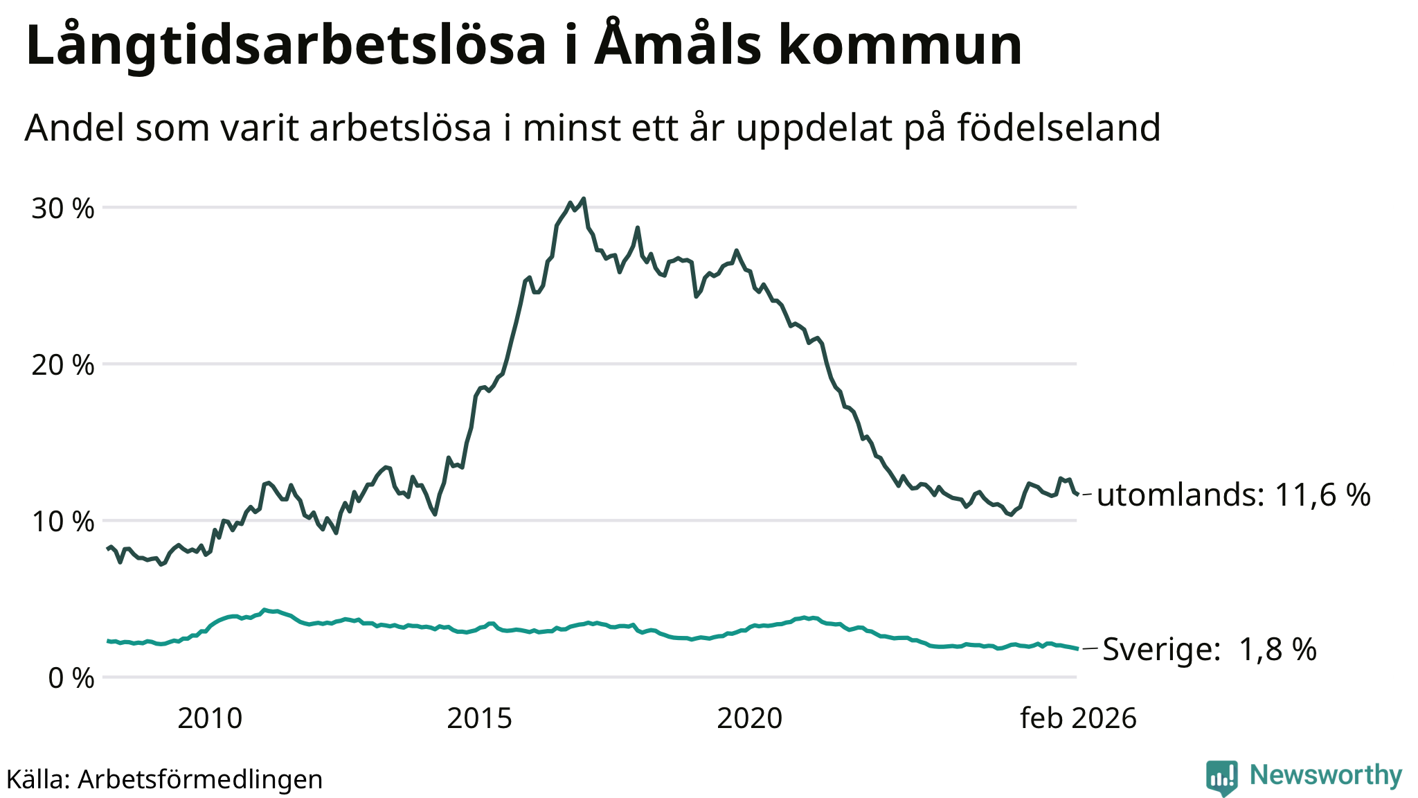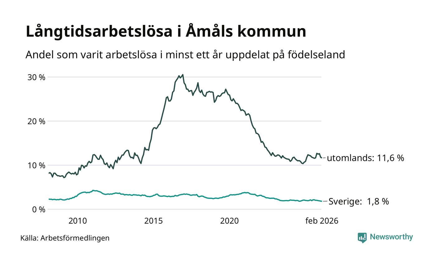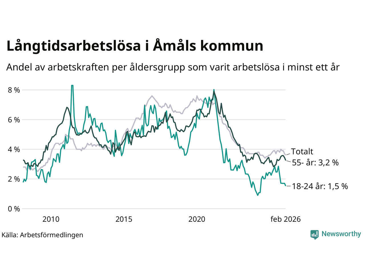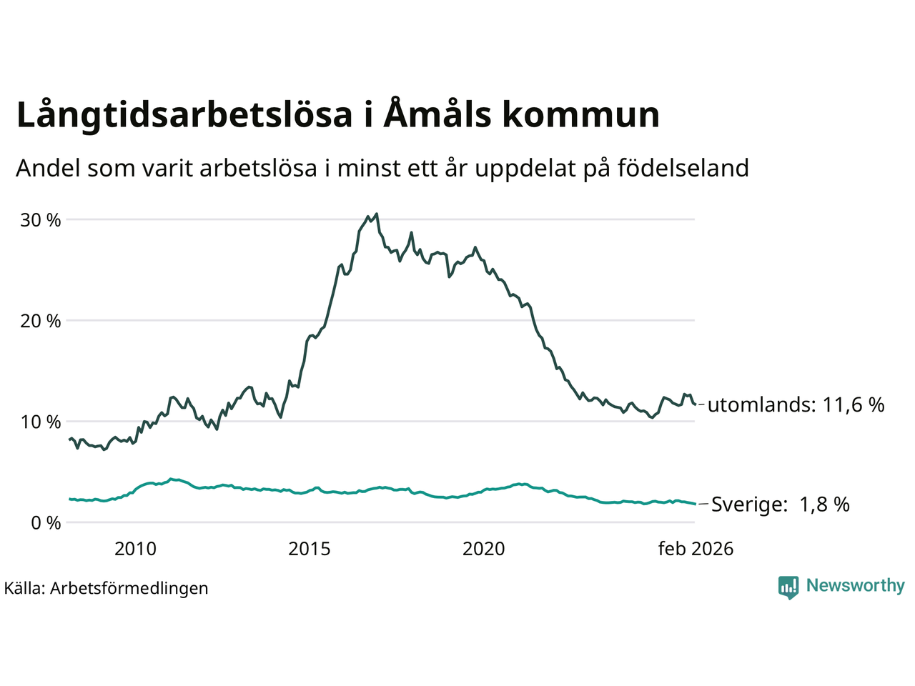I februari hade 191 Åmålsbor varit arbetslösa i minst ett år, vilket är fem färre än månaden innan. Det är den fjärde månaden i rad med minskande antal långtidsarbetslösa. 191 personer motsvarar 3,6 procent av arbetskraften i kommunen – andelen långtidsarbetslösa är ungefär på samma nivå som för ett år sedan.