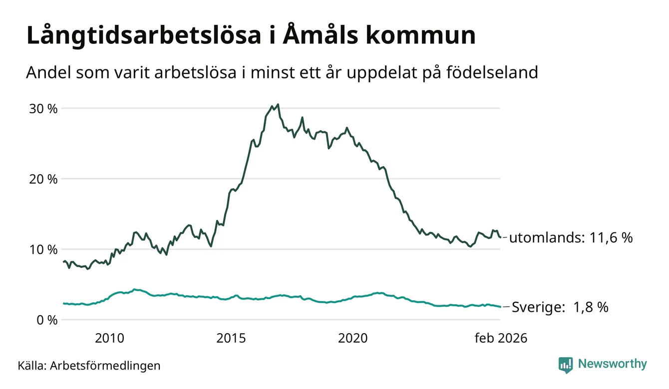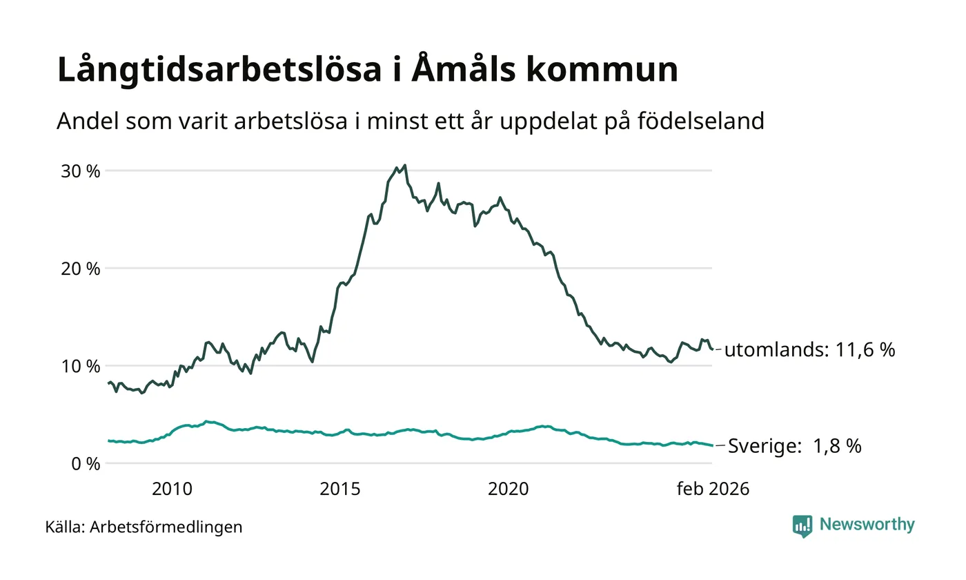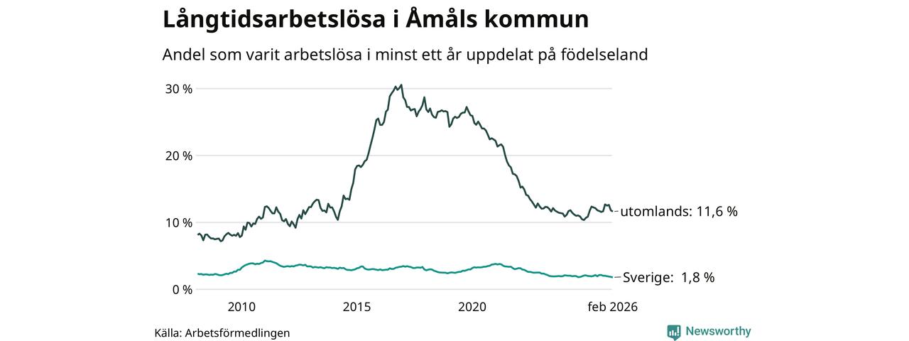 78 av de långtidsarbetslösa i Åmål är födda i Sverige, medan 113 är födda utomlands. Det innebär att långtidsarbetslösheten bland Sverigefödda är 1,8 procent, medan den är sex gånger så hög – 11,6 procent – bland födda utomlands. Även i riket som helhet är arbetslösheten högre bland utrikesfödda.