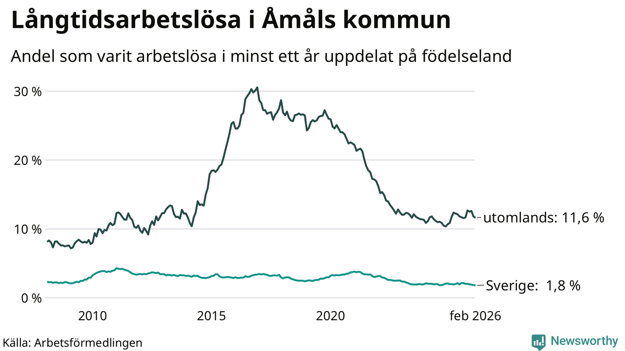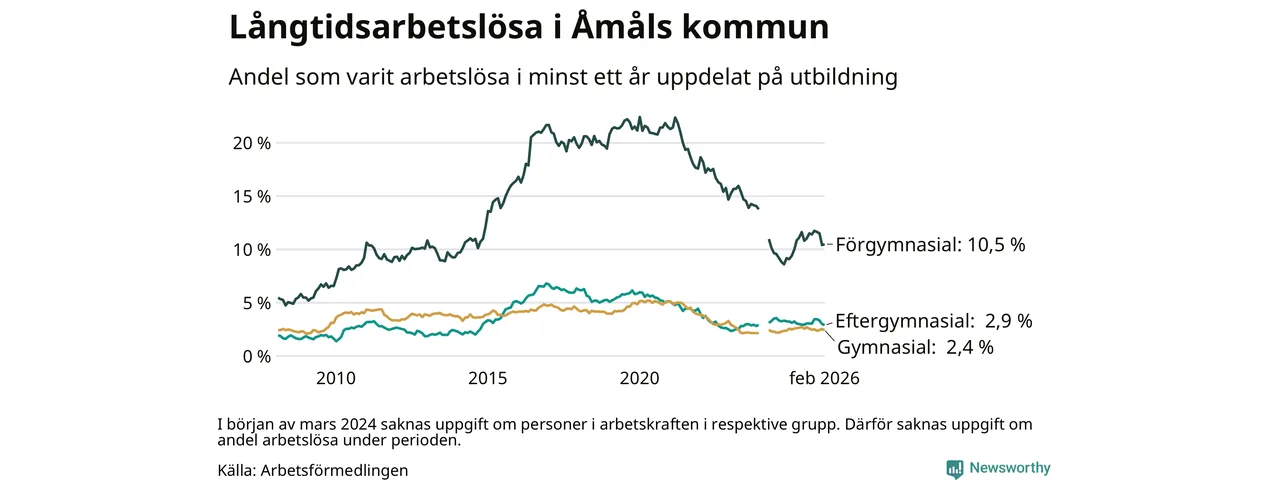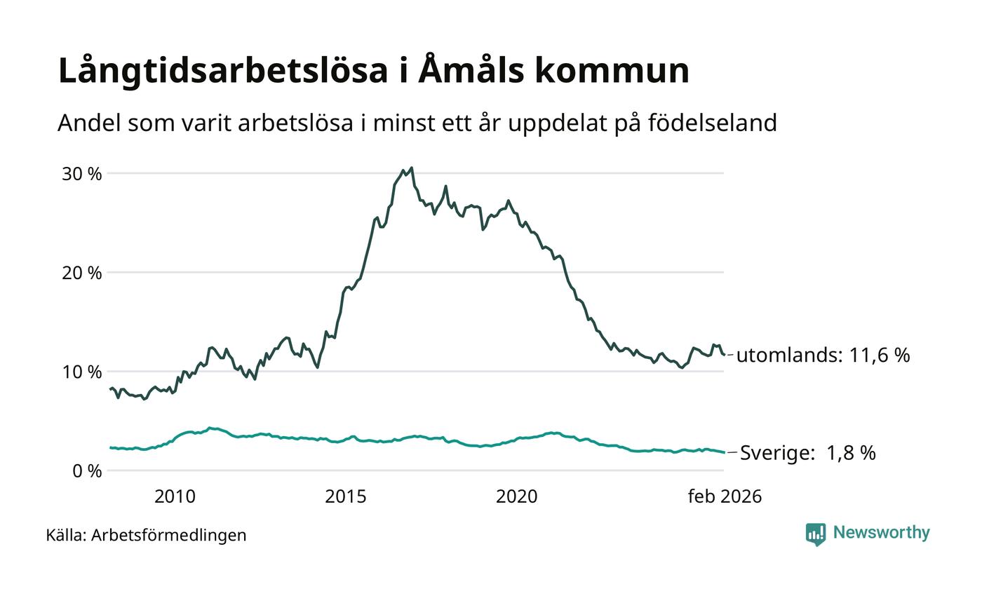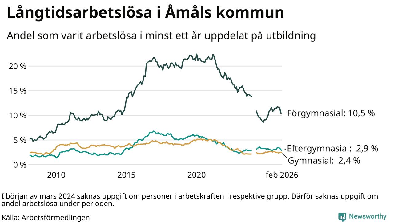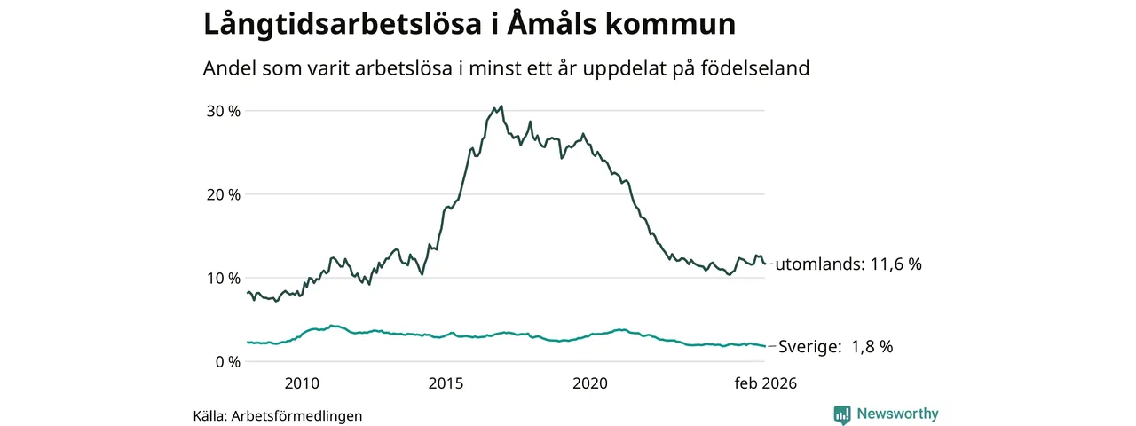 Graf: Andel arbetslösa i Åmål som varit utan arbete i minst 12 månader