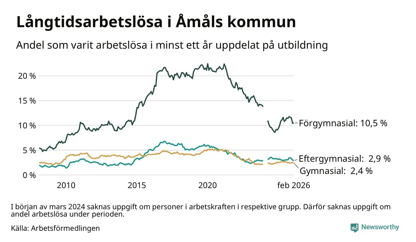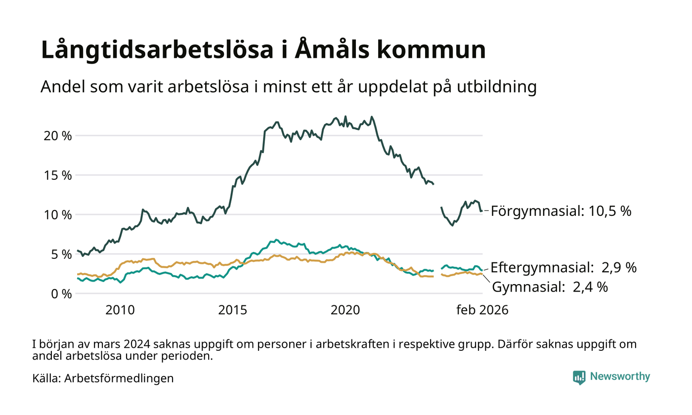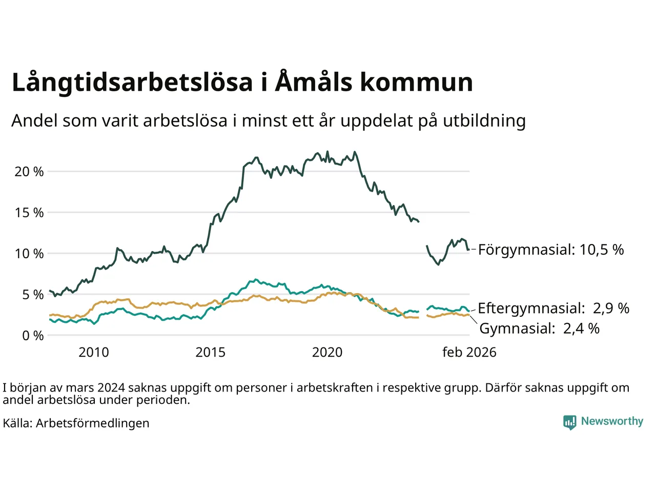 Graf: Andel arbetslösa i Åmål som varit utan arbete i minst 12 månader