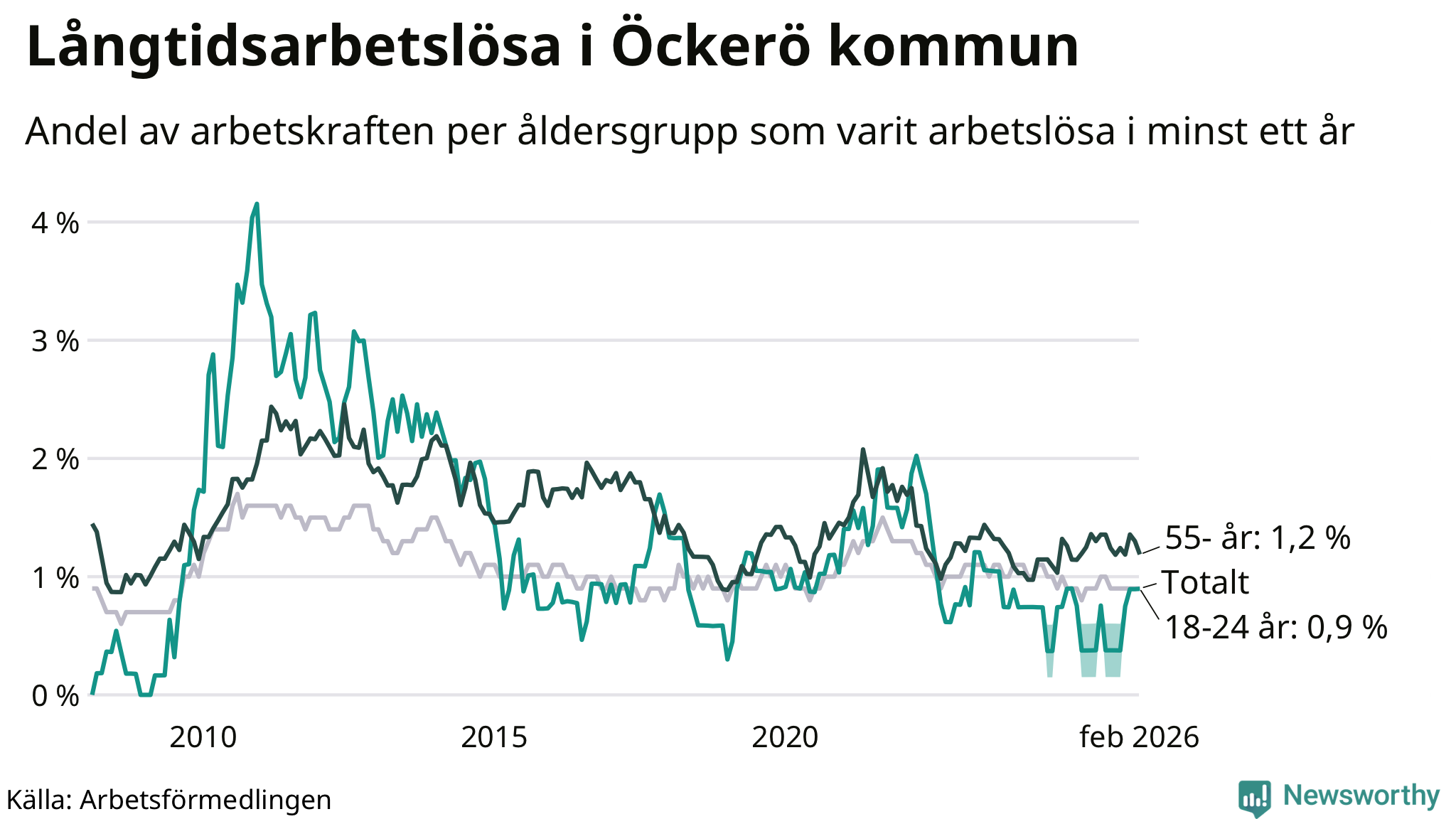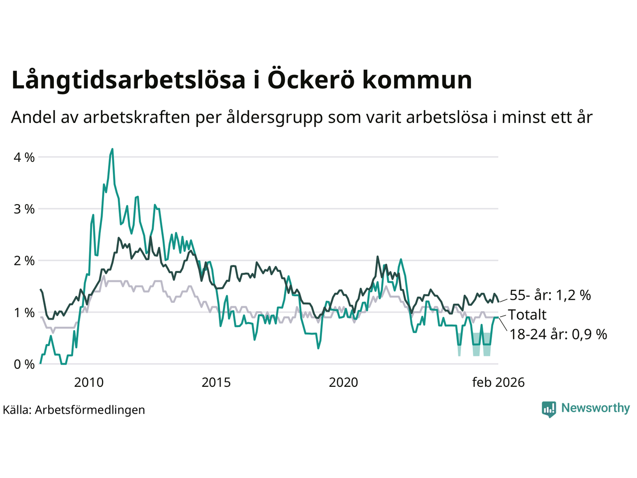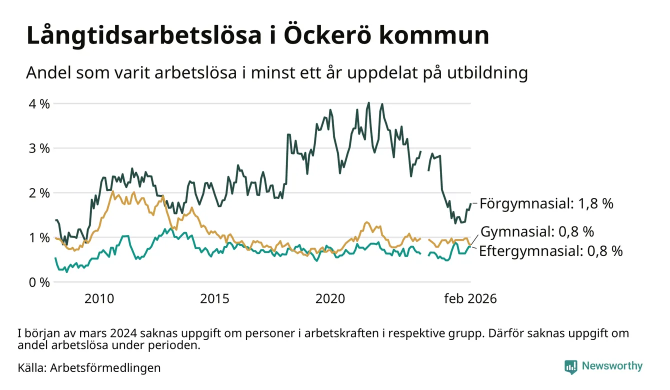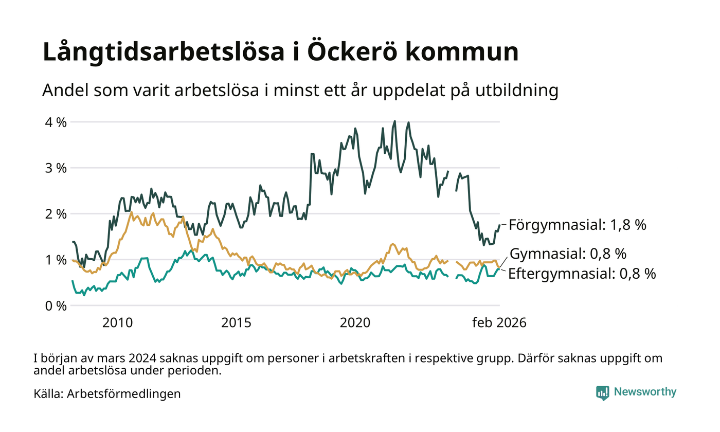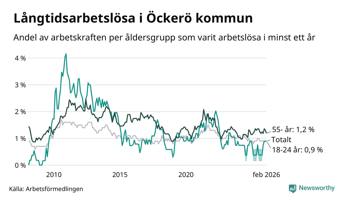 | Andel arbetslösa i minst två år | 0,4 % | 1,3 % | 1,6 % |