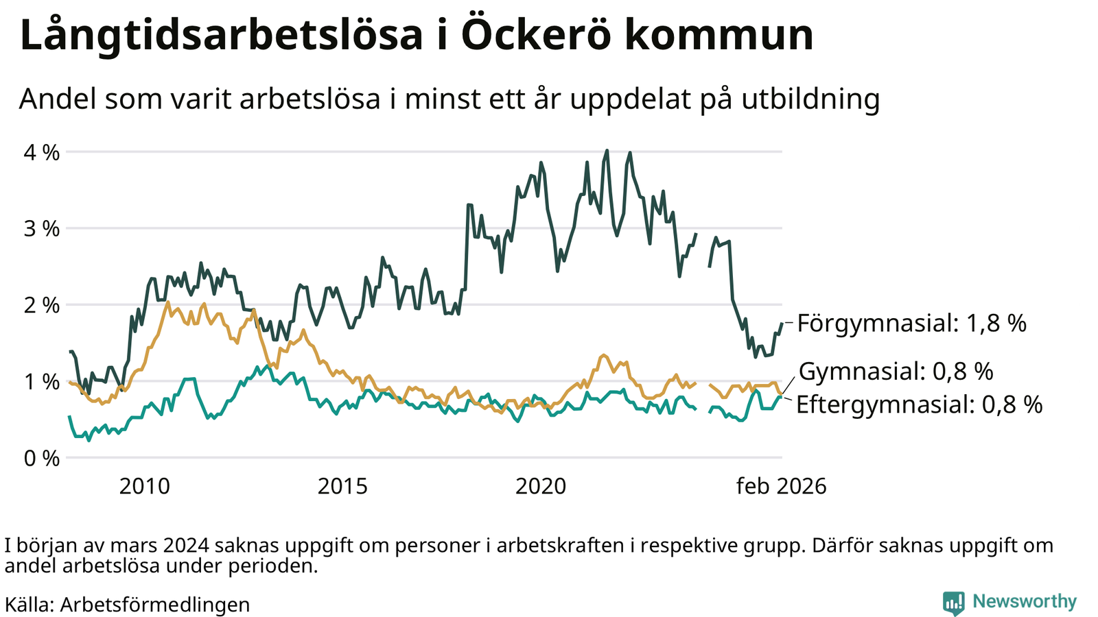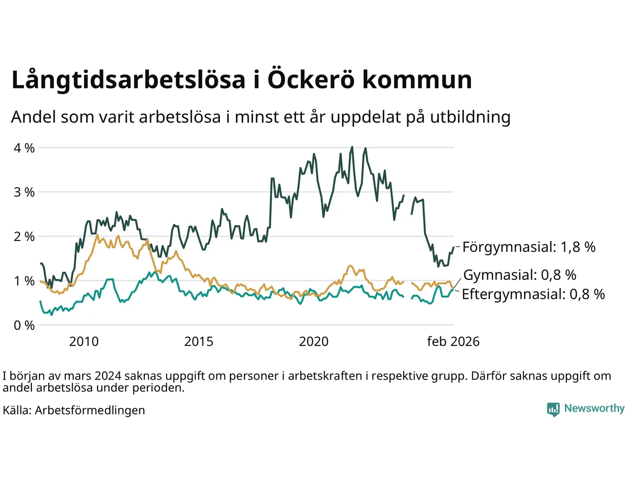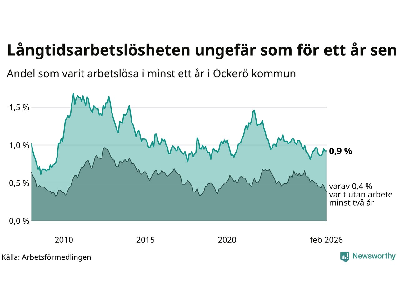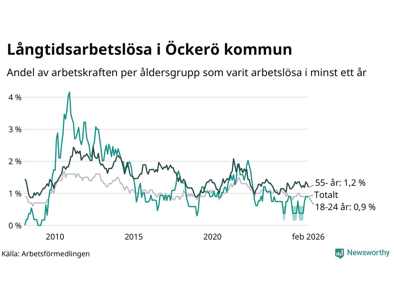 | Andel arbetslösa i minst två år | 0,4 % | 1,3 % | 1,6 % |