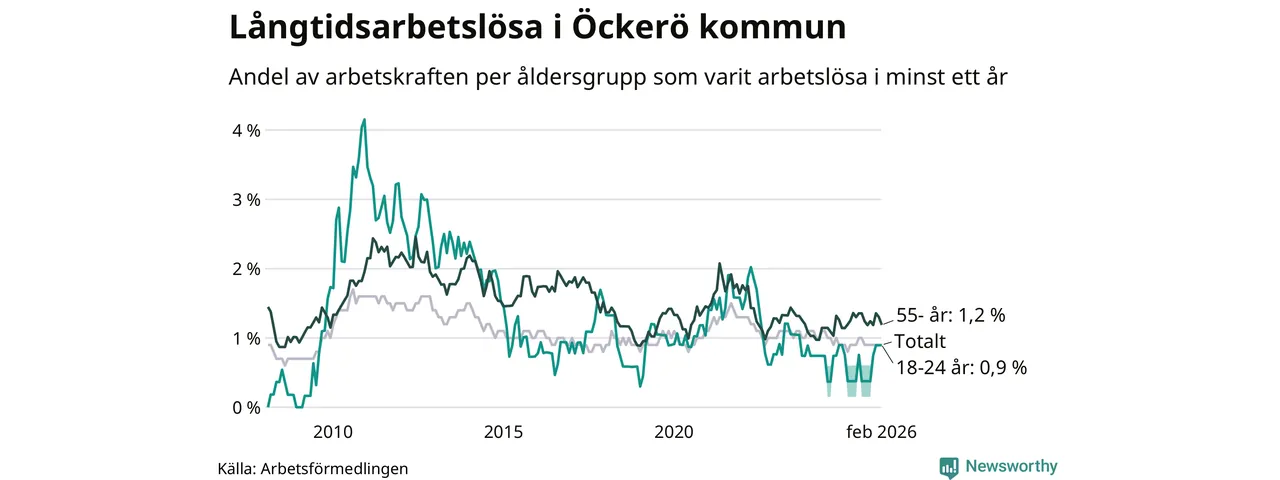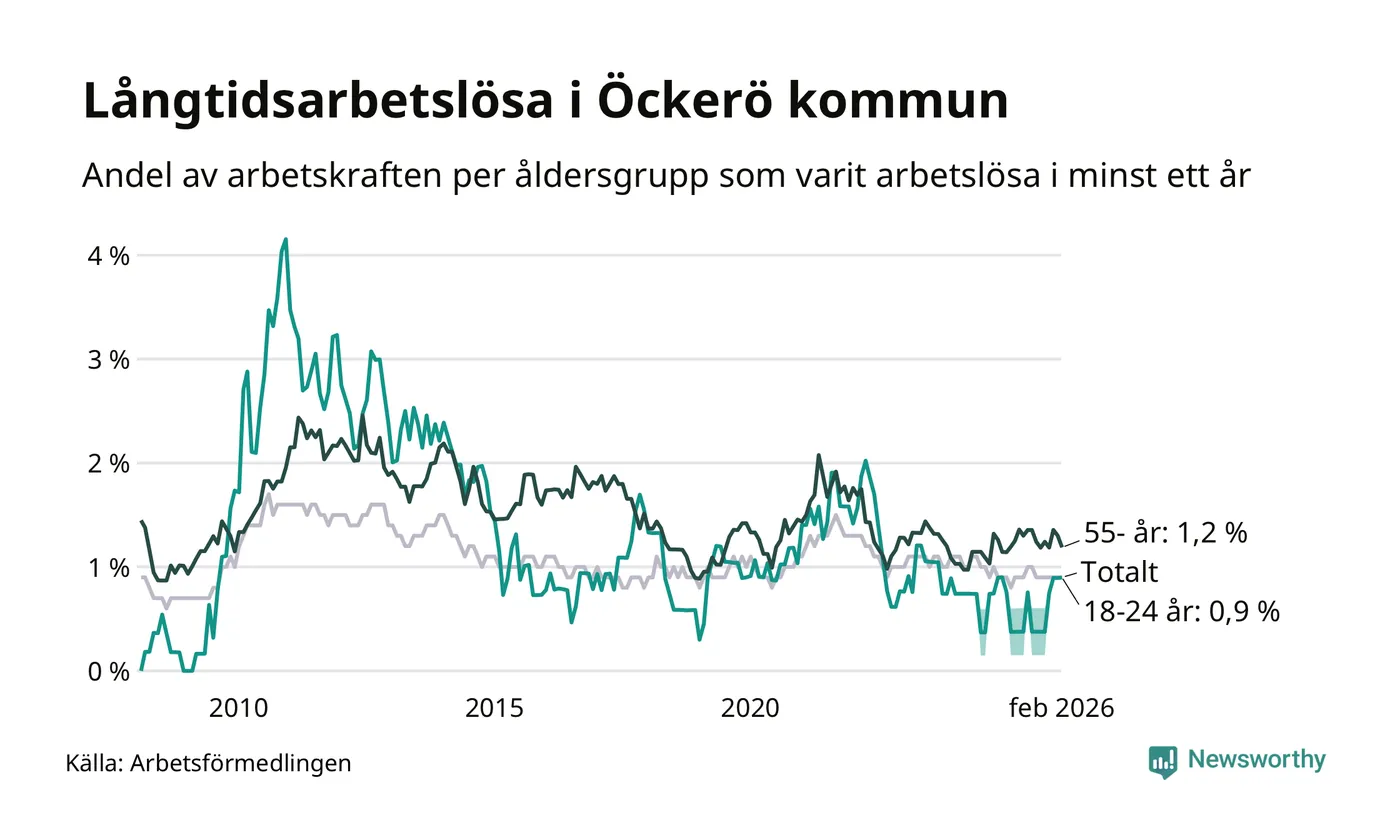 Av de 56 personerna som varit arbetslösa i mer än ett år i Öckerö kommun är 21 personer mellan 55 och 661 år och sex är mellan 18 och 24 år. För den äldre gruppen är andelen arbetslösa 1,2 procent medan den i den yngre gruppen är 0,9 procent. Även i riket som helhet är långtidsarbetslösheten högre i gruppen äldre.