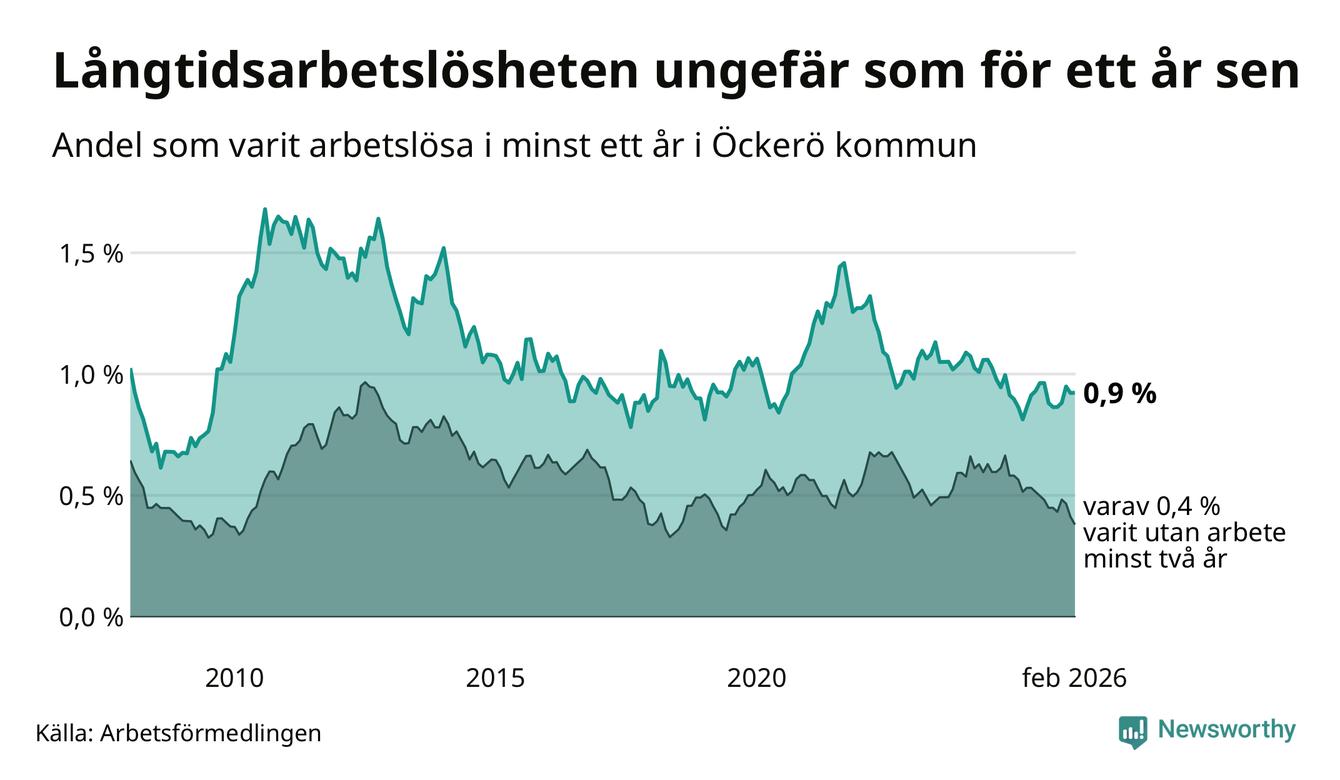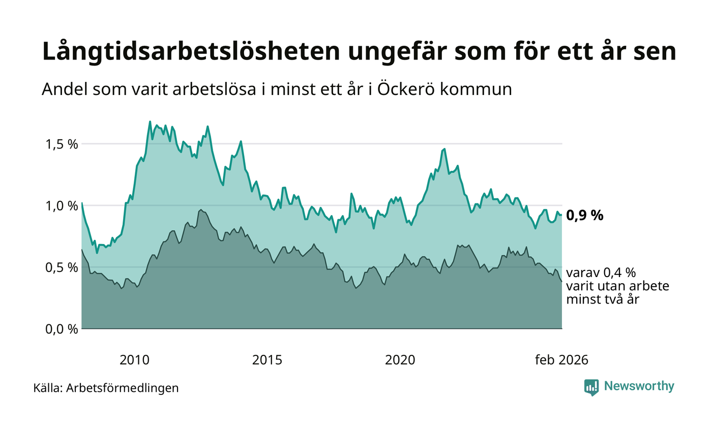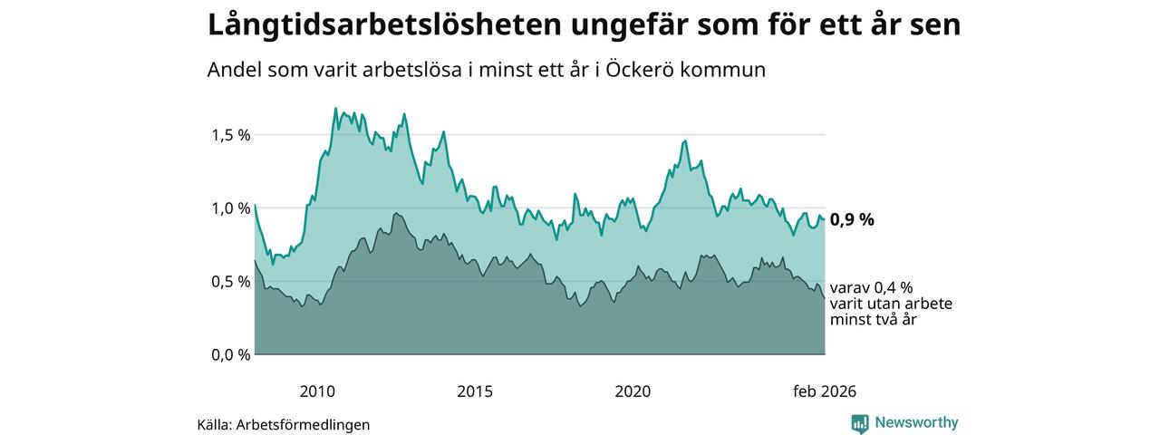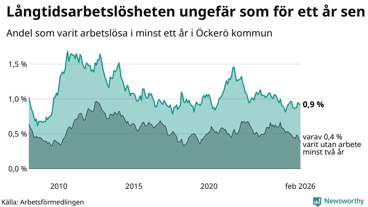 Andelen som varit utan arbete i minst ett år på Öckerö var ungefär lika stor i februari jämfört med samma månad för ett år sedan. Det visar Arbetsfömedlingens senaste månadsstatistik.