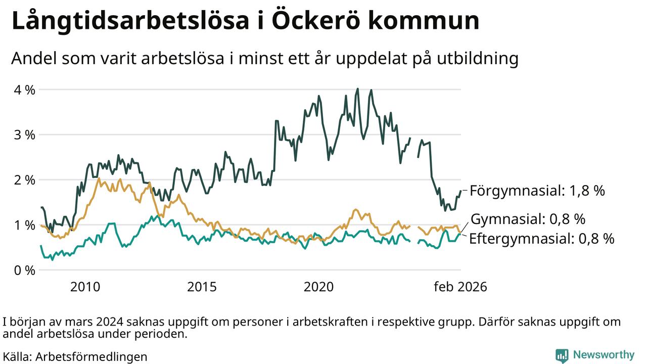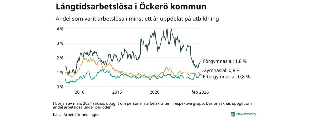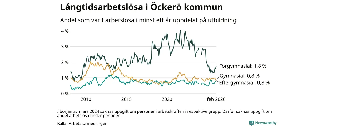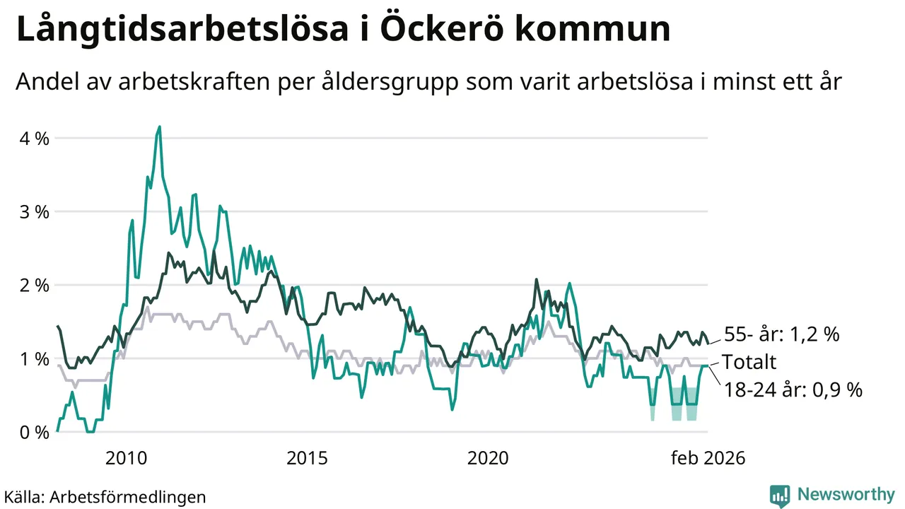 Andelen som varit utan arbete i minst ett år på Öckerö var ungefär lika stor i februari jämfört med samma månad för ett år sedan. Det visar Arbetsfömedlingens senaste månadsstatistik.