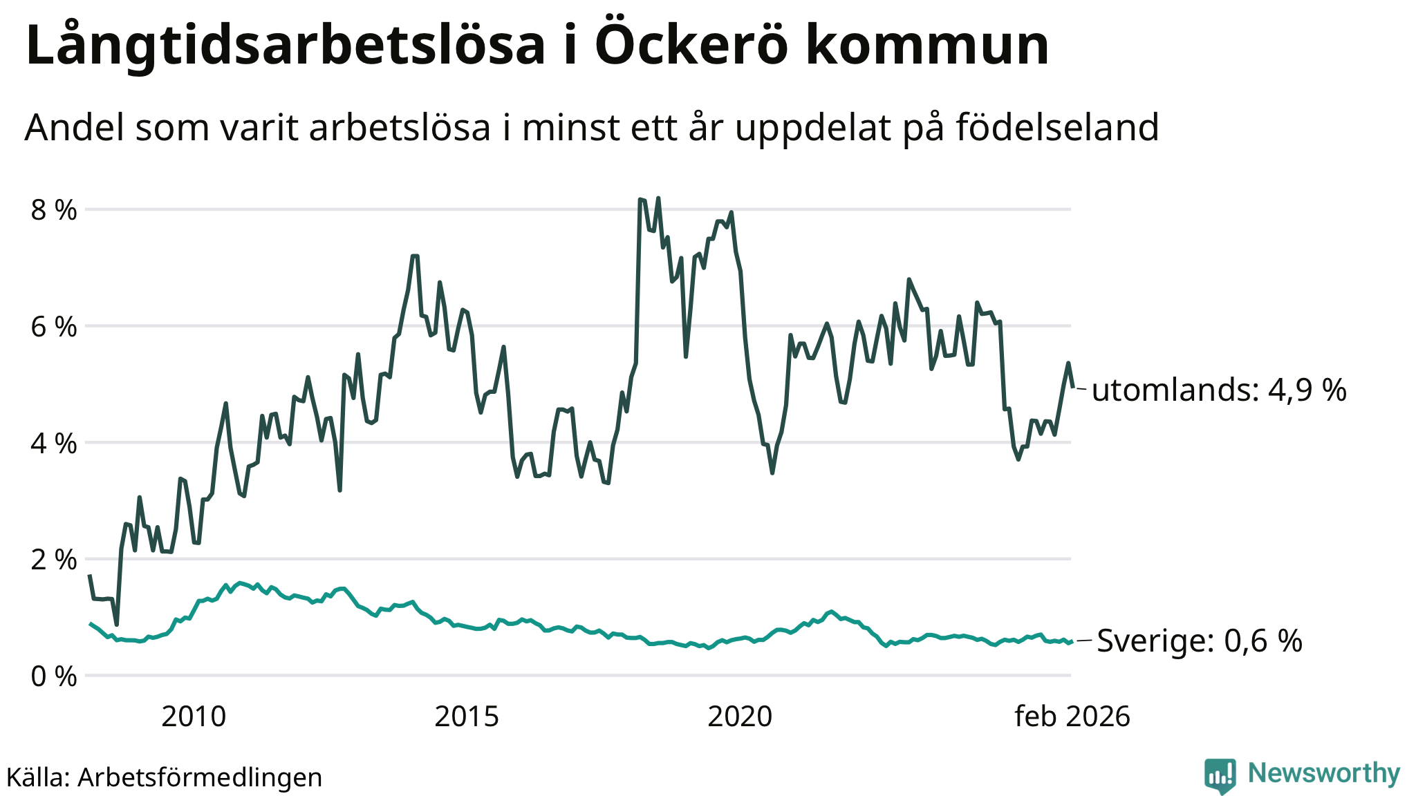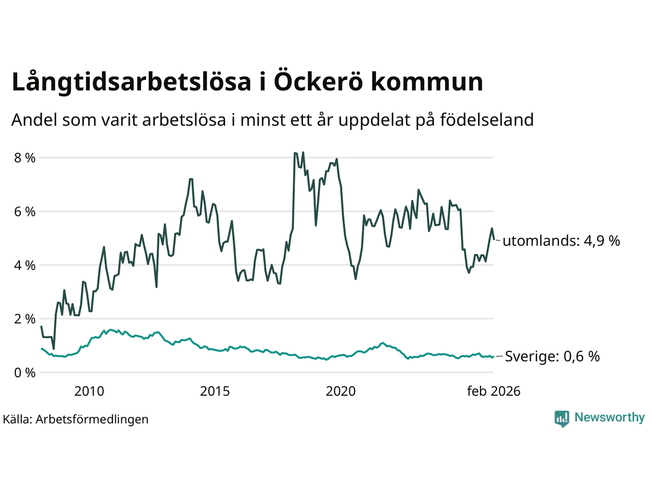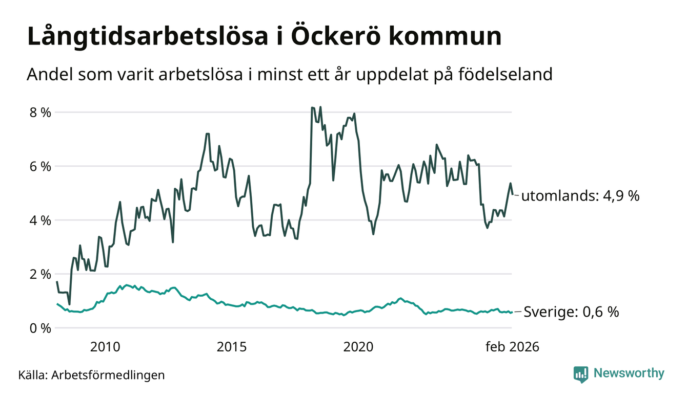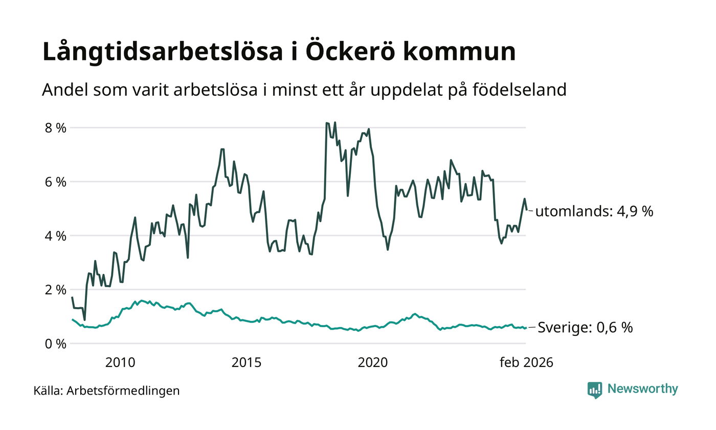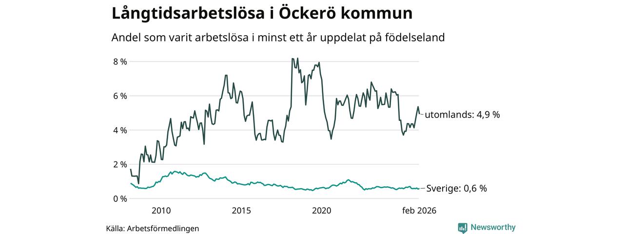 33 av de långtidsarbetslösa på Öckerö är födda i Sverige, medan 23 är födda utomlands. Det innebär att långtidsarbetslösheten bland Sverigefödda är 0,6 procent, medan den är åtta gånger så hög – 4,9 procent – bland födda utomlands. Även i riket som helhet är arbetslösheten högre bland utrikesfödda.