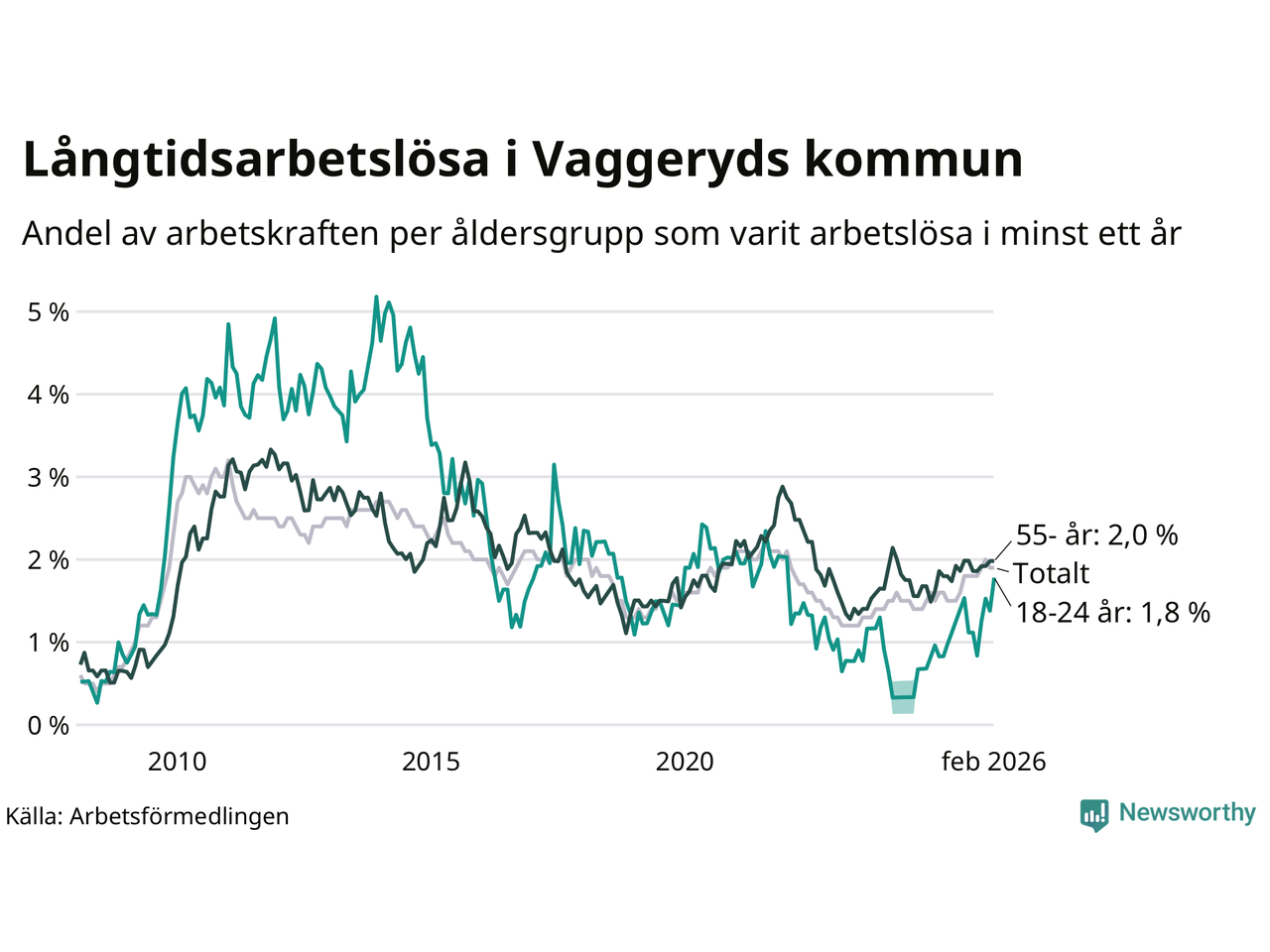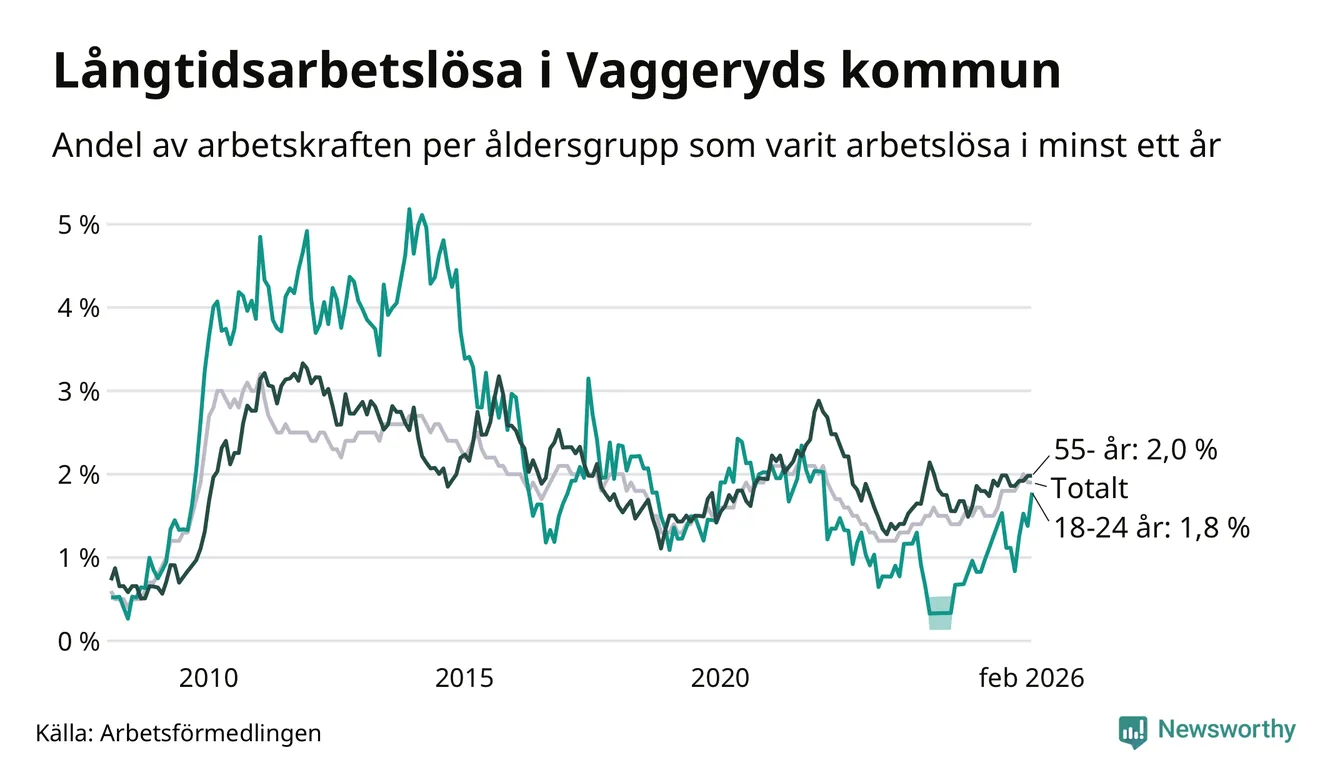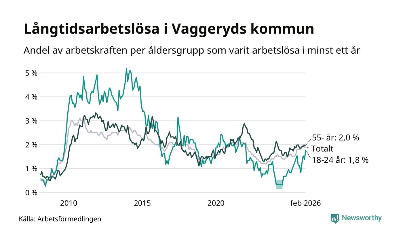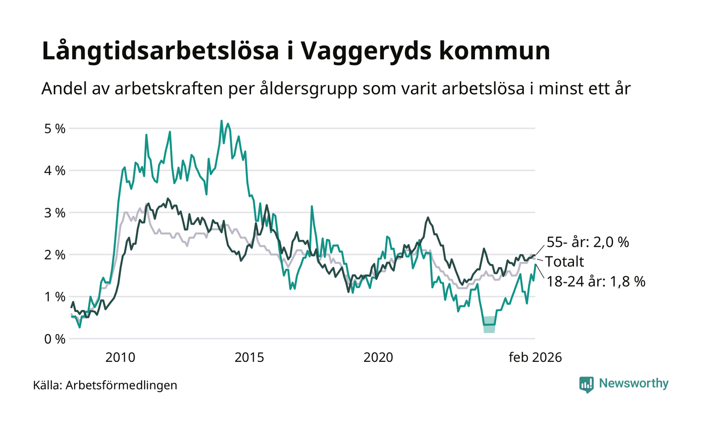 Av de 145 personerna som varit arbetslösa i mer än ett år i Vaggeryds kommun är 32 personer mellan 55 och 661 år och 13 är mellan 18 och 24 år. För den äldre gruppen är andelen arbetslösa 2,0 procent medan den i den yngre gruppen är 1,8 procent. Även i riket som helhet är långtidsarbetslösheten högre i gruppen äldre.