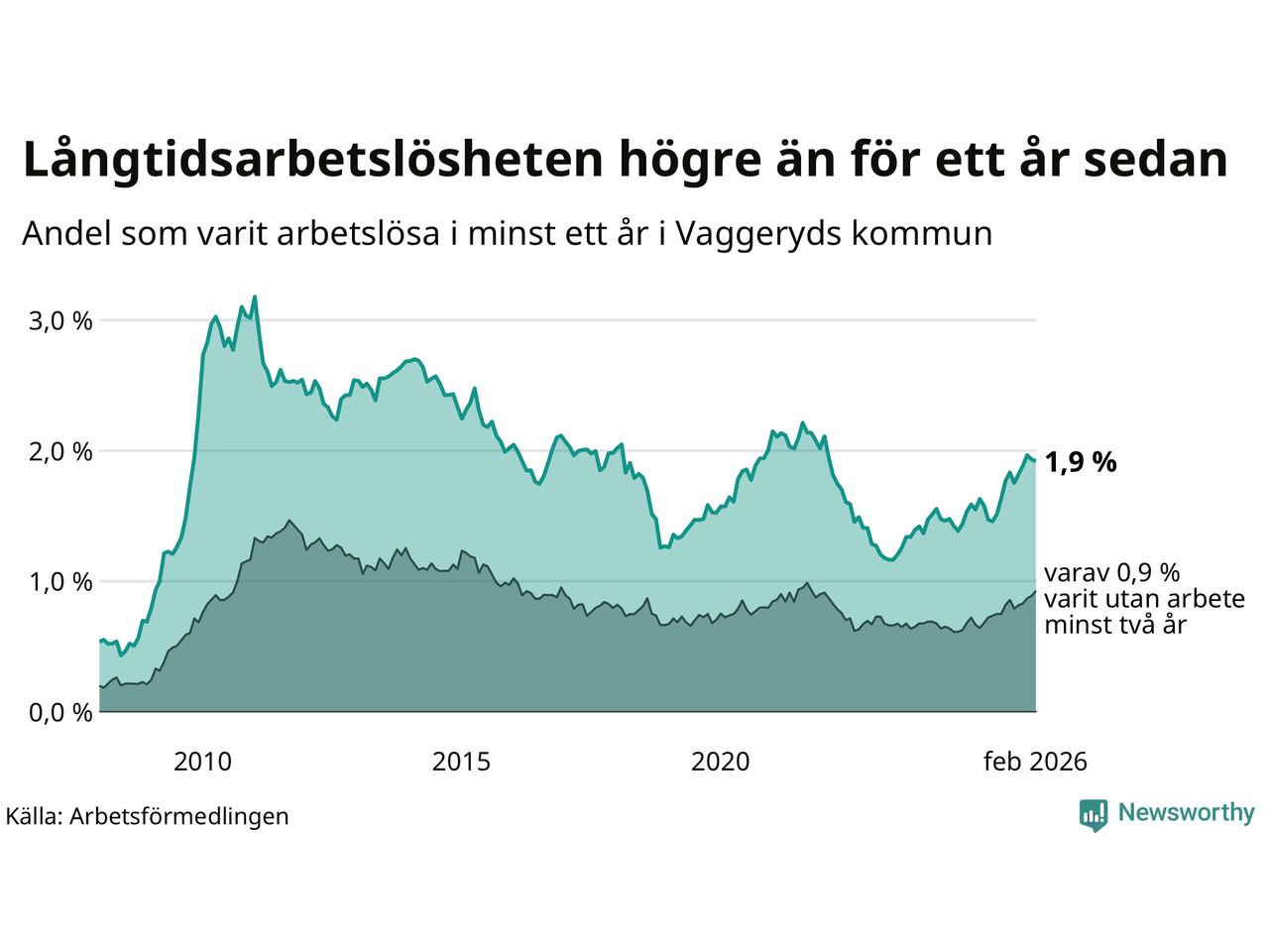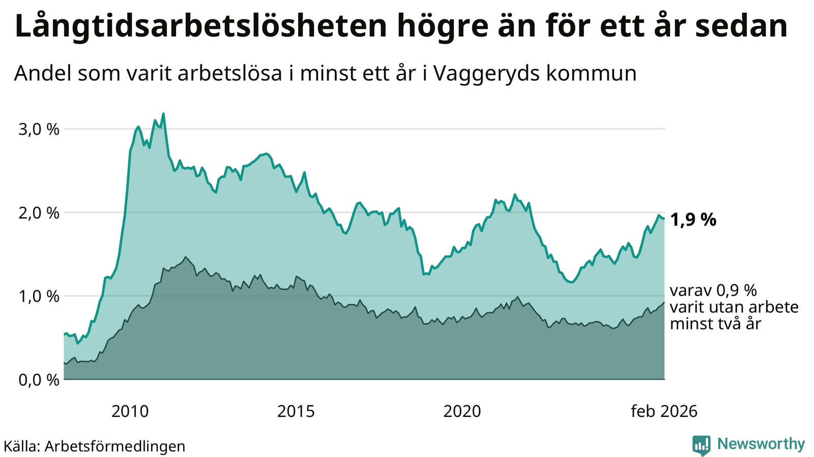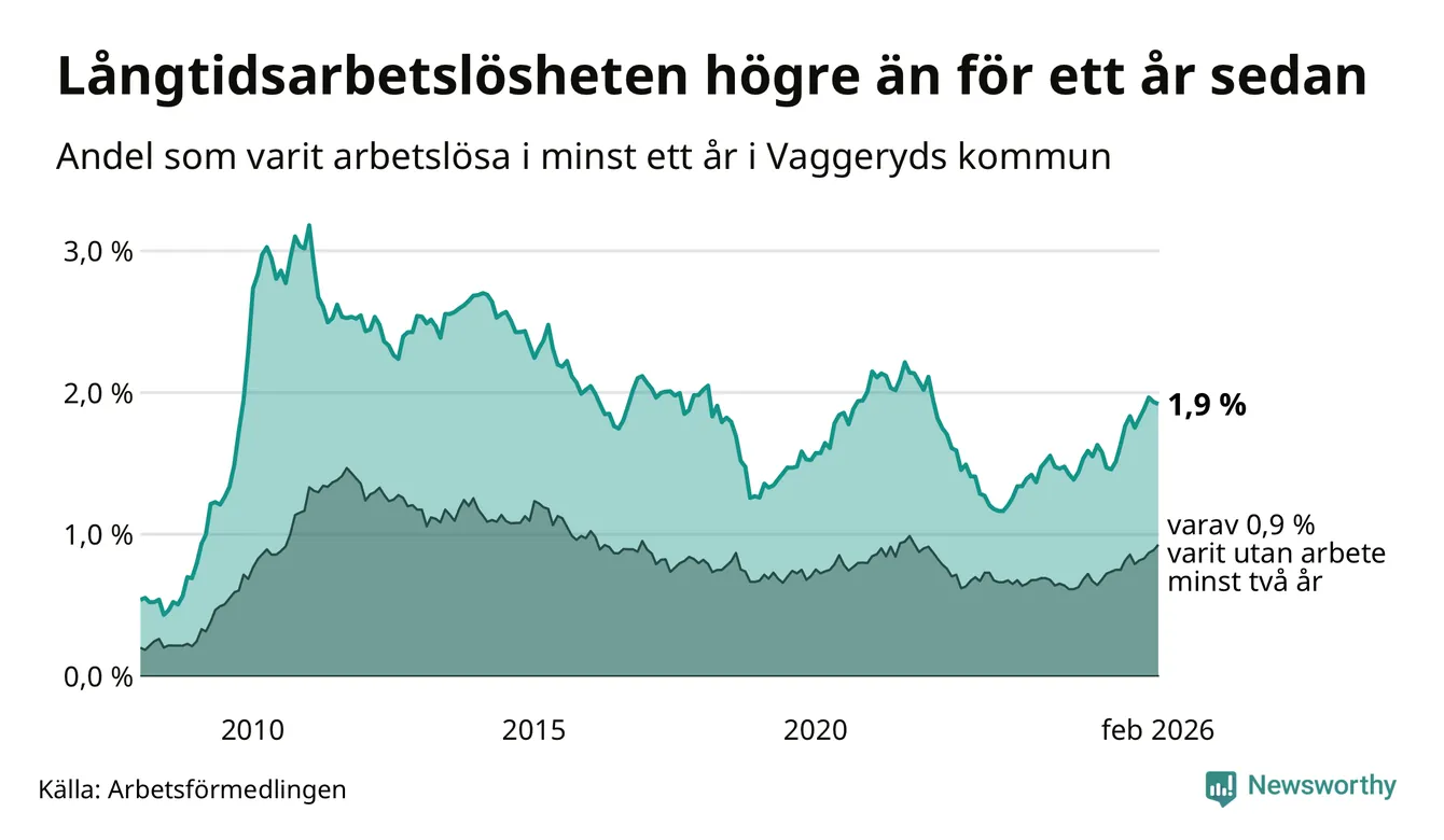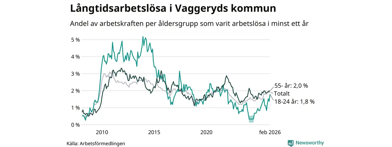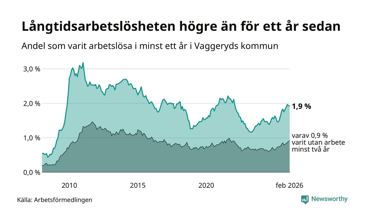 I februari hade 145 Vaggerydsbor varit arbetslösa i minst ett år, vilket är en färre än månaden innan. 145 personer motsvarar 1,9 procent av arbetskraften i kommunen – andelen långtidsarbetslösa är 0,3 procentenheter högre än samma månad för ett år sedan.