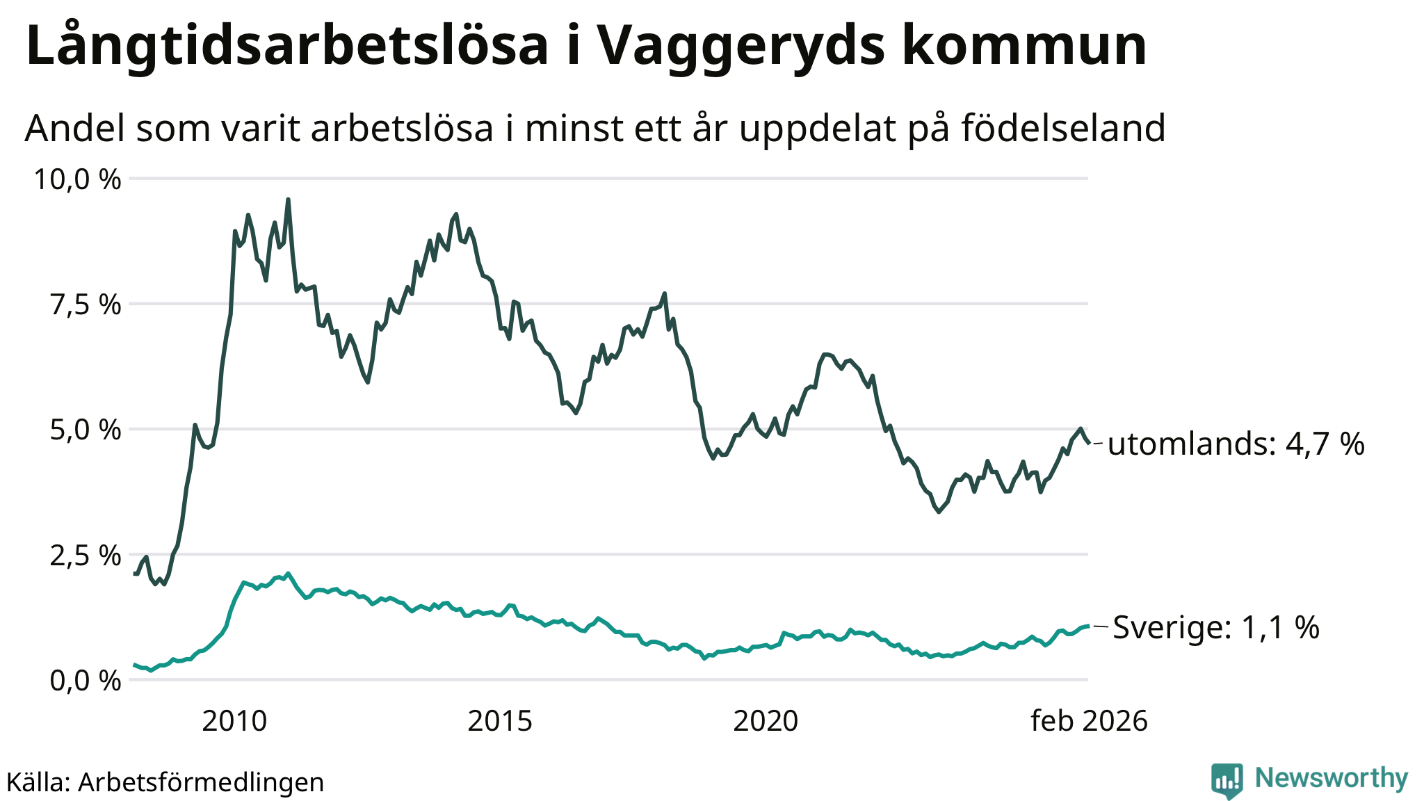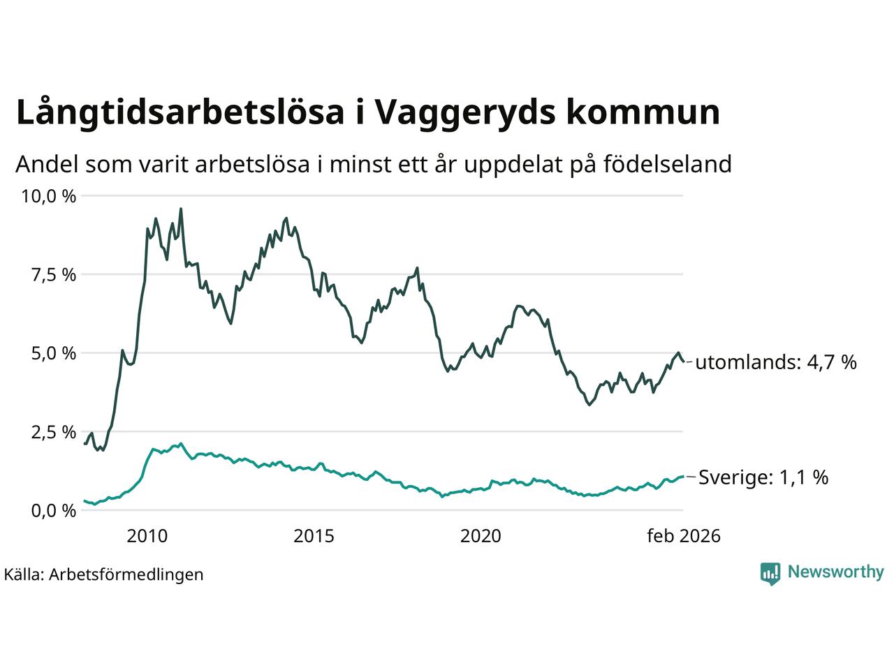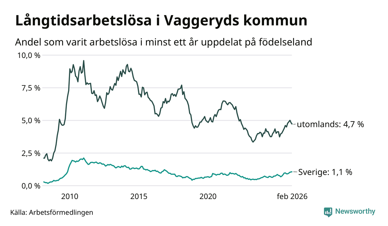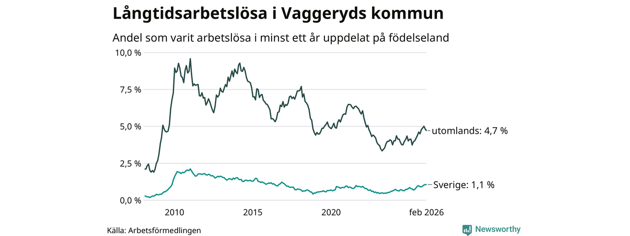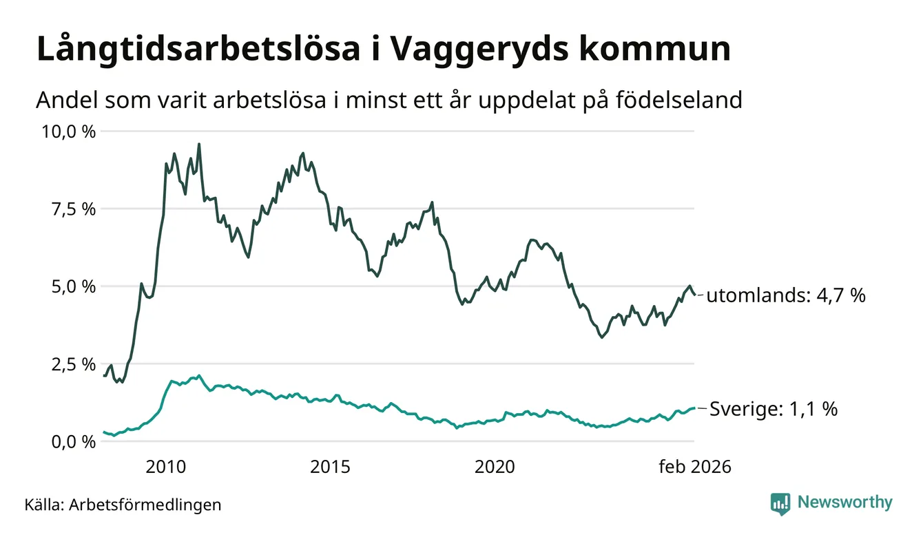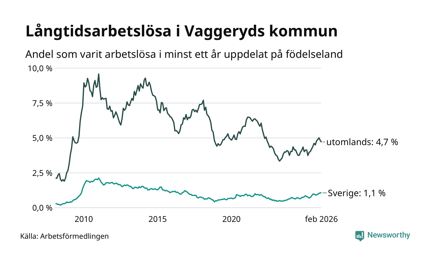 62 av de långtidsarbetslösa i Vaggeryd är födda i Sverige, medan 83 är födda utomlands. Det innebär att långtidsarbetslösheten bland Sverigefödda är 1,1 procent, medan den är fyra gånger så hög – 4,7 procent – bland födda utomlands. Även i riket som helhet är arbetslösheten högre bland utrikesfödda.