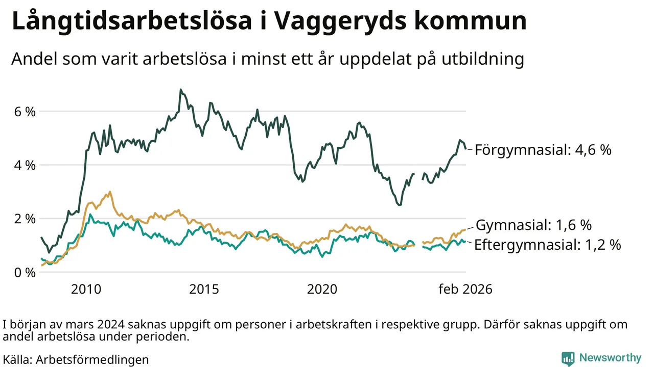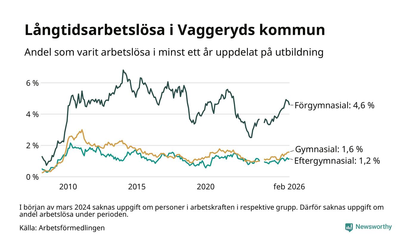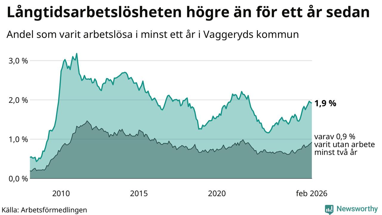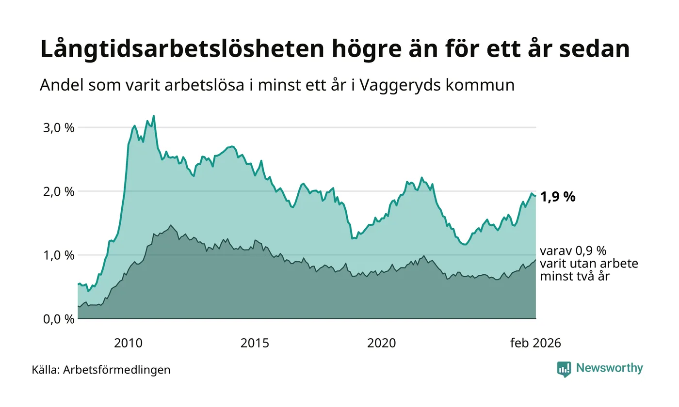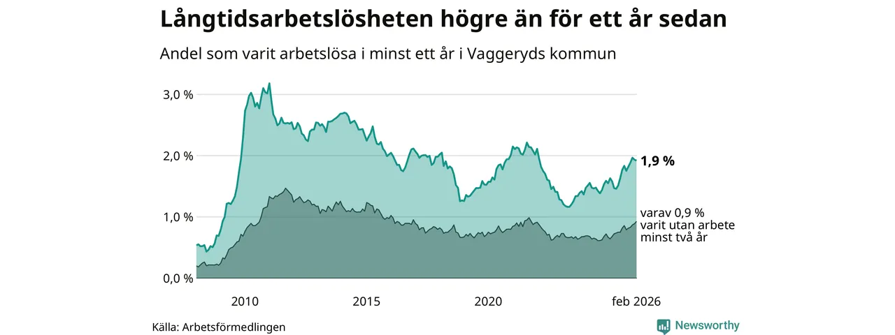 Andelen som varit utan arbete i minst ett år i Vaggeryd i februari var högre än för ett år sedan. Men jämfört med i januari har antalet långtidsarbetslösa minskat.
