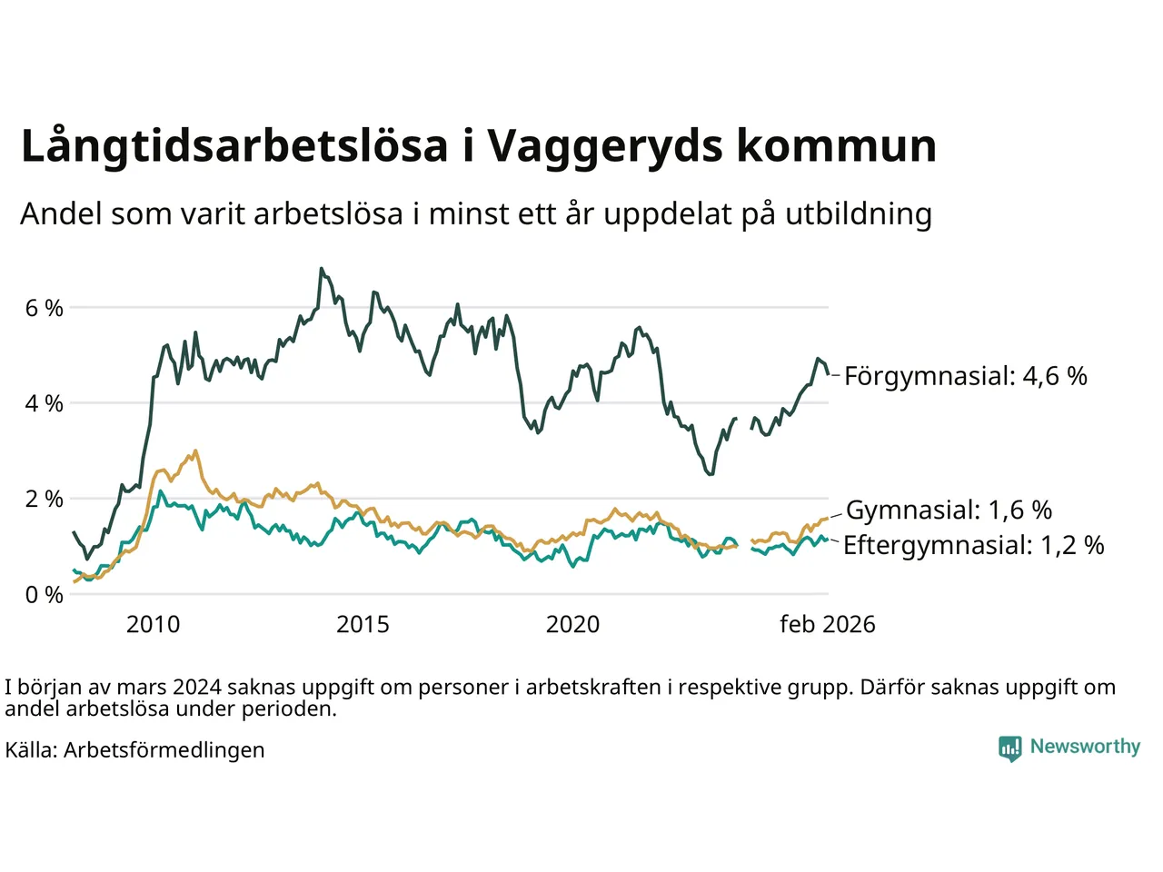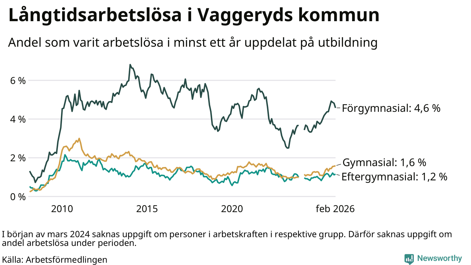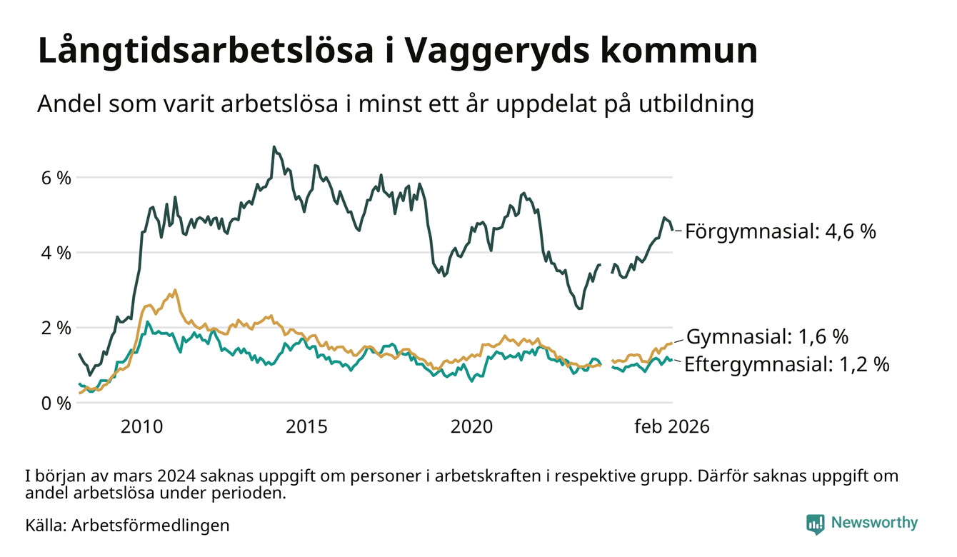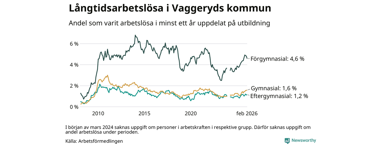Andelen som varit utan arbete i minst ett år i Vaggeryd i februari var högre än för ett år sedan. Men jämfört med i januari har antalet långtidsarbetslösa minskat.