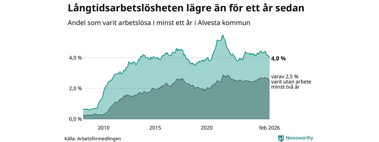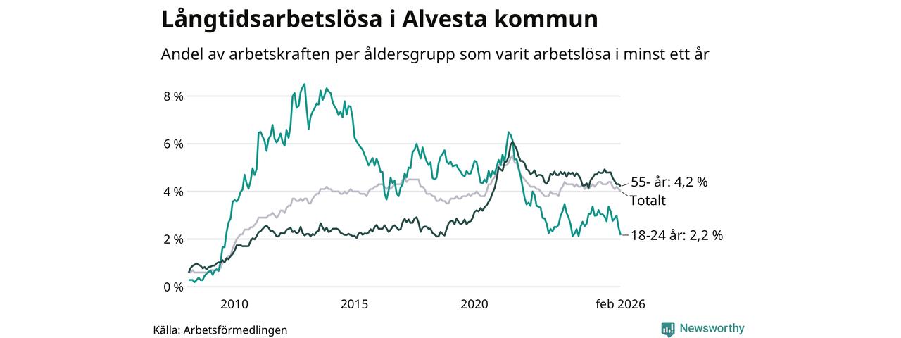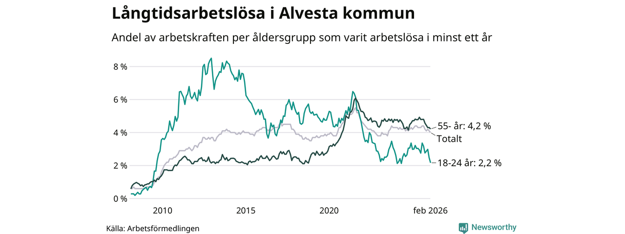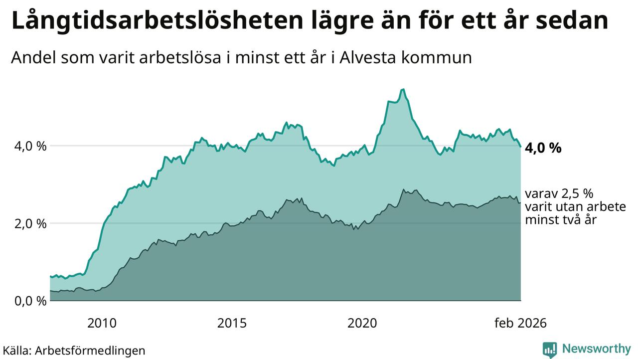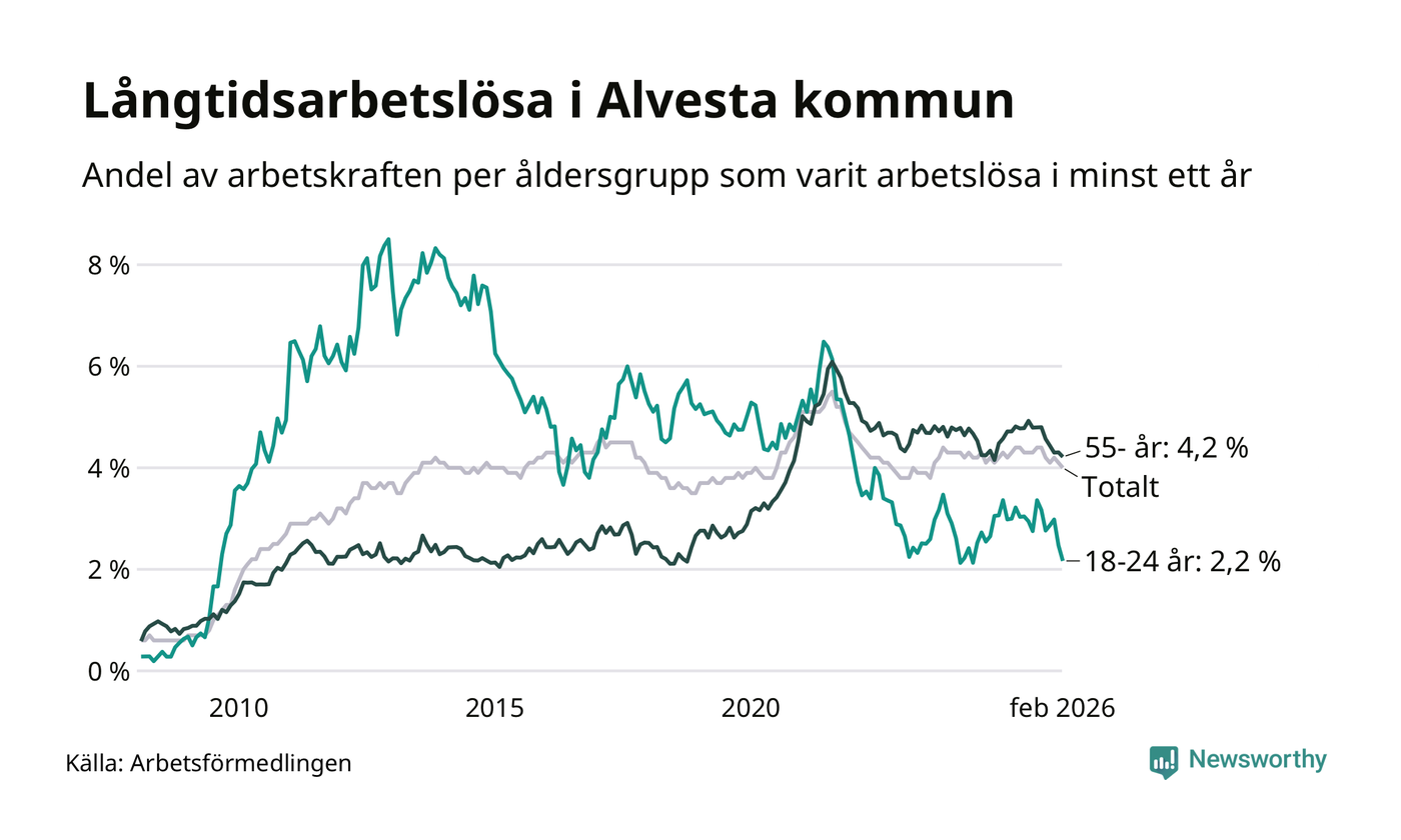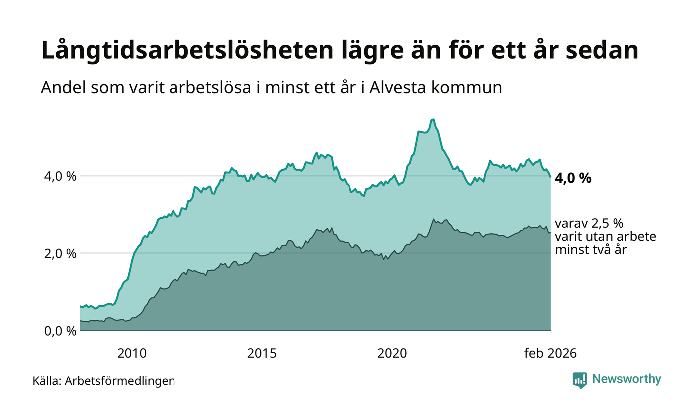 I februari hade 374 Alvestabor varit arbetslösa i minst ett år, vilket är tolv färre än månaden innan. 374 personer motsvarar 4,0 procent av arbetskraften i kommunen – andelen långtidsarbetslösa är 0,3 procentenheter lägre än samma månad för ett år sedan.