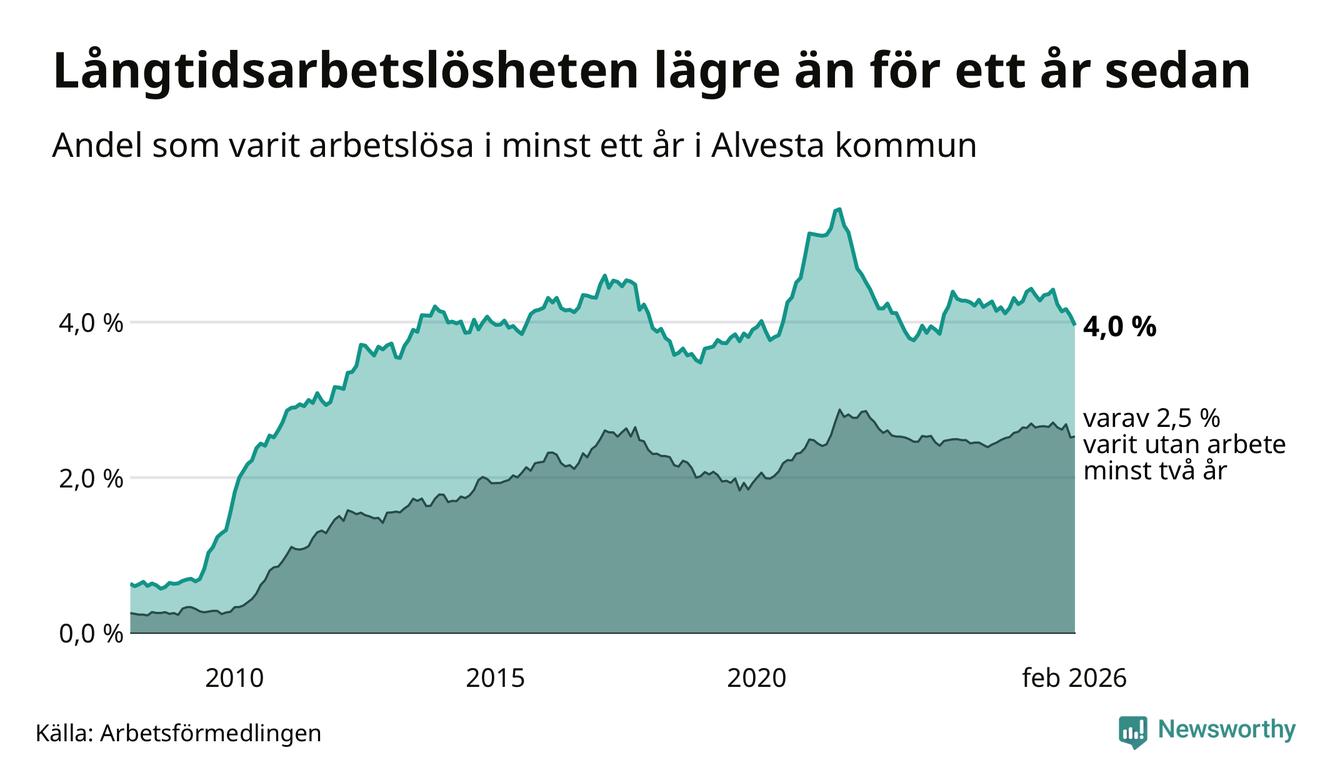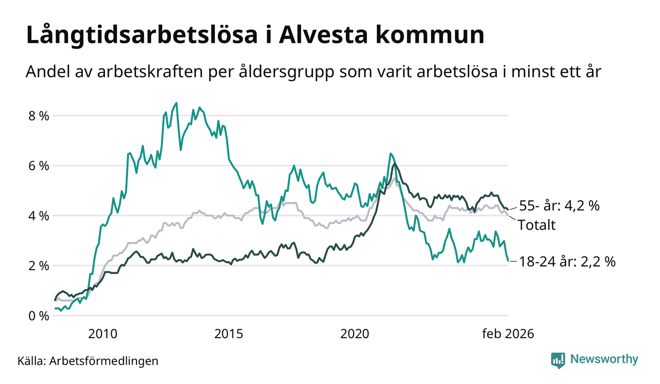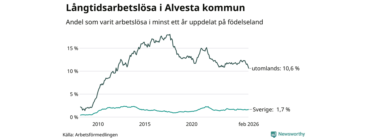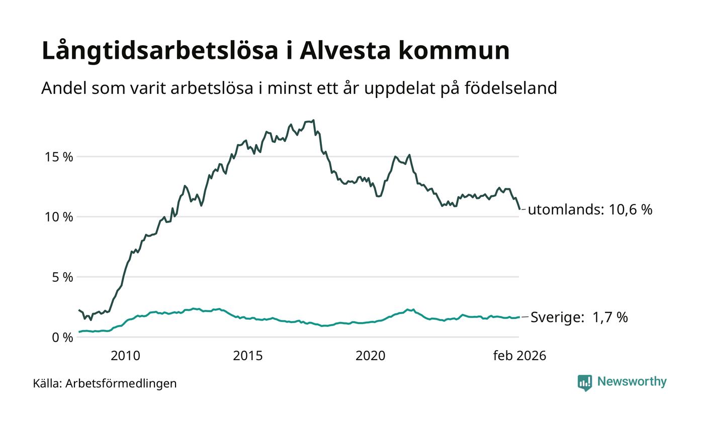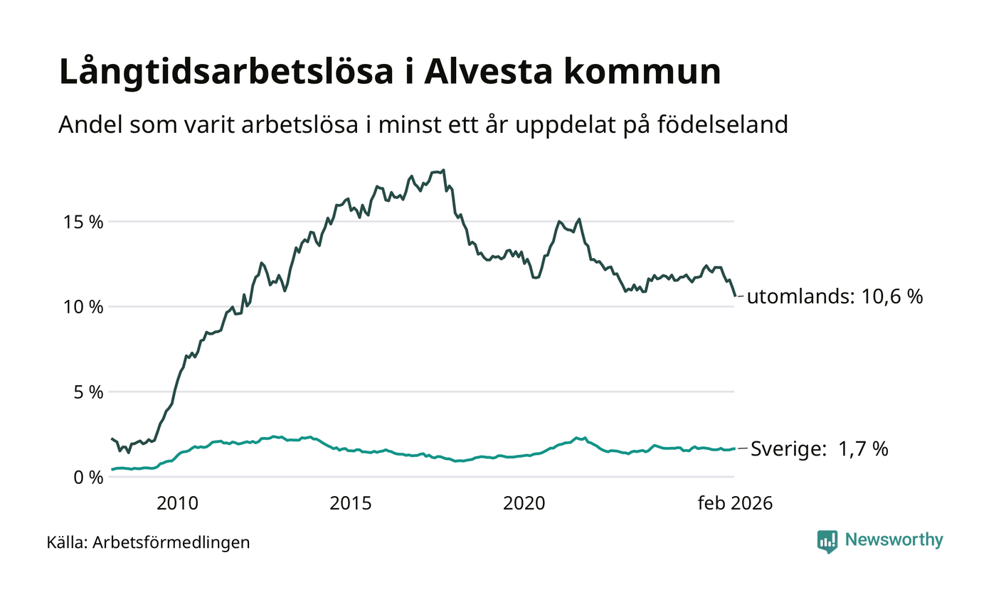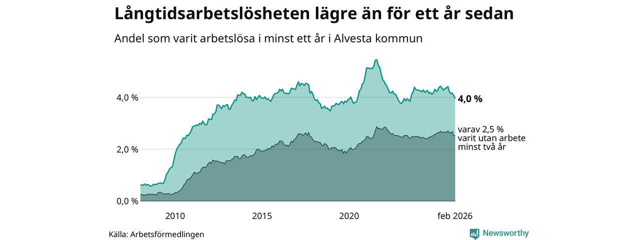 I februari hade 374 Alvestabor varit arbetslösa i minst ett år, vilket är tolv färre än månaden innan. 374 personer motsvarar 4,0 procent av arbetskraften i kommunen – andelen långtidsarbetslösa är 0,3 procentenheter lägre än samma månad för ett år sedan.