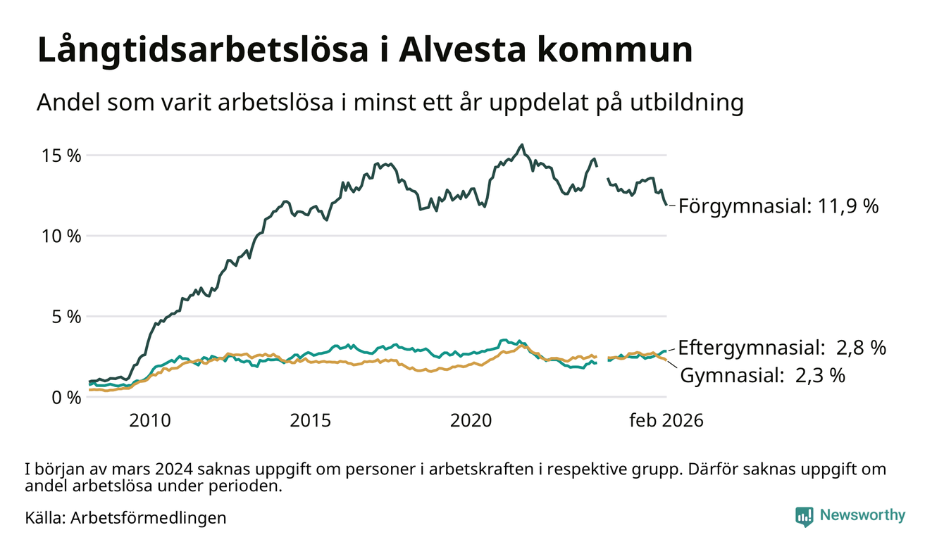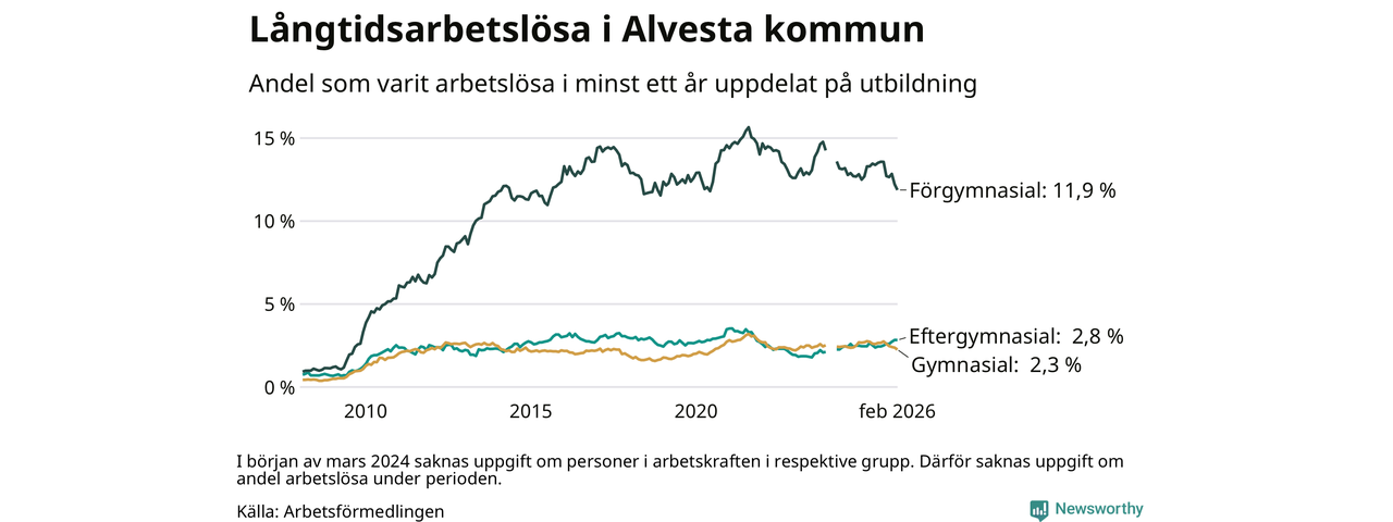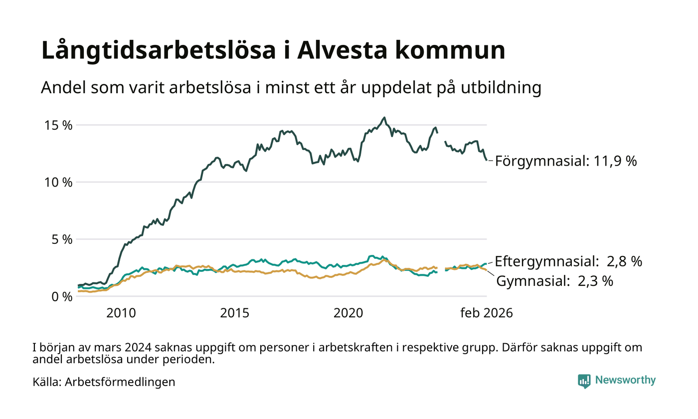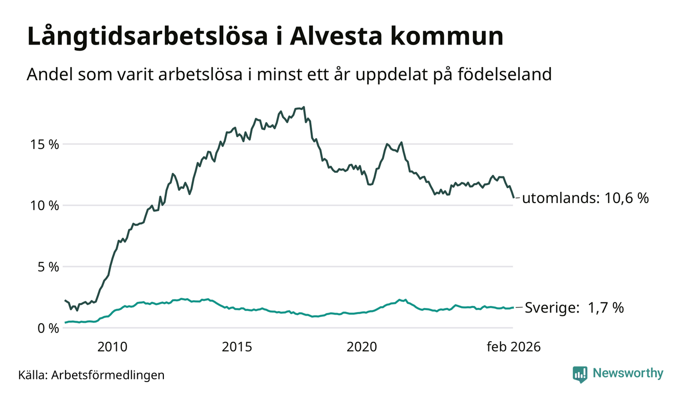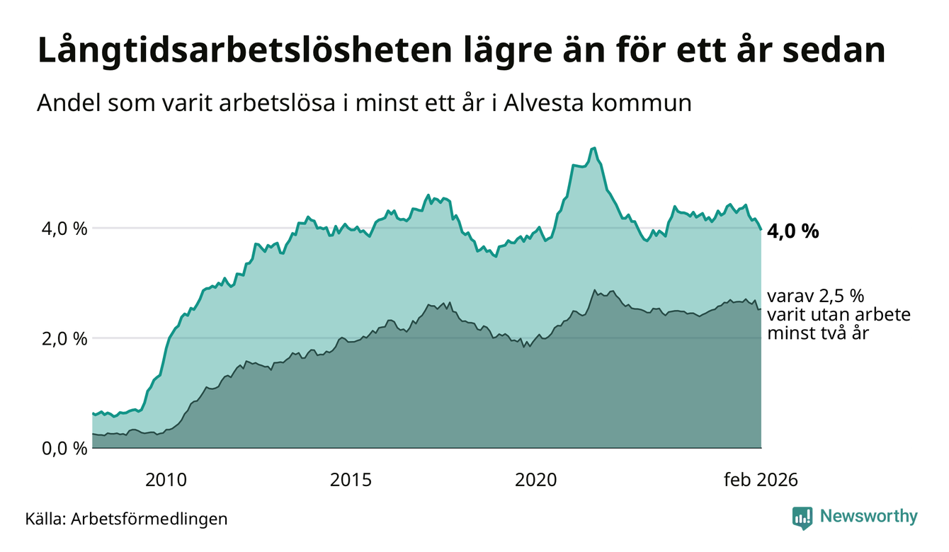 I februari hade 374 Alvestabor varit arbetslösa i minst ett år, vilket är tolv färre än månaden innan. 374 personer motsvarar 4,0 procent av arbetskraften i kommunen – andelen långtidsarbetslösa är 0,3 procentenheter lägre än samma månad för ett år sedan.