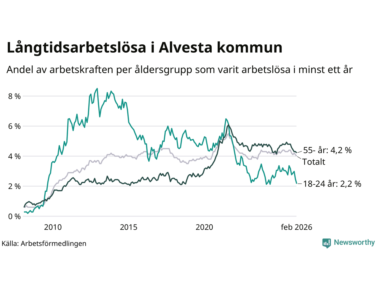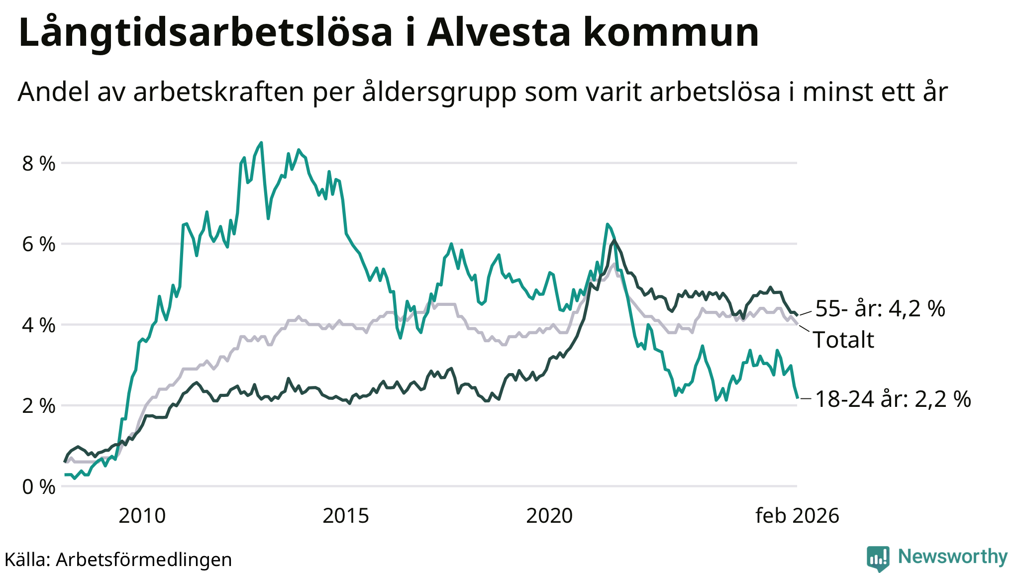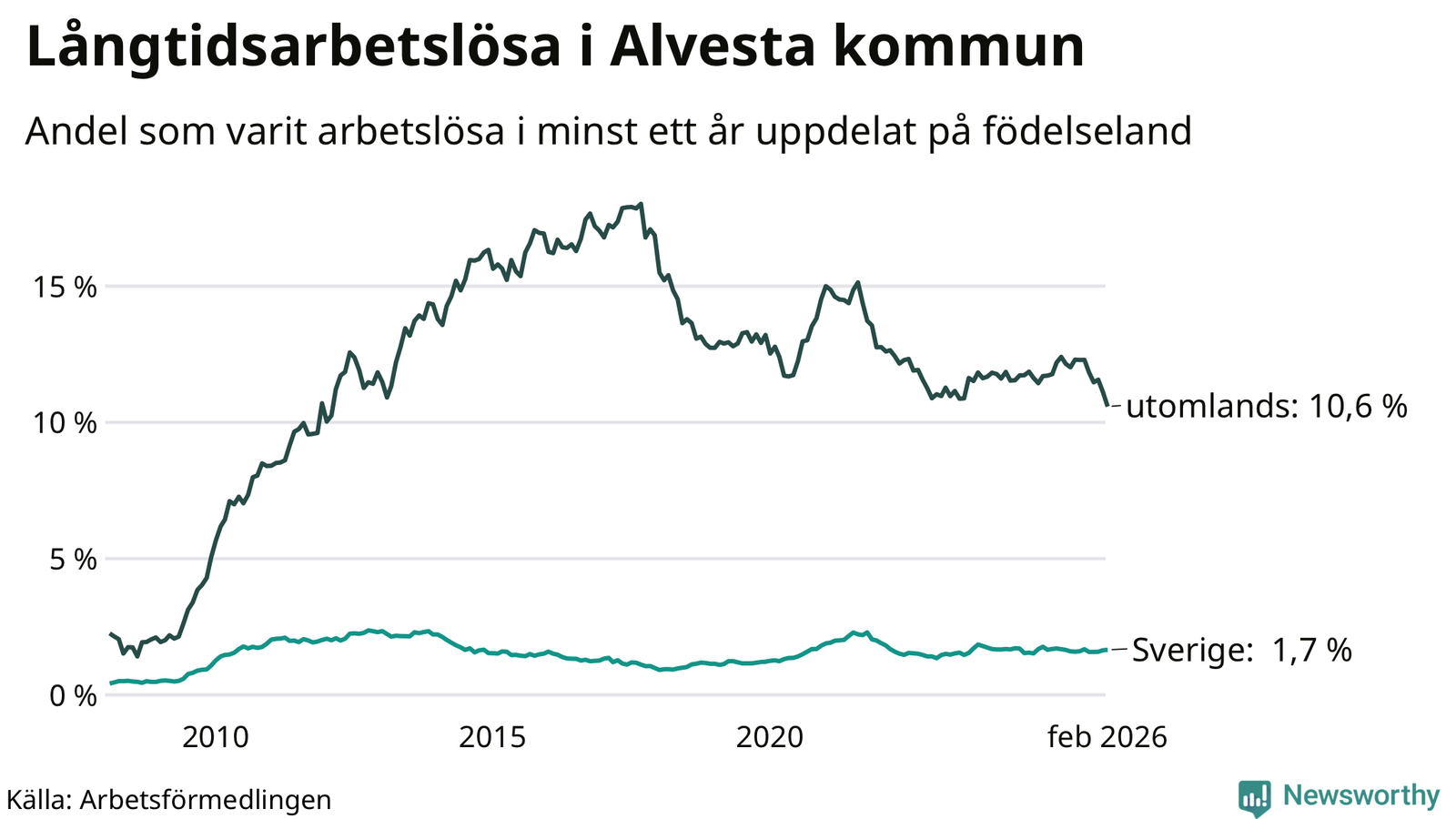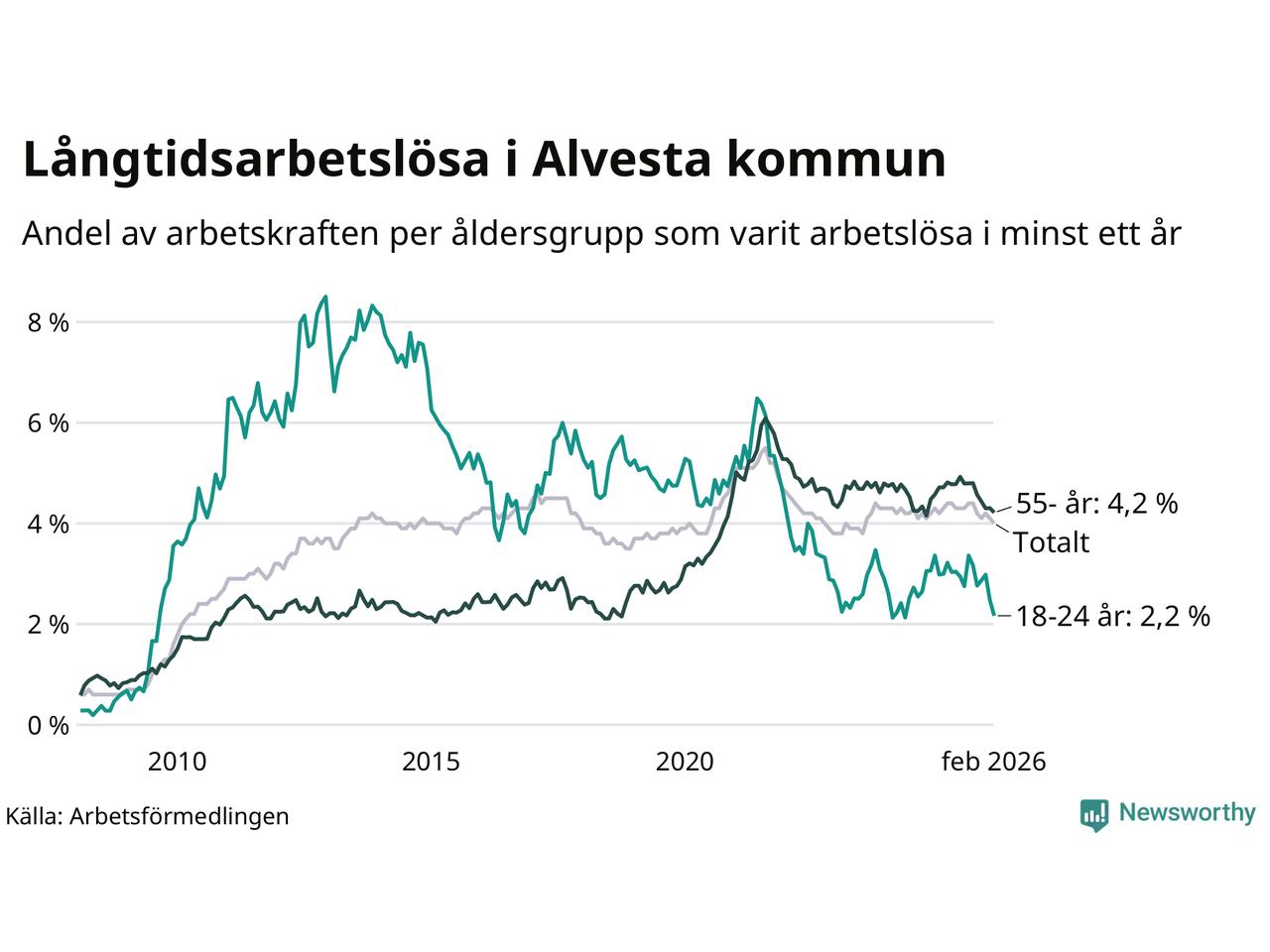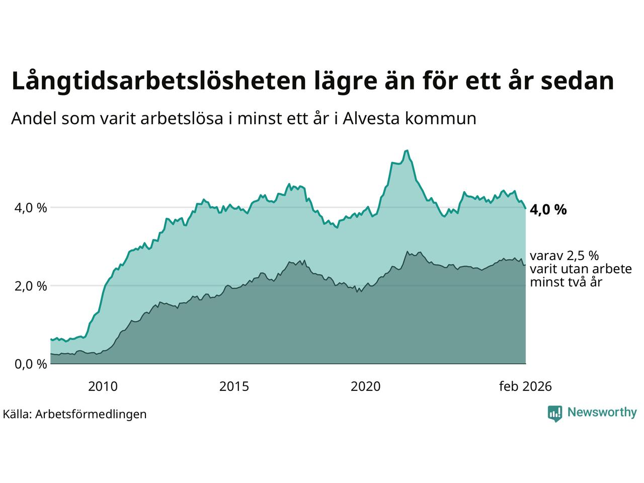 I februari hade 374 Alvestabor varit arbetslösa i minst ett år, vilket är tolv färre än månaden innan. 374 personer motsvarar 4,0 procent av arbetskraften i kommunen – andelen långtidsarbetslösa är 0,3 procentenheter lägre än samma månad för ett år sedan.
