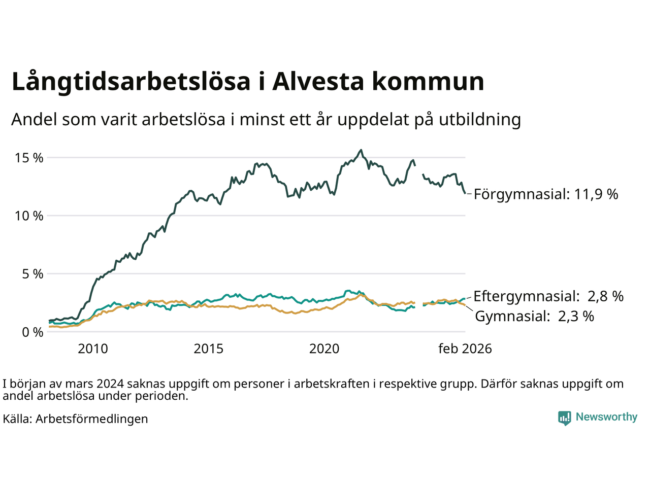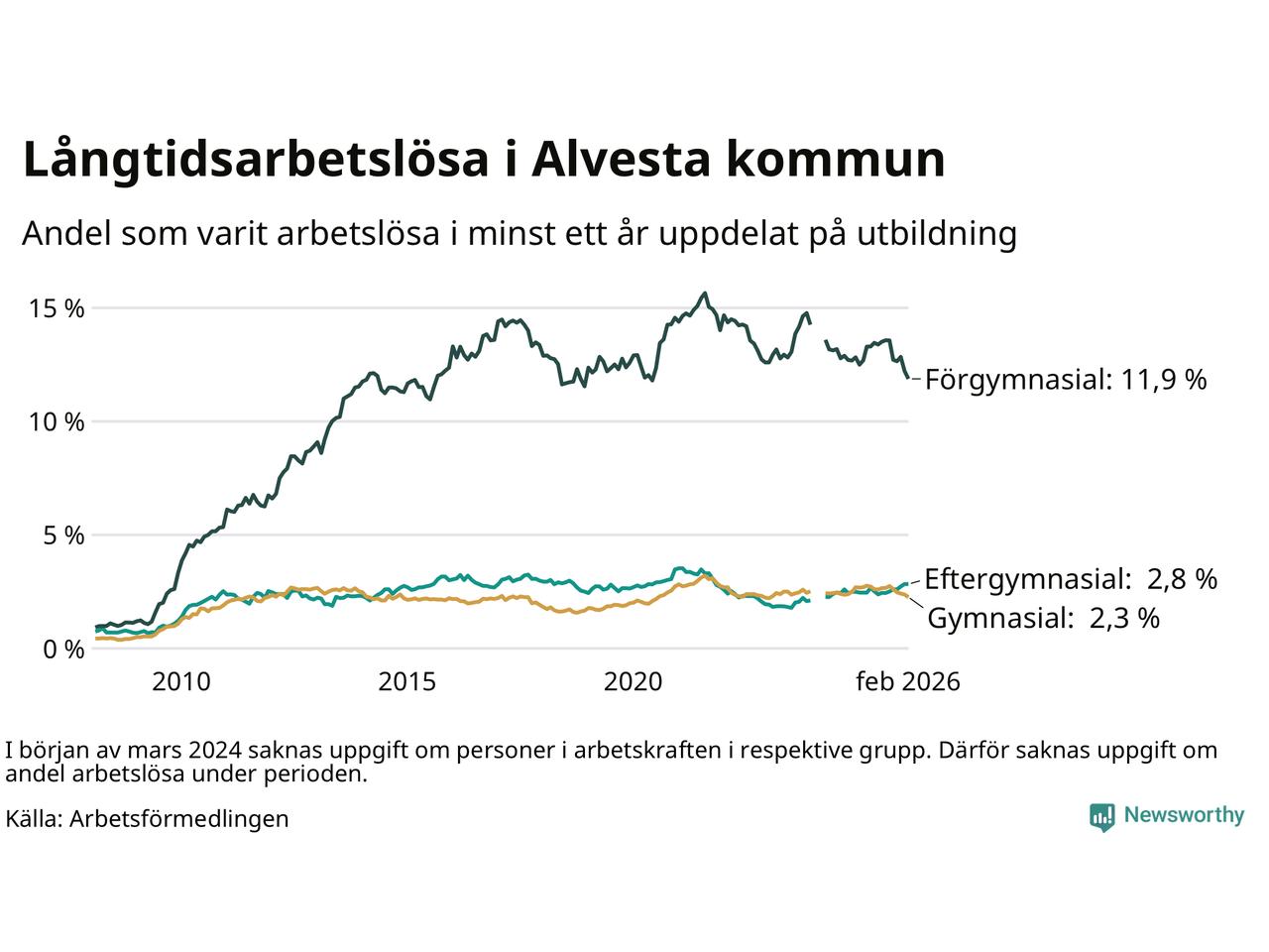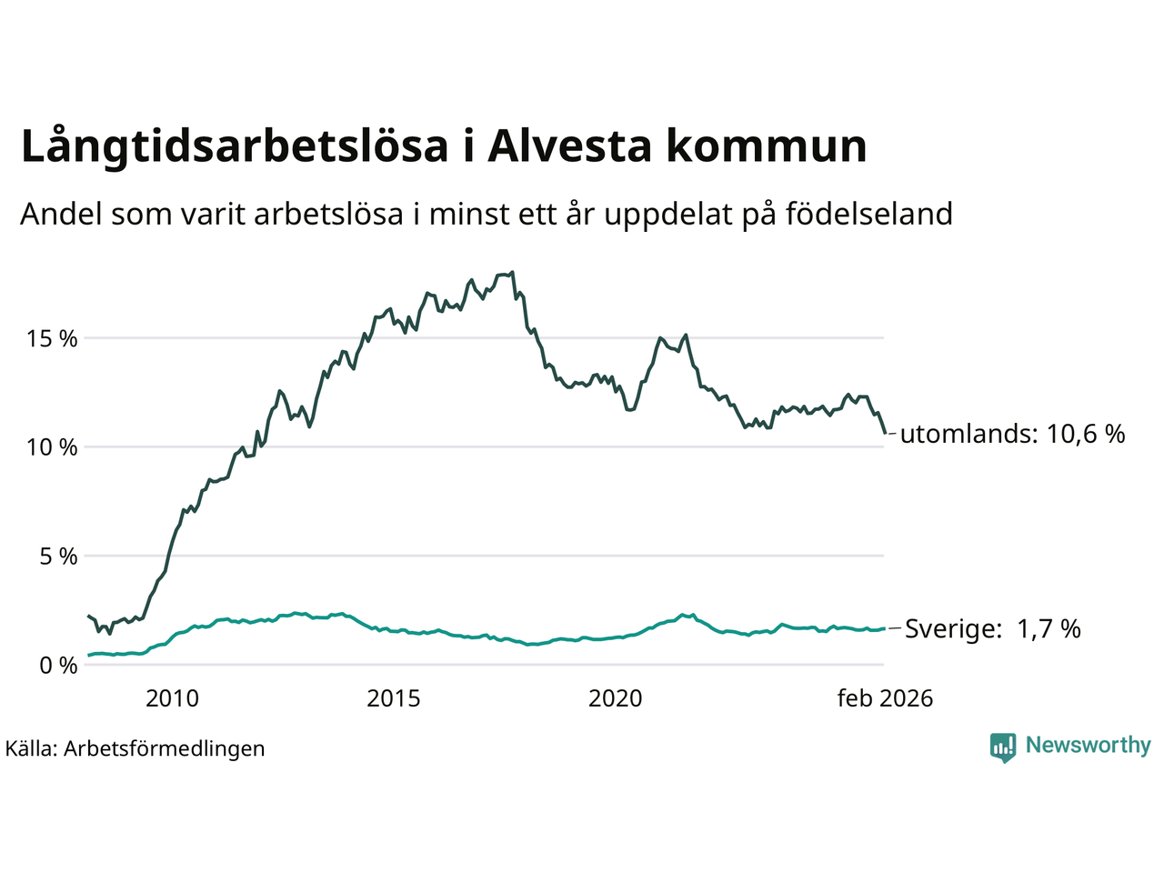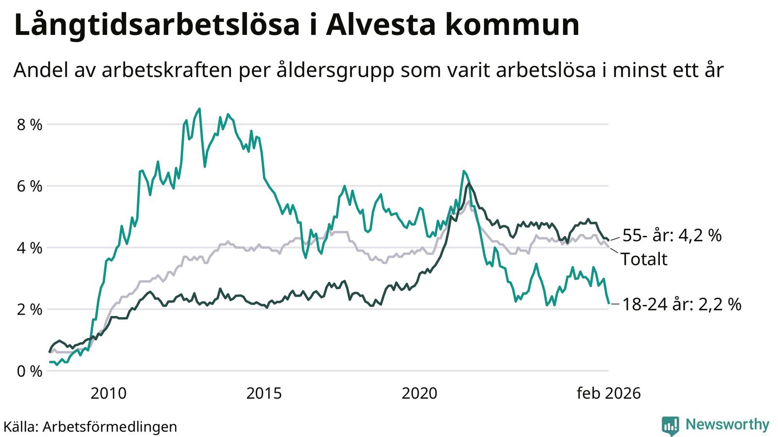 I februari hade 374 Alvestabor varit arbetslösa i minst ett år, vilket är tolv färre än månaden innan. 374 personer motsvarar 4,0 procent av arbetskraften i kommunen – andelen långtidsarbetslösa är 0,3 procentenheter lägre än samma månad för ett år sedan.