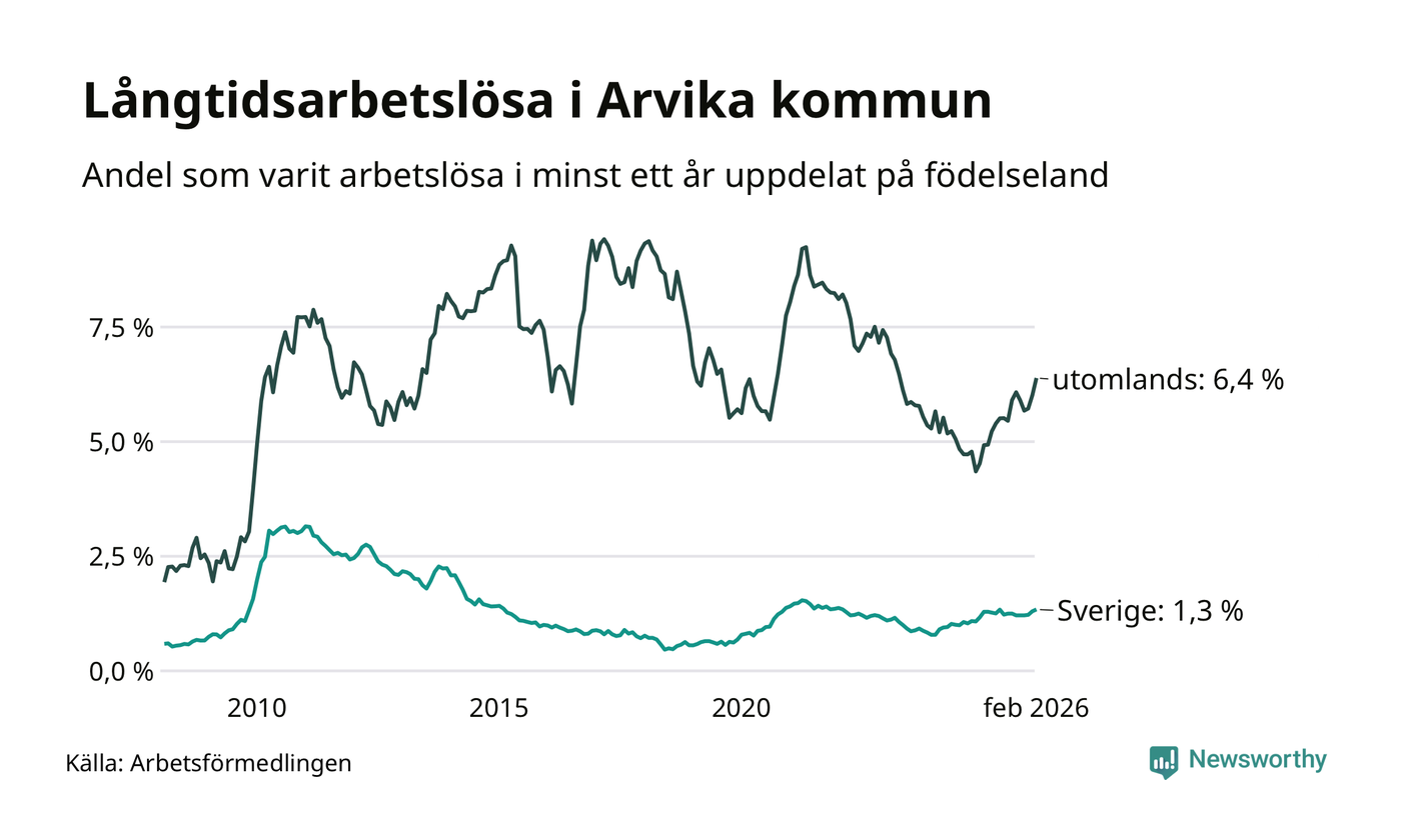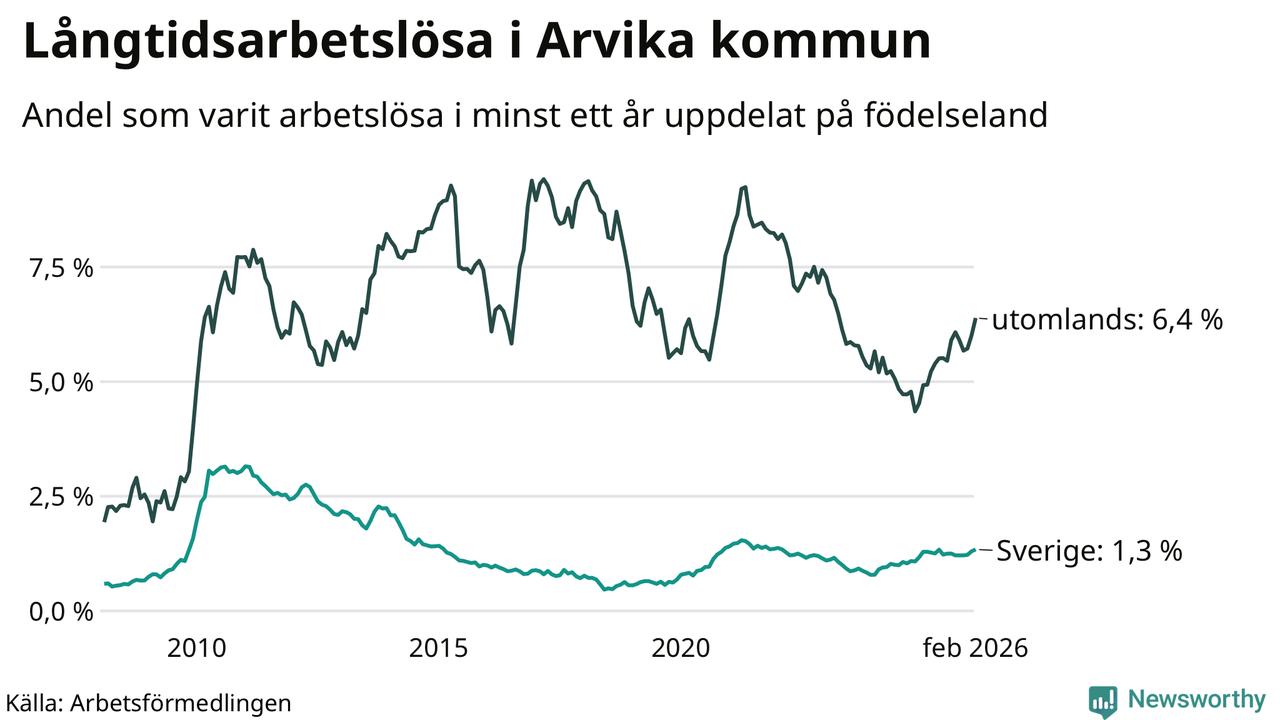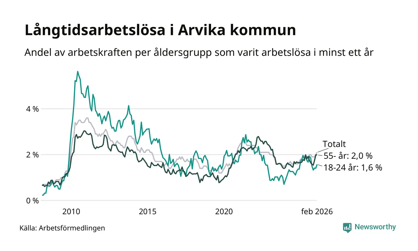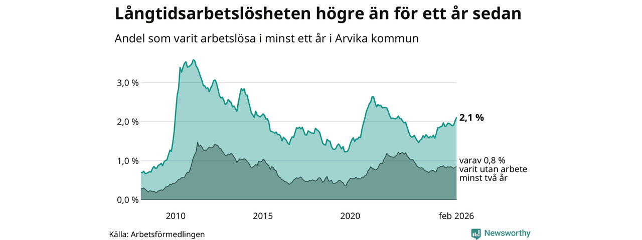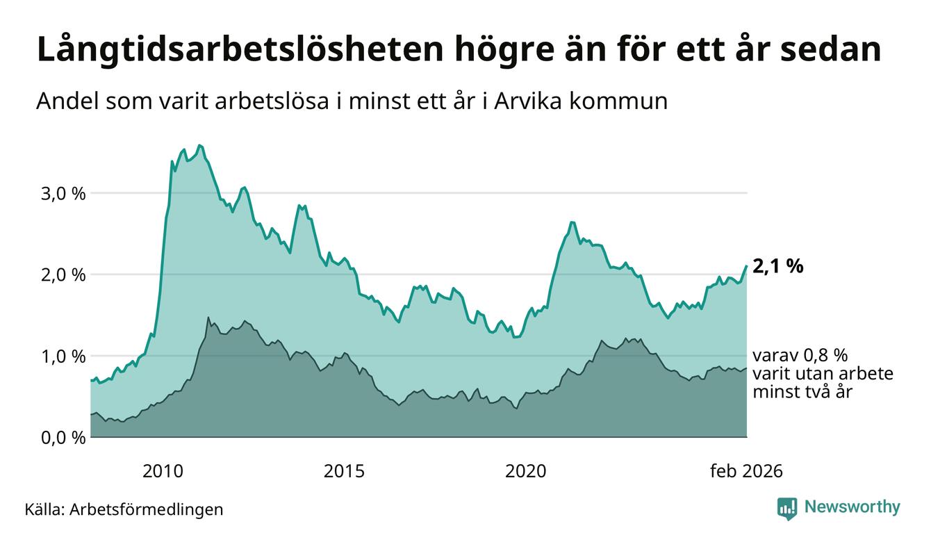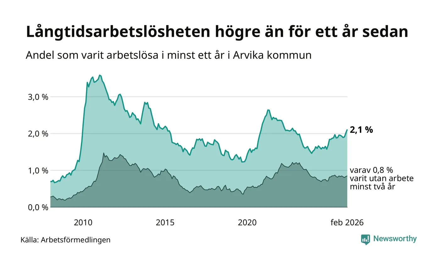 I februari hade 251 Arvikabor varit arbetslösa i minst ett år, vilket är elva fler än månaden innan. 251 personer motsvarar 2,1 procent av arbetskraften i kommunen – andelen långtidsarbetslösa är 0,3 procentenheter högre än samma månad för ett år sedan.