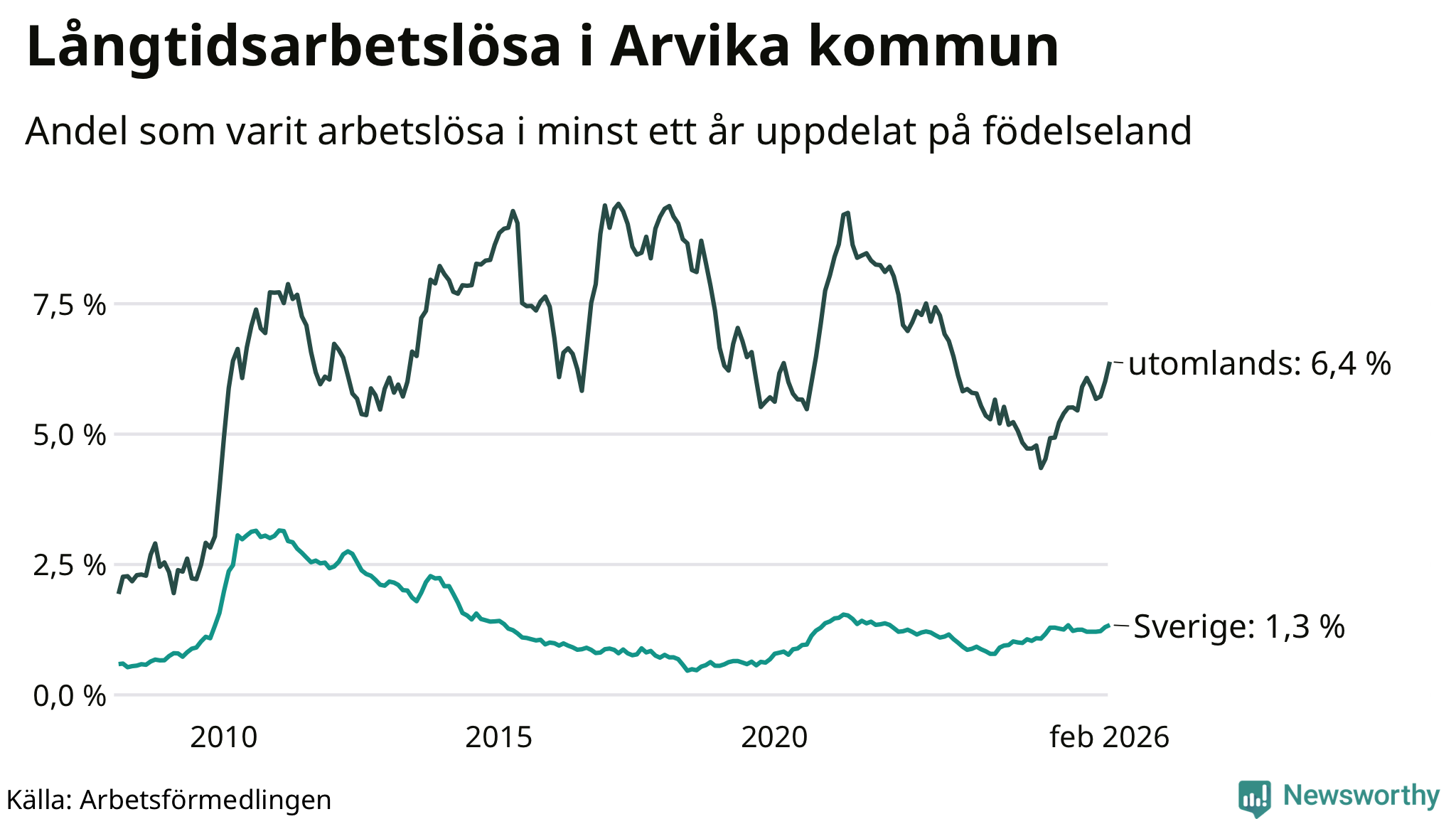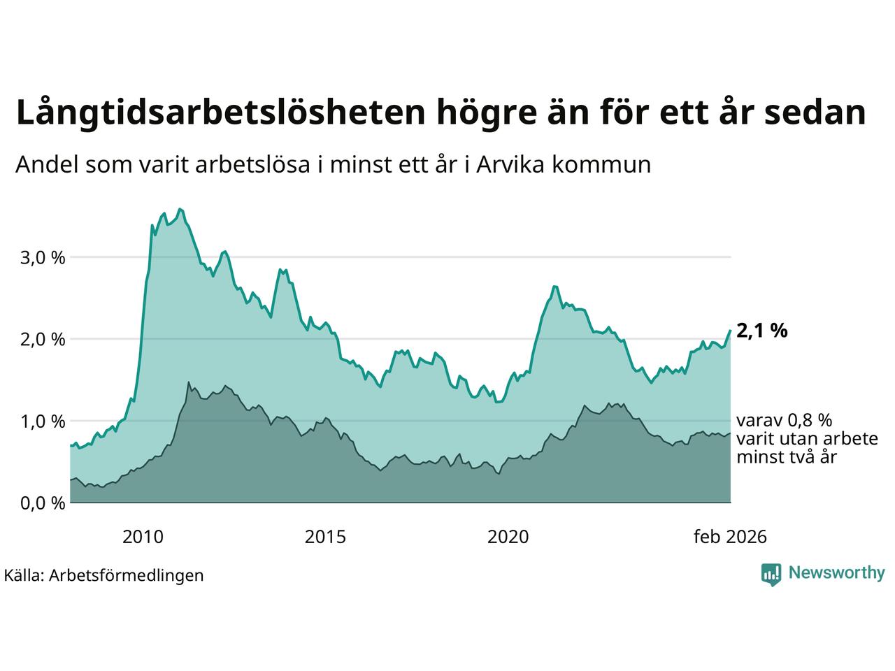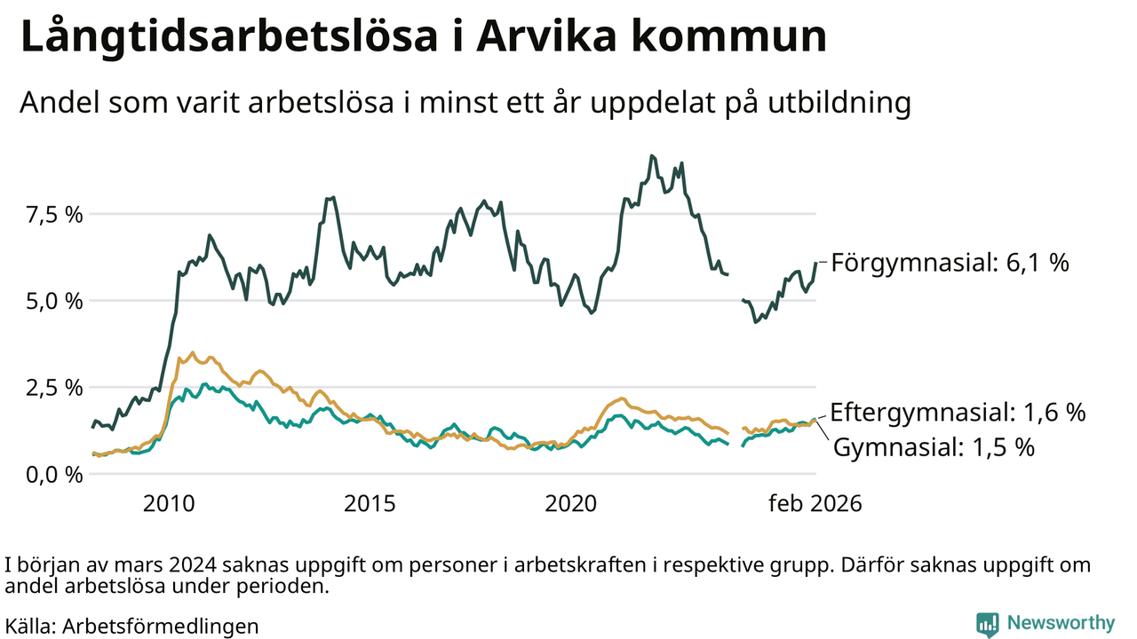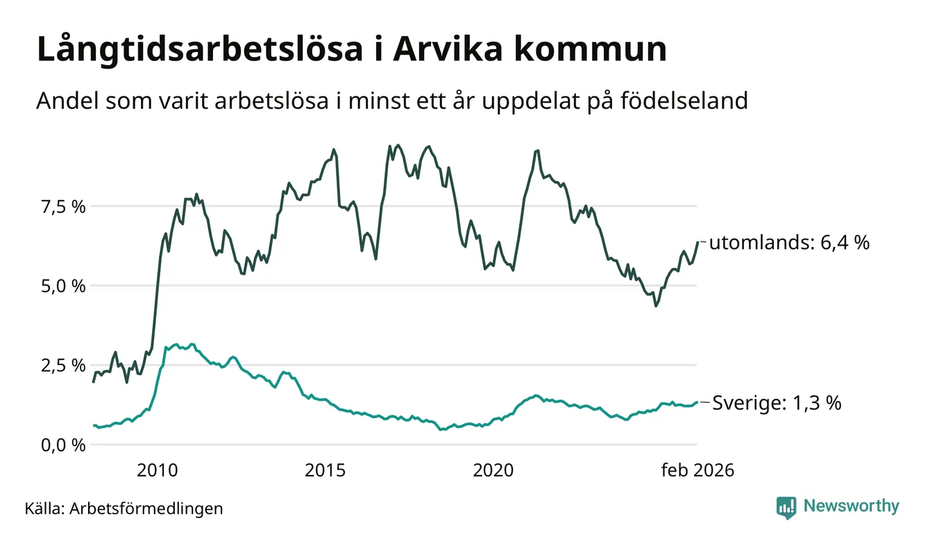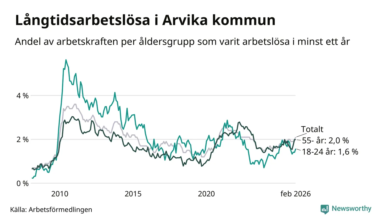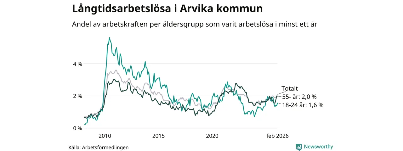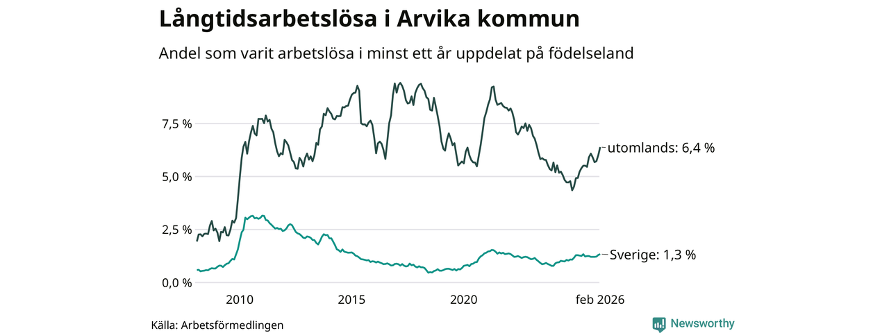 I februari hade 251 Arvikabor varit arbetslösa i minst ett år, vilket är elva fler än månaden innan. 251 personer motsvarar 2,1 procent av arbetskraften i kommunen – andelen långtidsarbetslösa är 0,3 procentenheter högre än samma månad för ett år sedan.