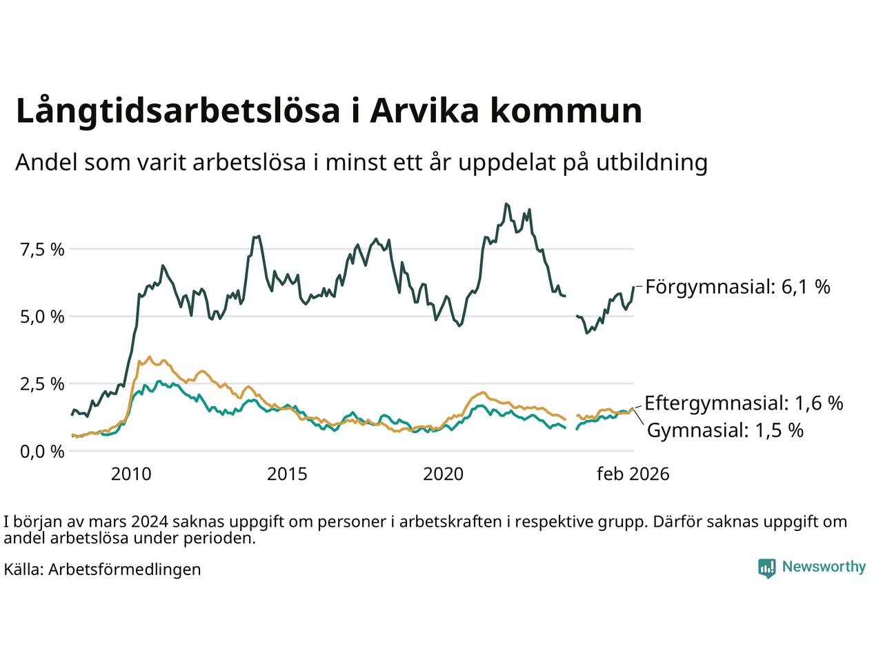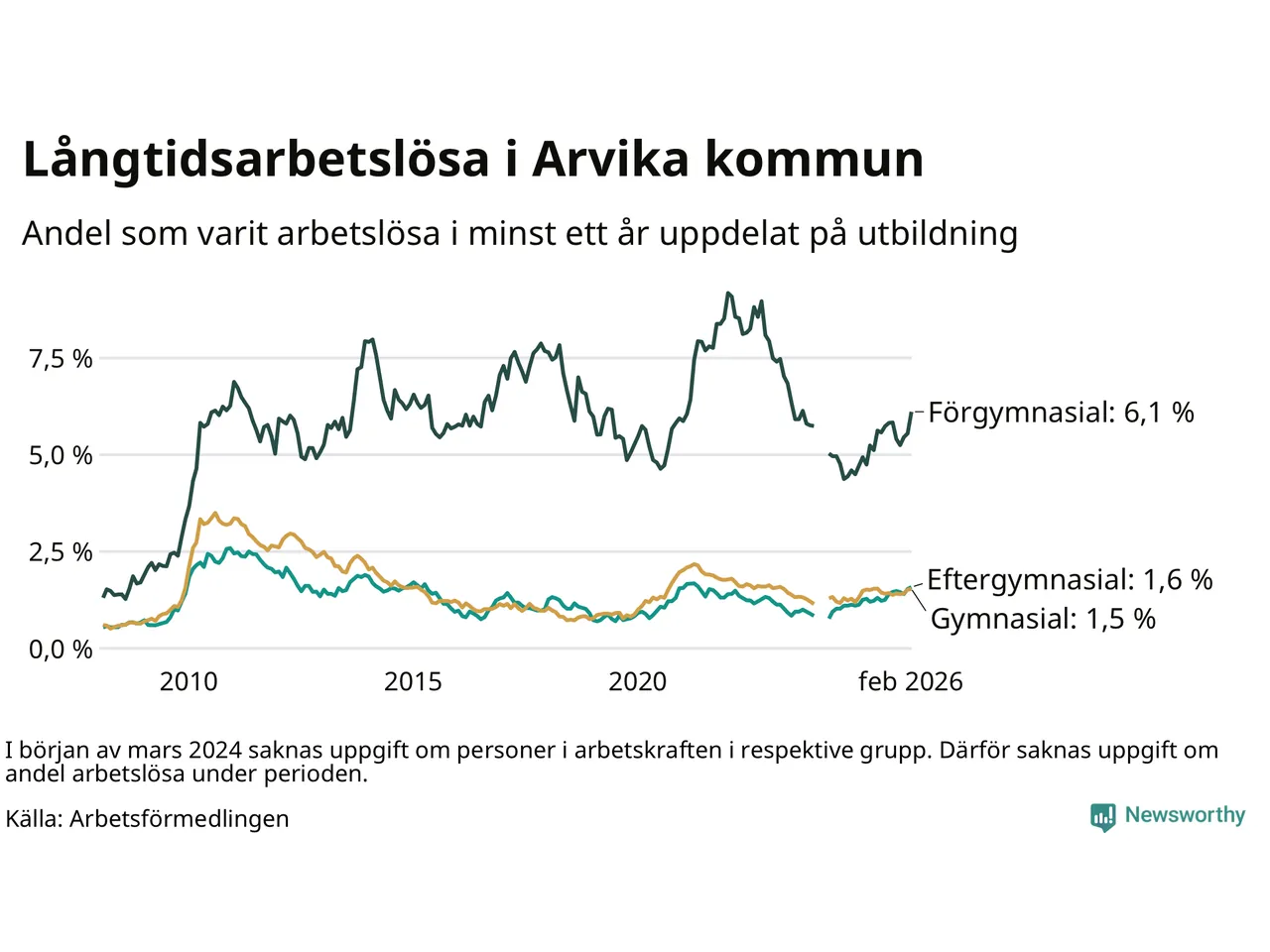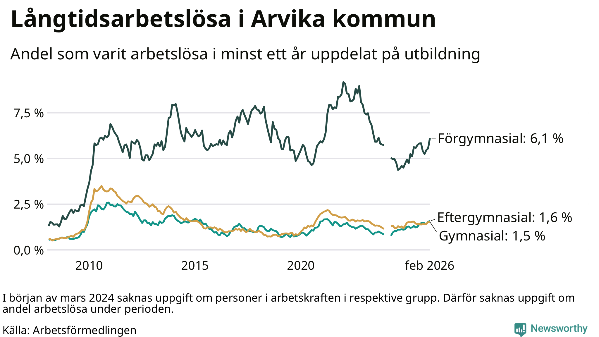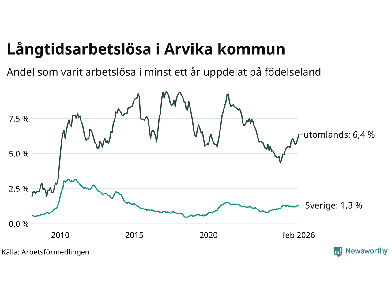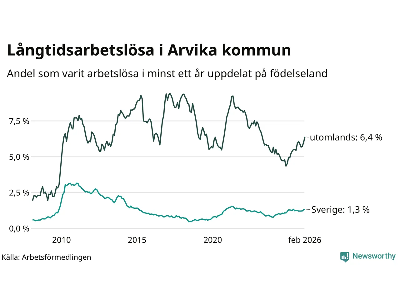 I februari hade 251 Arvikabor varit arbetslösa i minst ett år, vilket är elva fler än månaden innan. 251 personer motsvarar 2,1 procent av arbetskraften i kommunen – andelen långtidsarbetslösa är 0,3 procentenheter högre än samma månad för ett år sedan.
