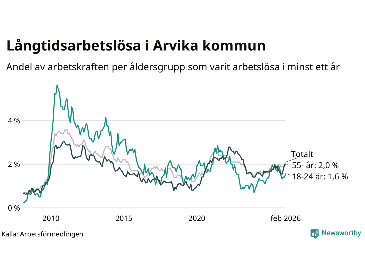 | Andel arbetslösa i minst två år | 0,8 % | 1,3 % | 1,6 % |