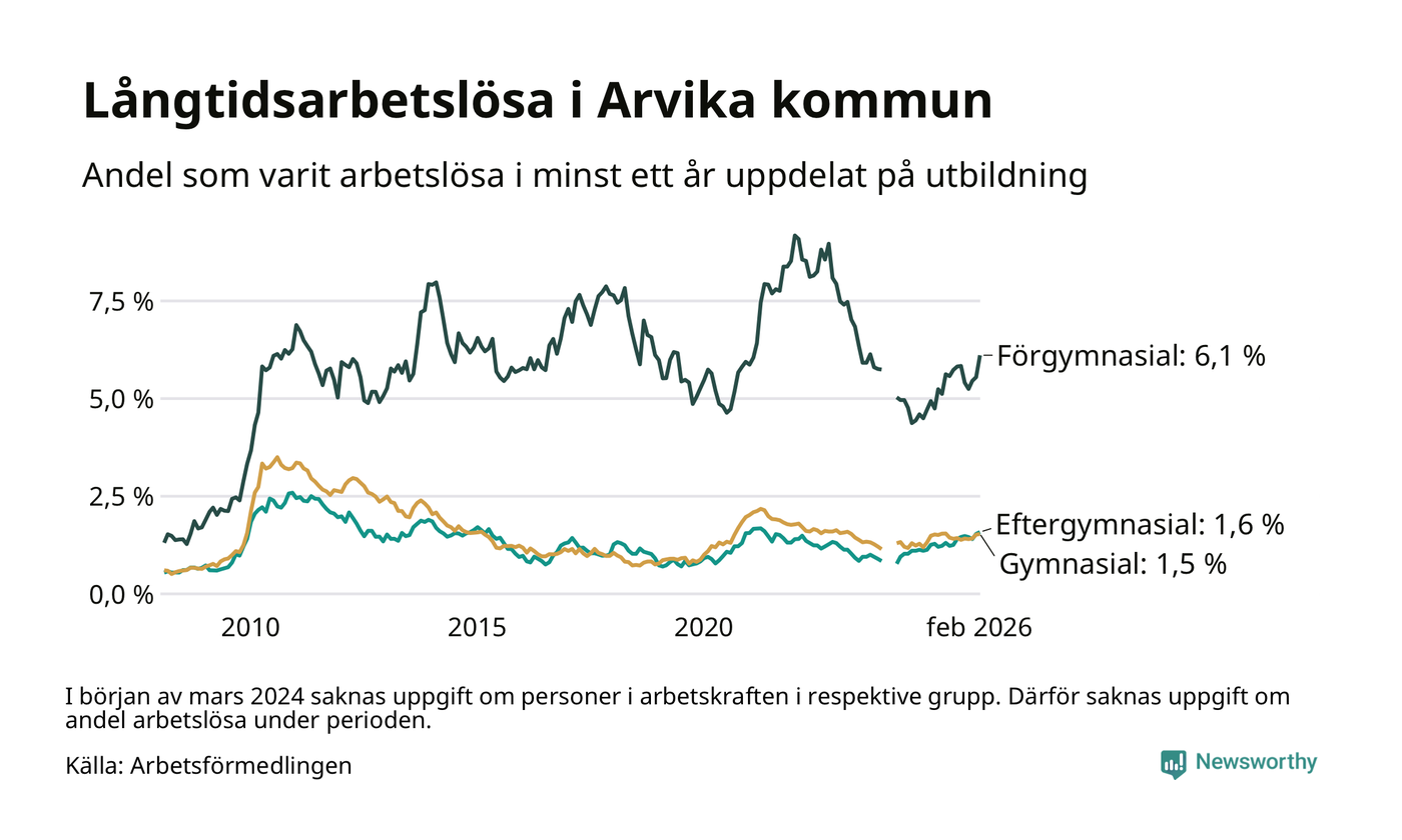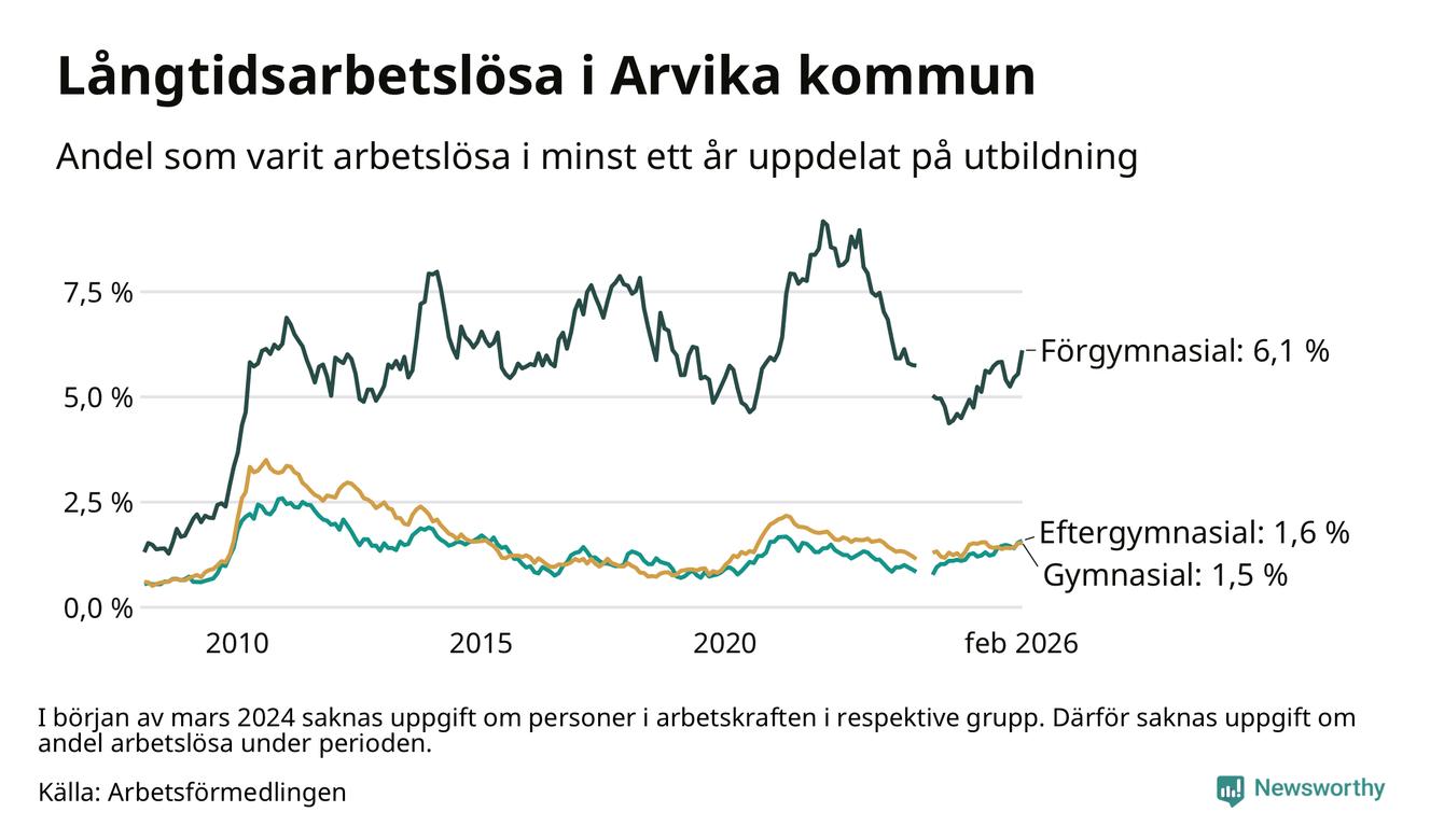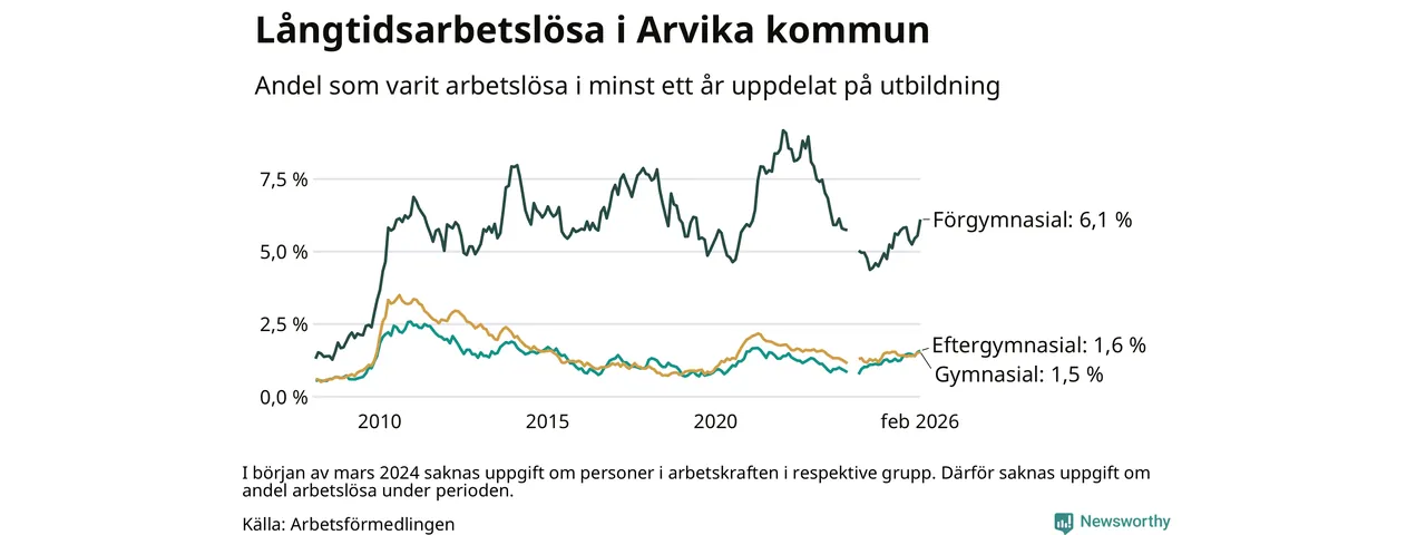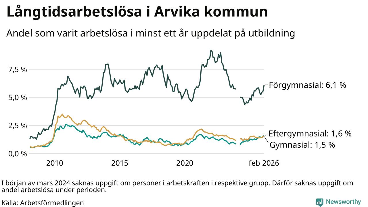 Inte sedan oktober 2022 har andelen långtidsarbetslösa varit så hög i Arvika. Det visar Arbetsförmedlingens senaste månadsstatistik.