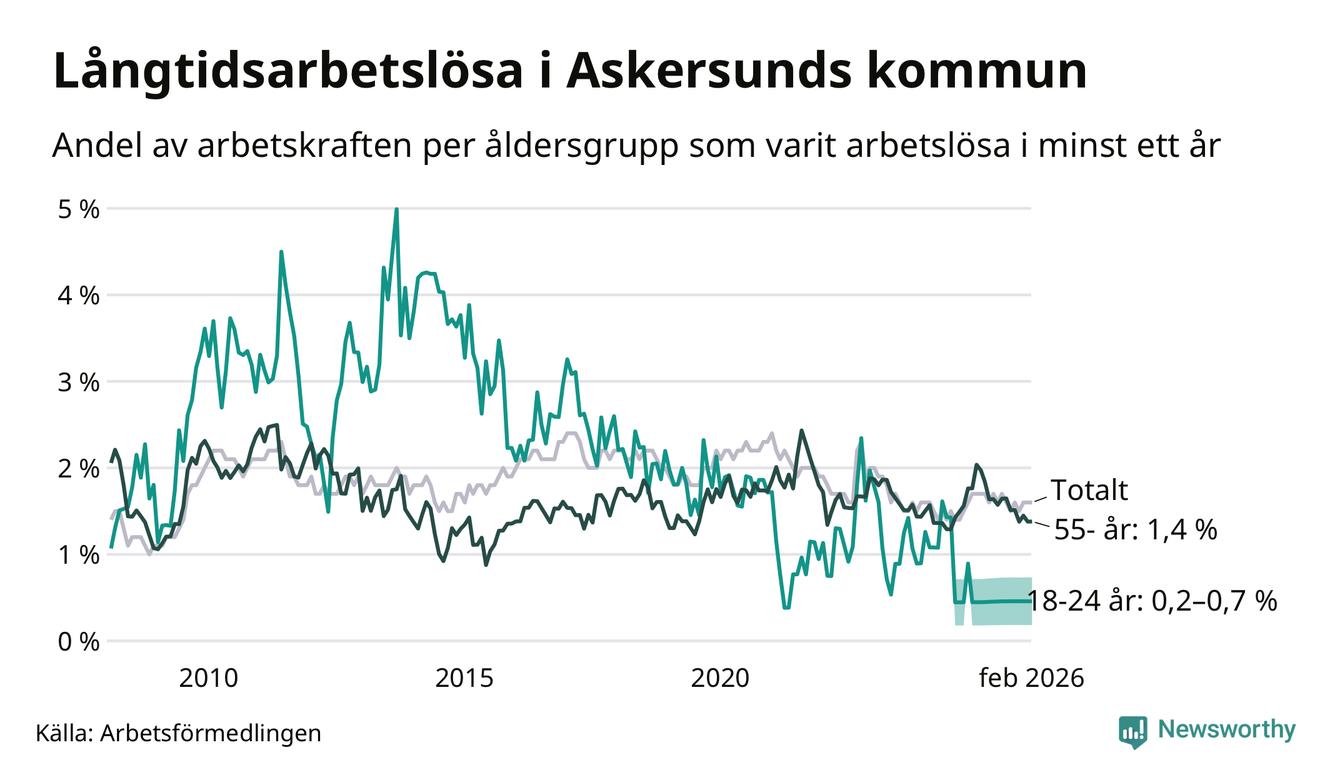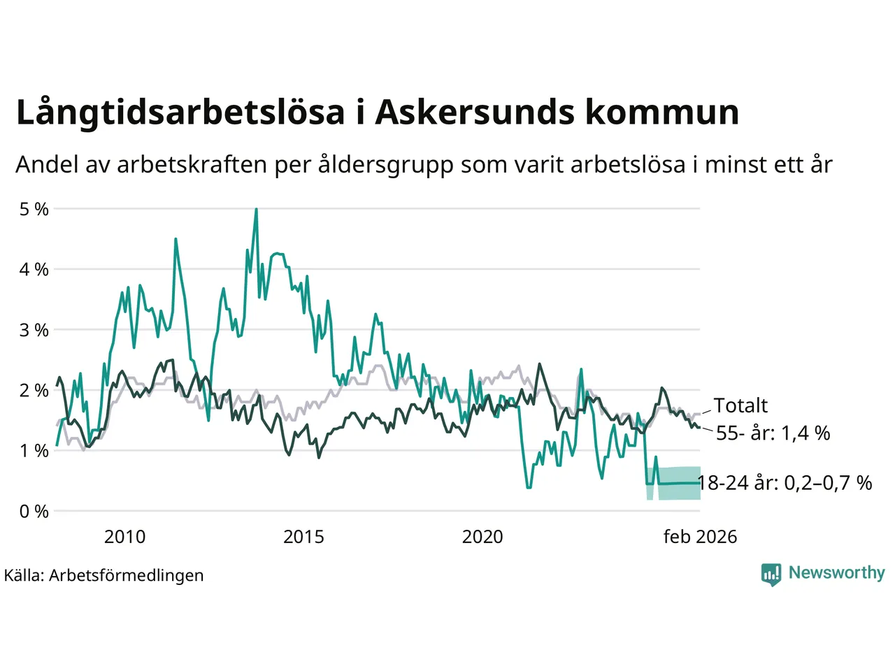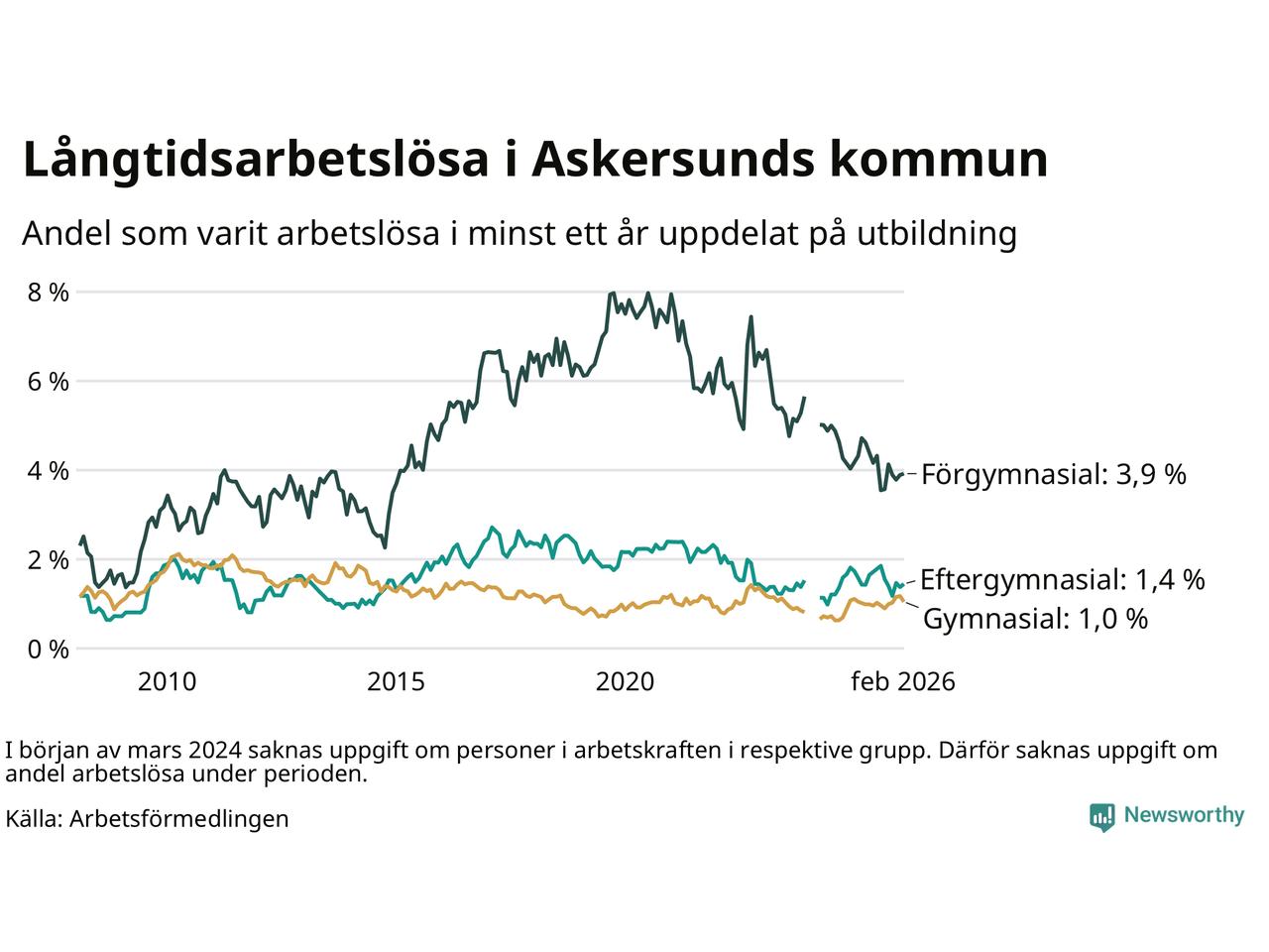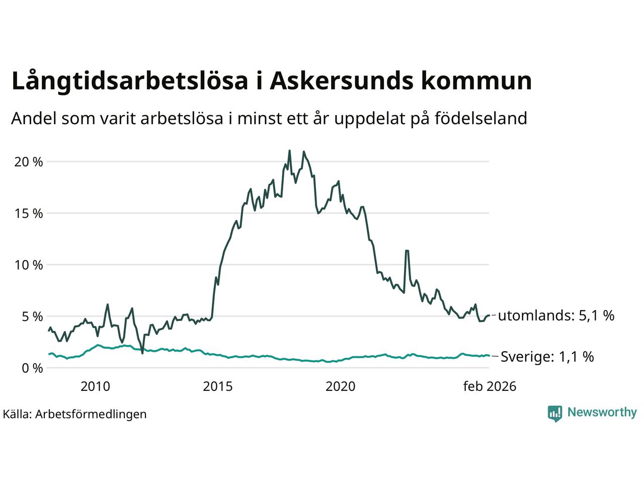 I februari hade 82 Askersundsbor varit arbetslösa i minst ett år, vilket är tre färre än månaden innan. 82 personer motsvarar 1,6 procent av arbetskraften i kommunen – andelen långtidsarbetslösa är ungefär på samma nivå som för ett år sedan.