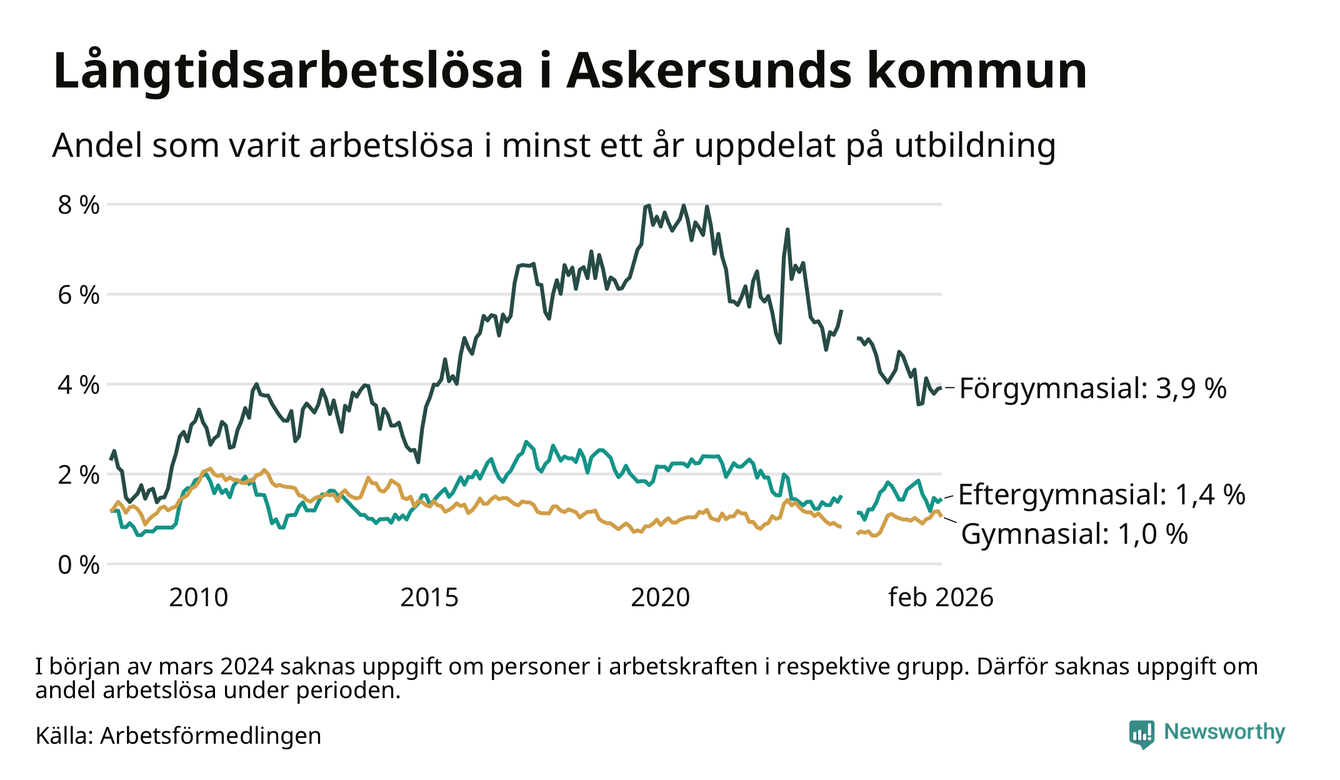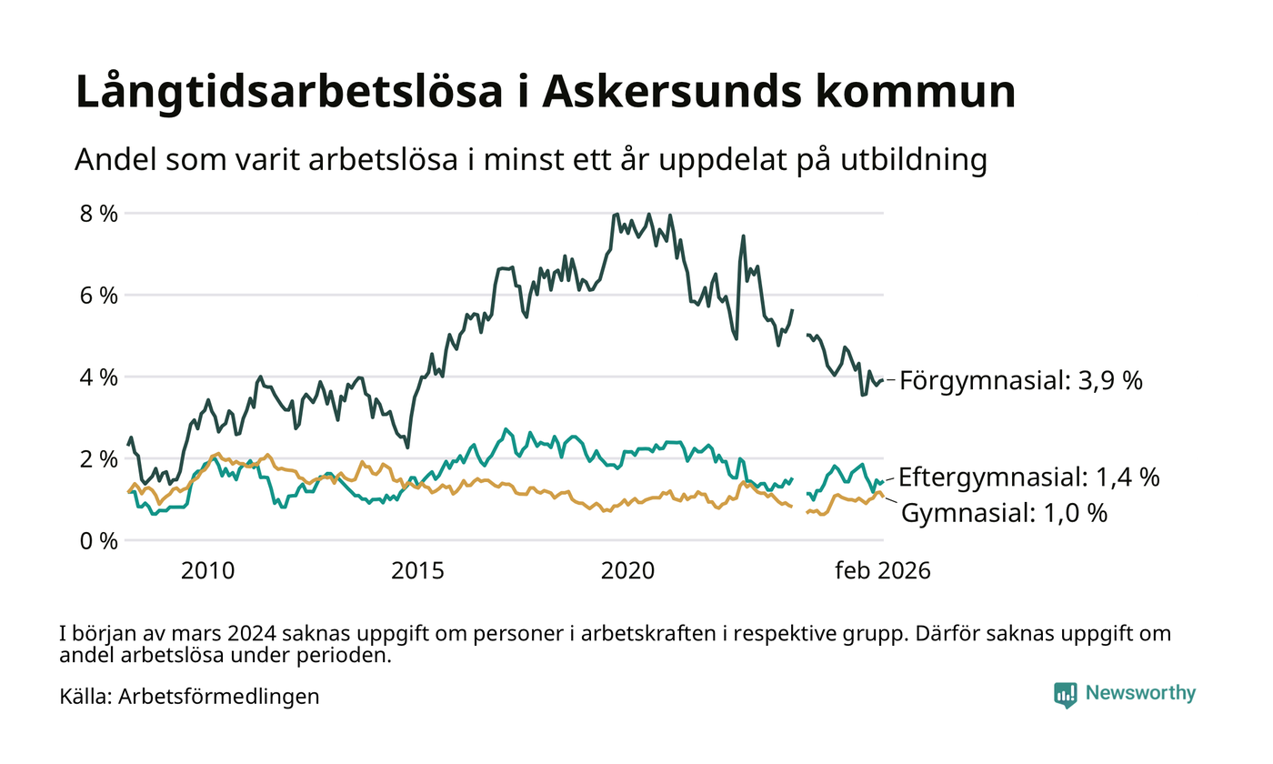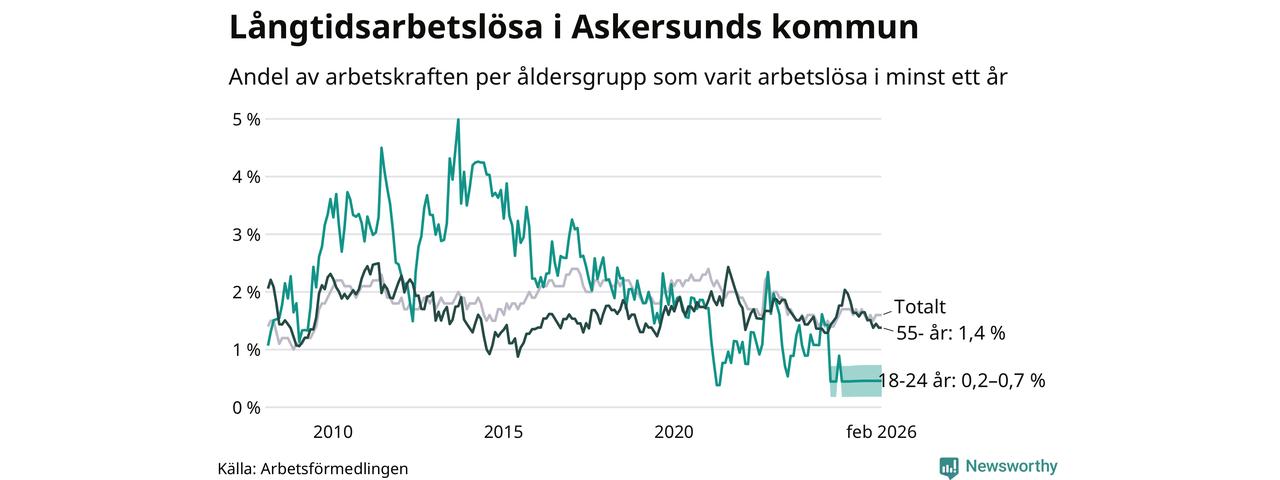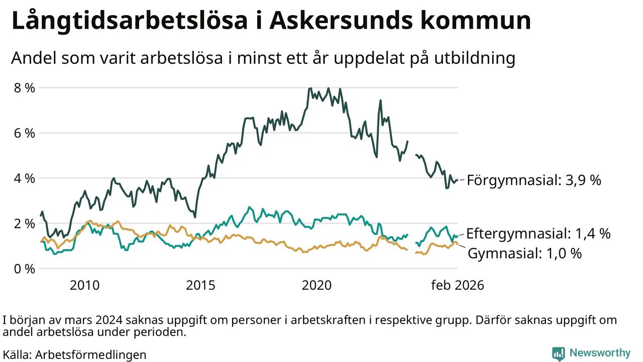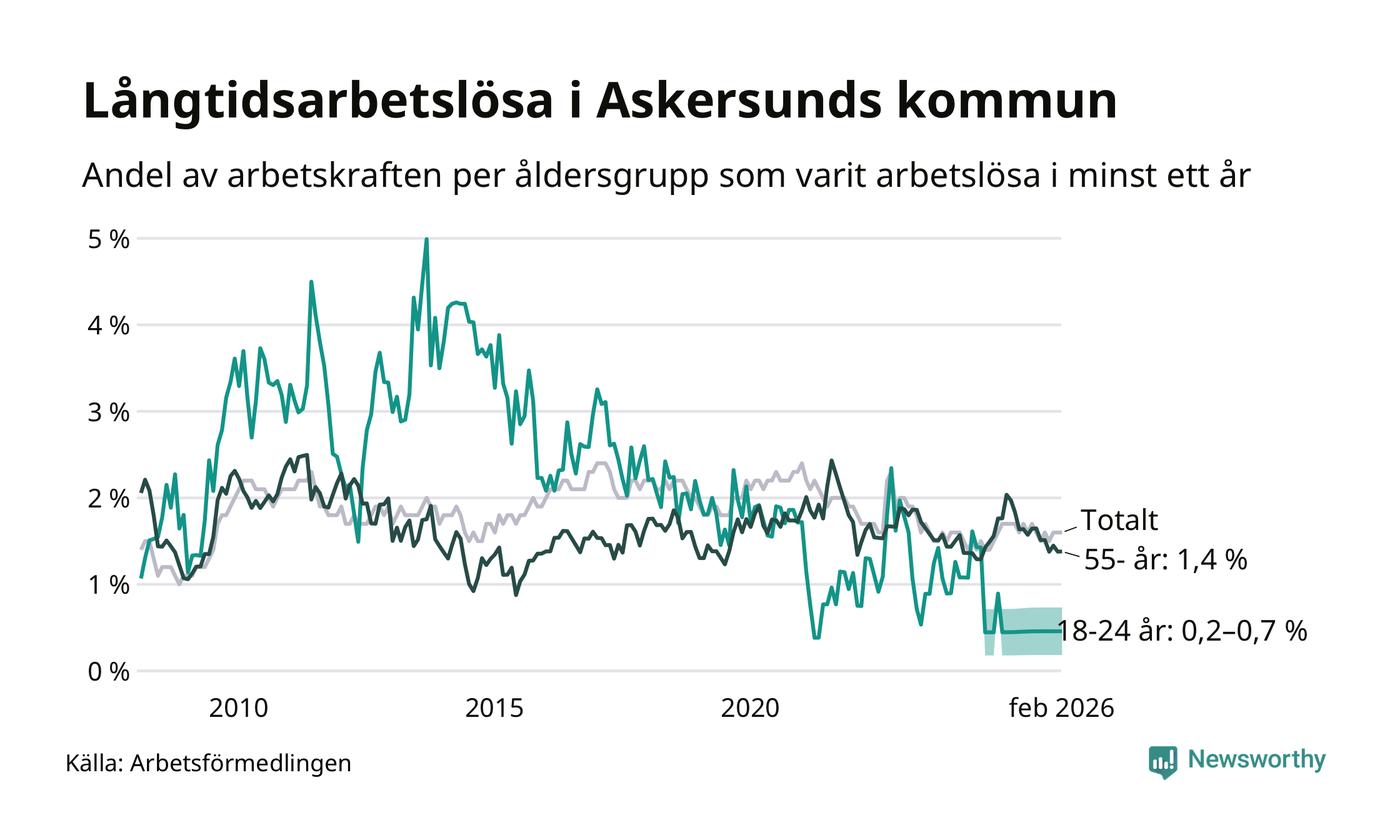 I februari hade 82 Askersundsbor varit arbetslösa i minst ett år, vilket är tre färre än månaden innan. 82 personer motsvarar 1,6 procent av arbetskraften i kommunen – andelen långtidsarbetslösa är ungefär på samma nivå som för ett år sedan.