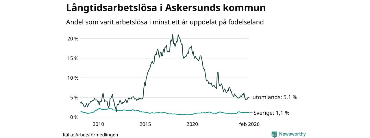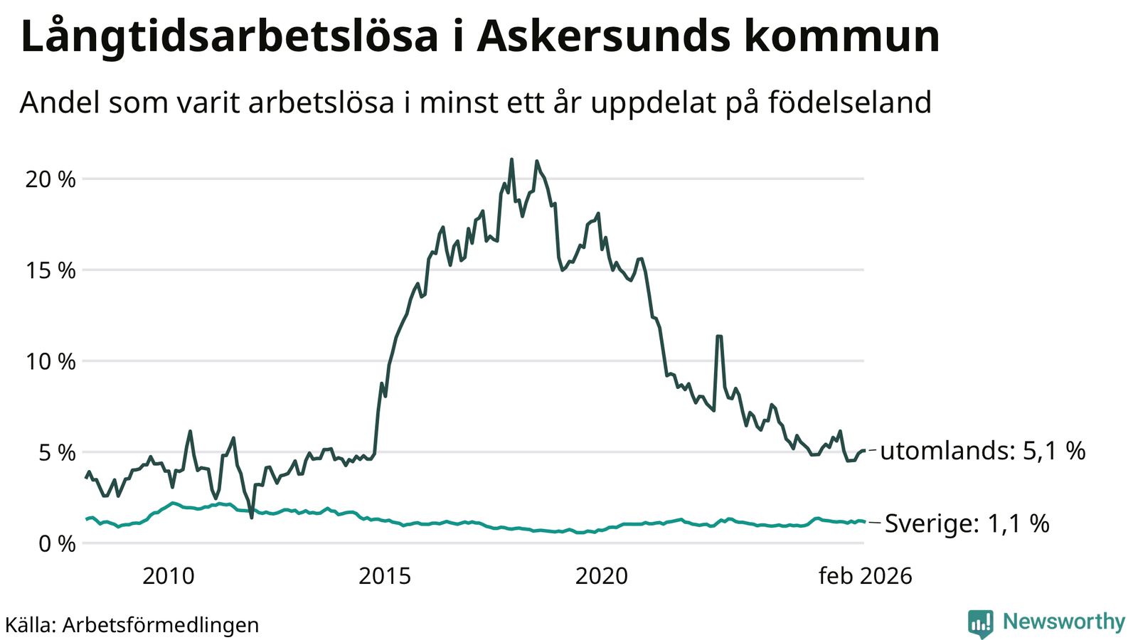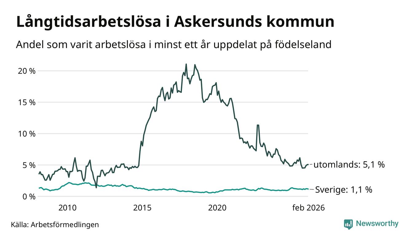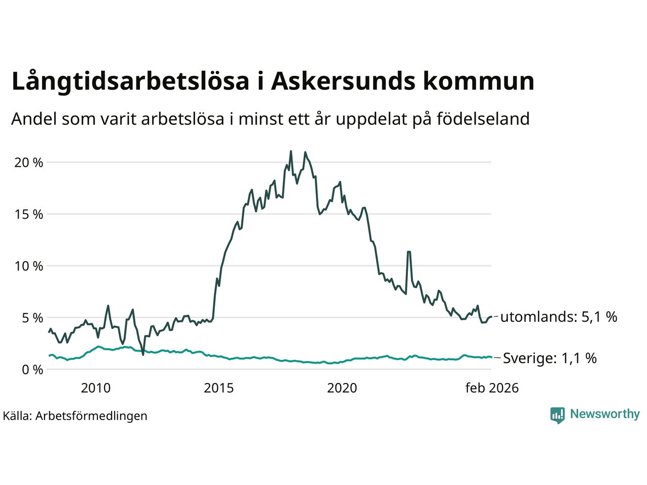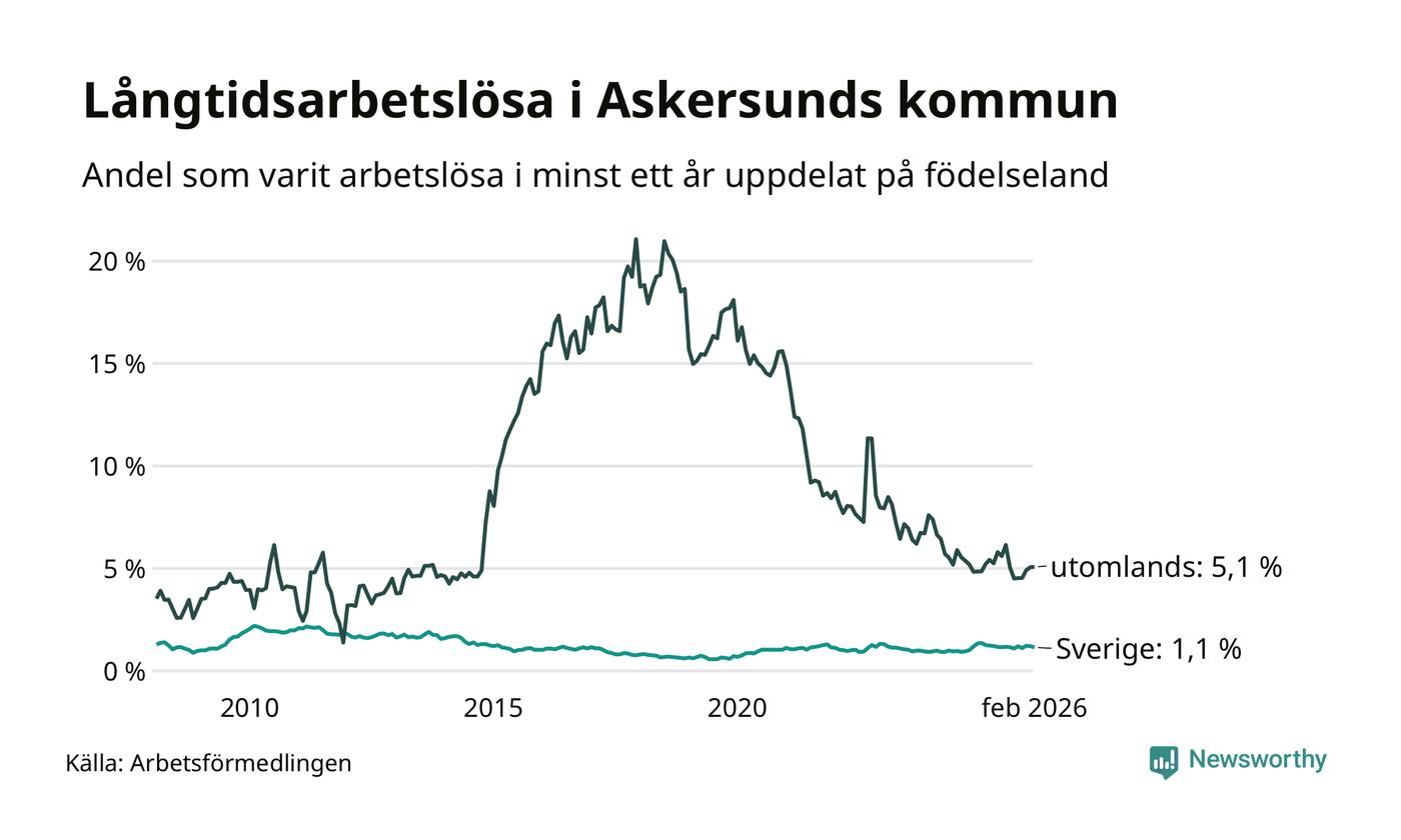 54 av de långtidsarbetslösa i Askersund är födda i Sverige, medan 28 är födda utomlands. Det innebär att långtidsarbetslösheten bland Sverigefödda är 1,1 procent, medan den är fem gånger så hög – 5,1 procent – bland födda utomlands. Även i riket som helhet är arbetslösheten högre bland utrikesfödda.
