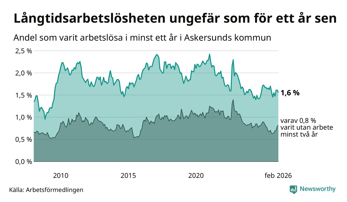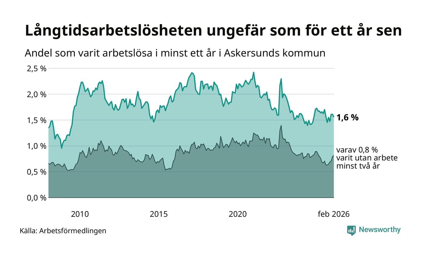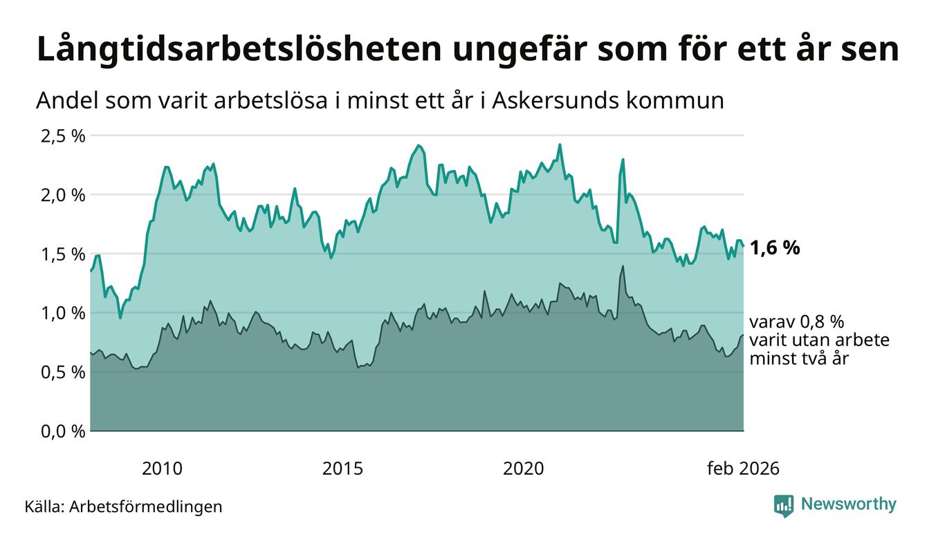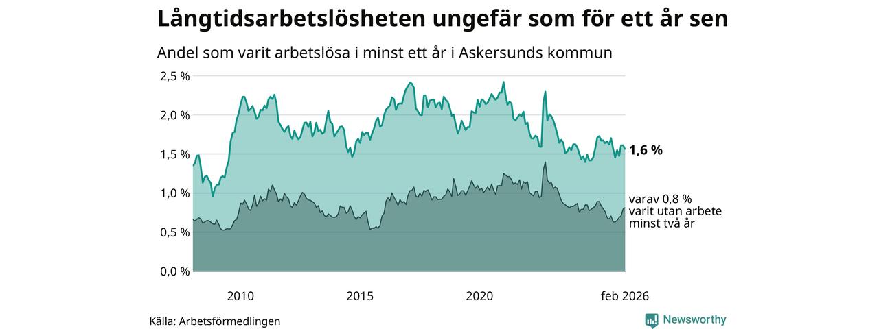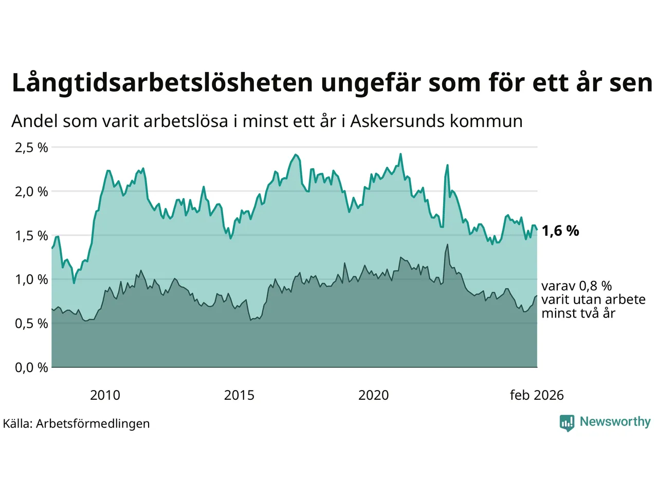Andelen som varit utan arbete i minst ett år i Askersund var ungefär lika stor i februari jämfört med samma månad för ett år sedan. Det visar Arbetsfömedlingens senaste månadsstatistik.