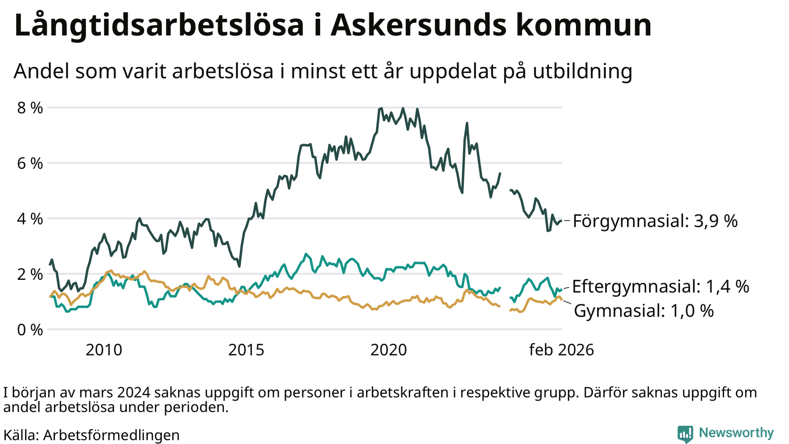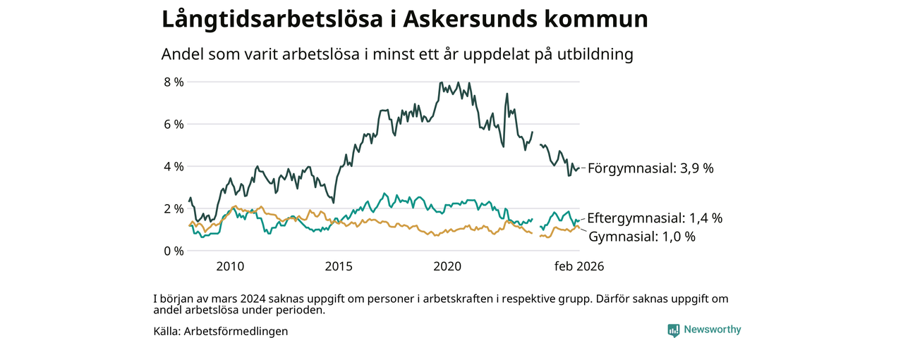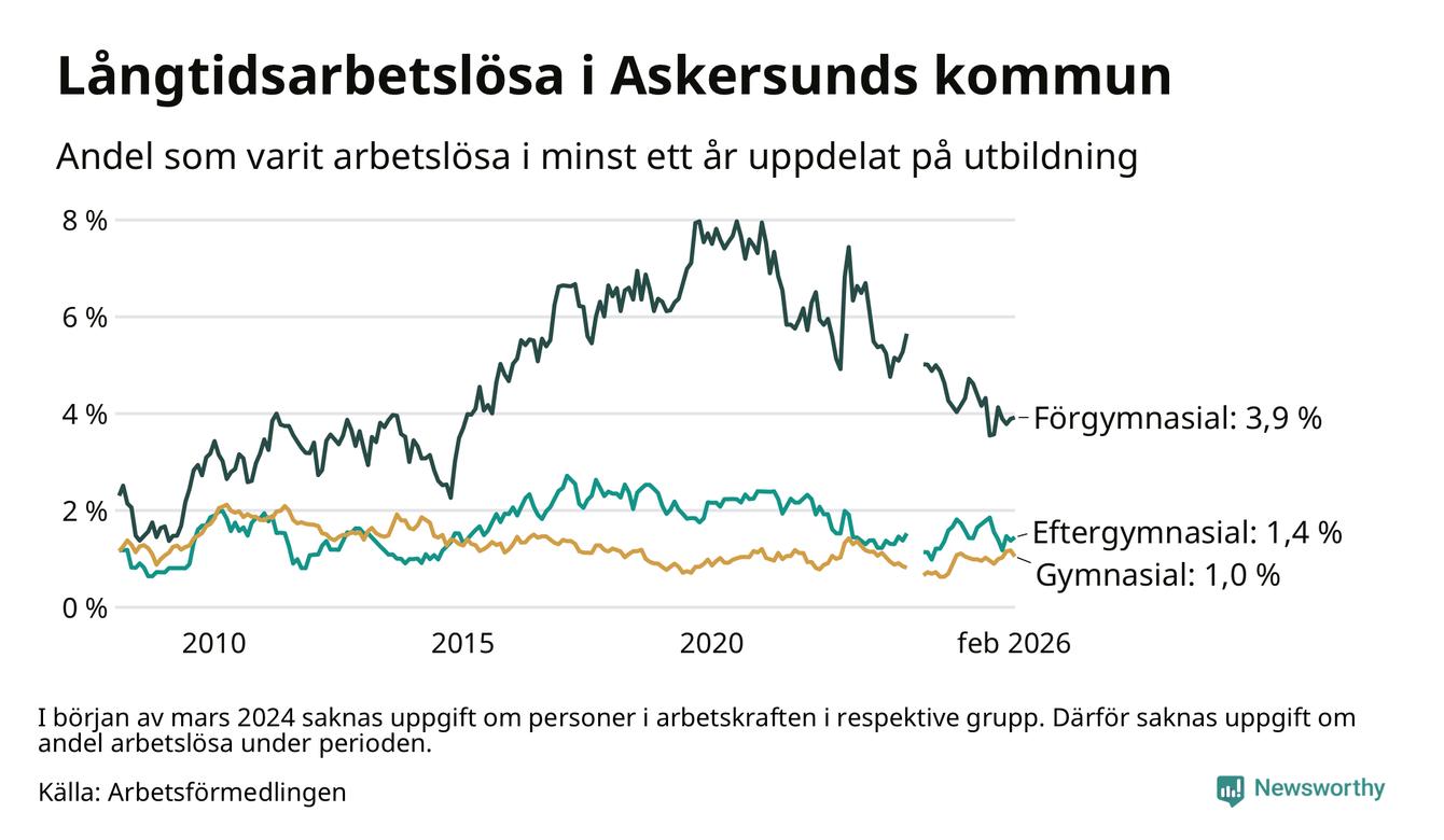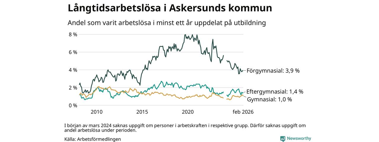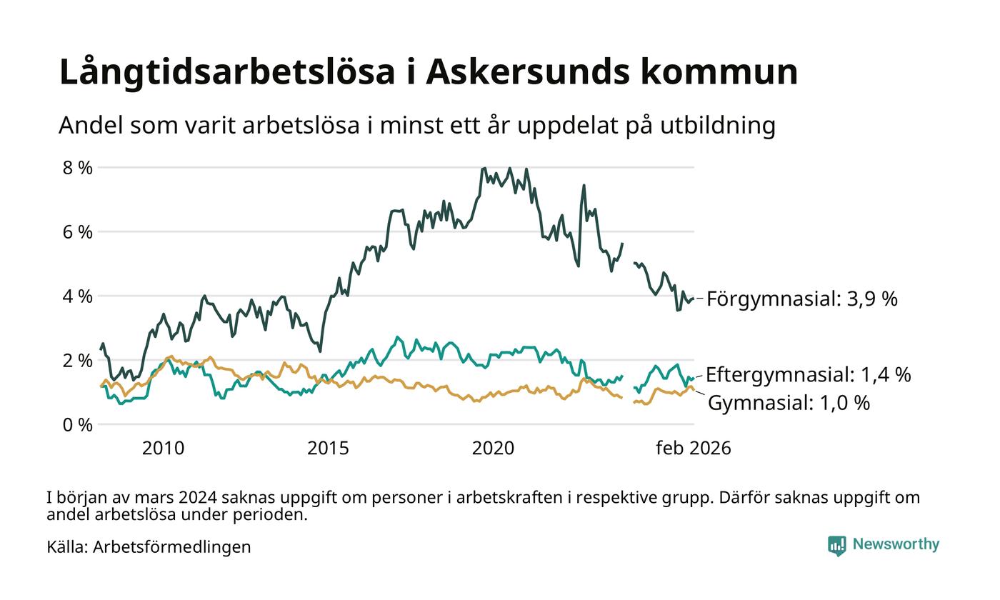 Andelen som varit utan arbete i minst ett år i Askersund var ungefär lika stor i februari jämfört med samma månad för ett år sedan. Det visar Arbetsfömedlingens senaste månadsstatistik.