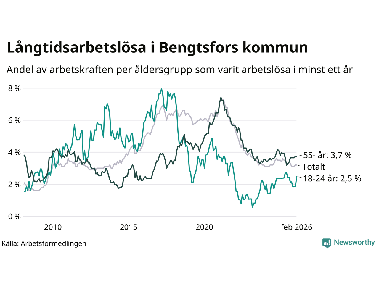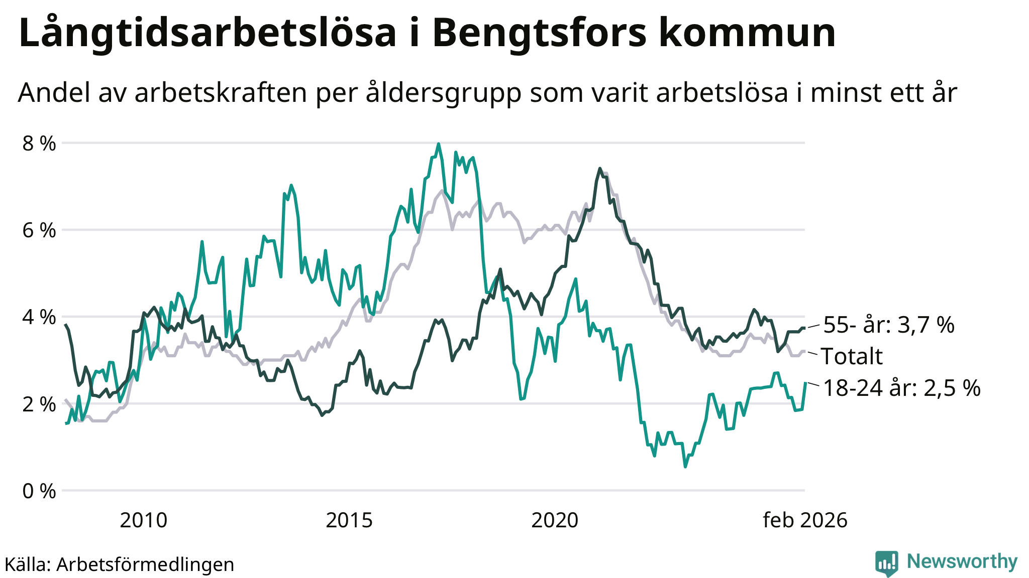 Graf: Andel arbetslösa uppdelat i åldersgrupper i Bengtsfors