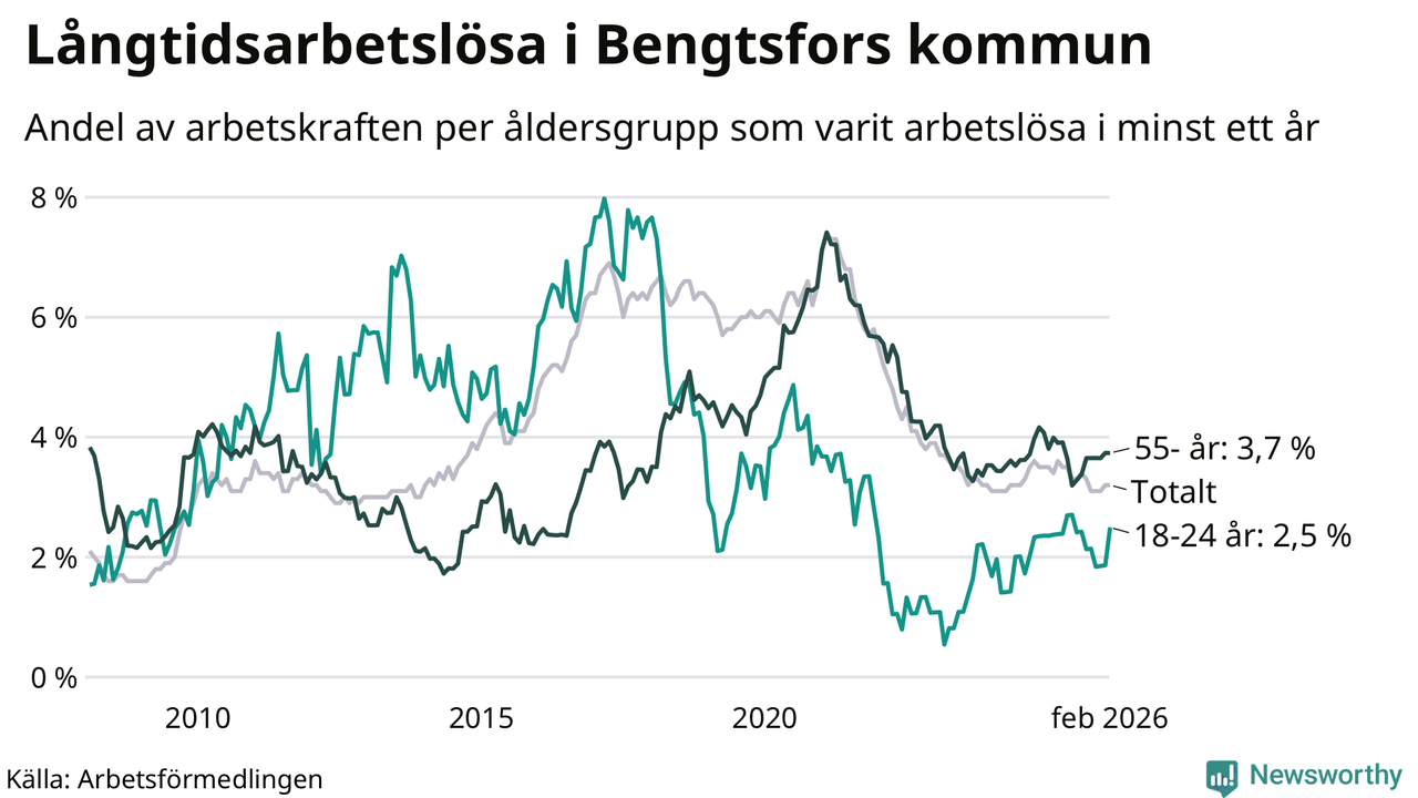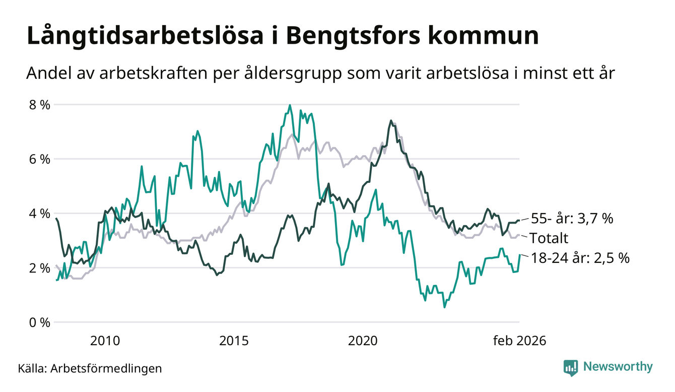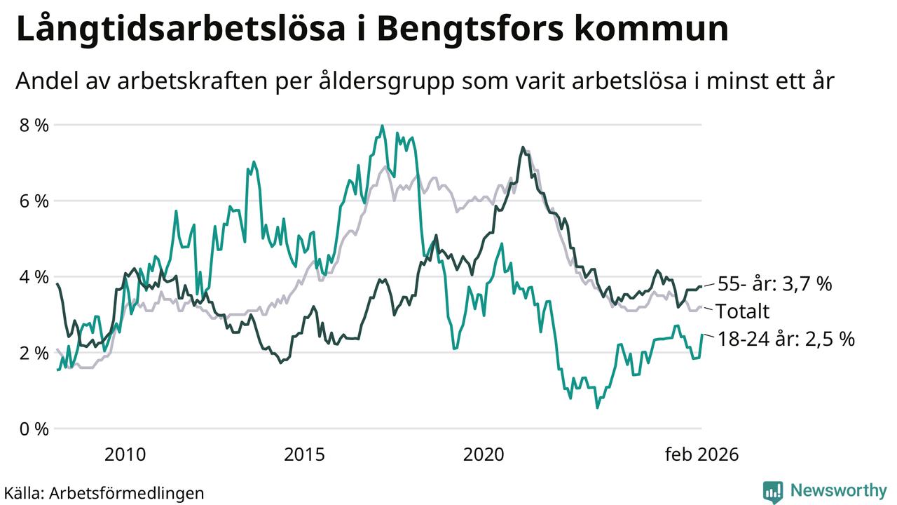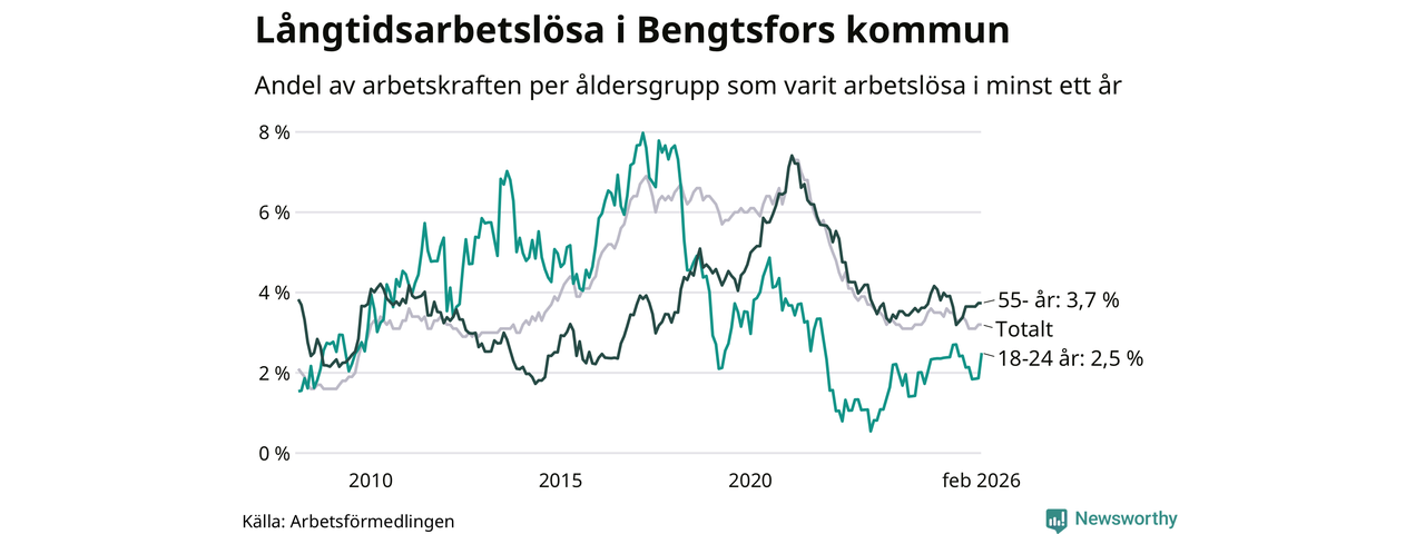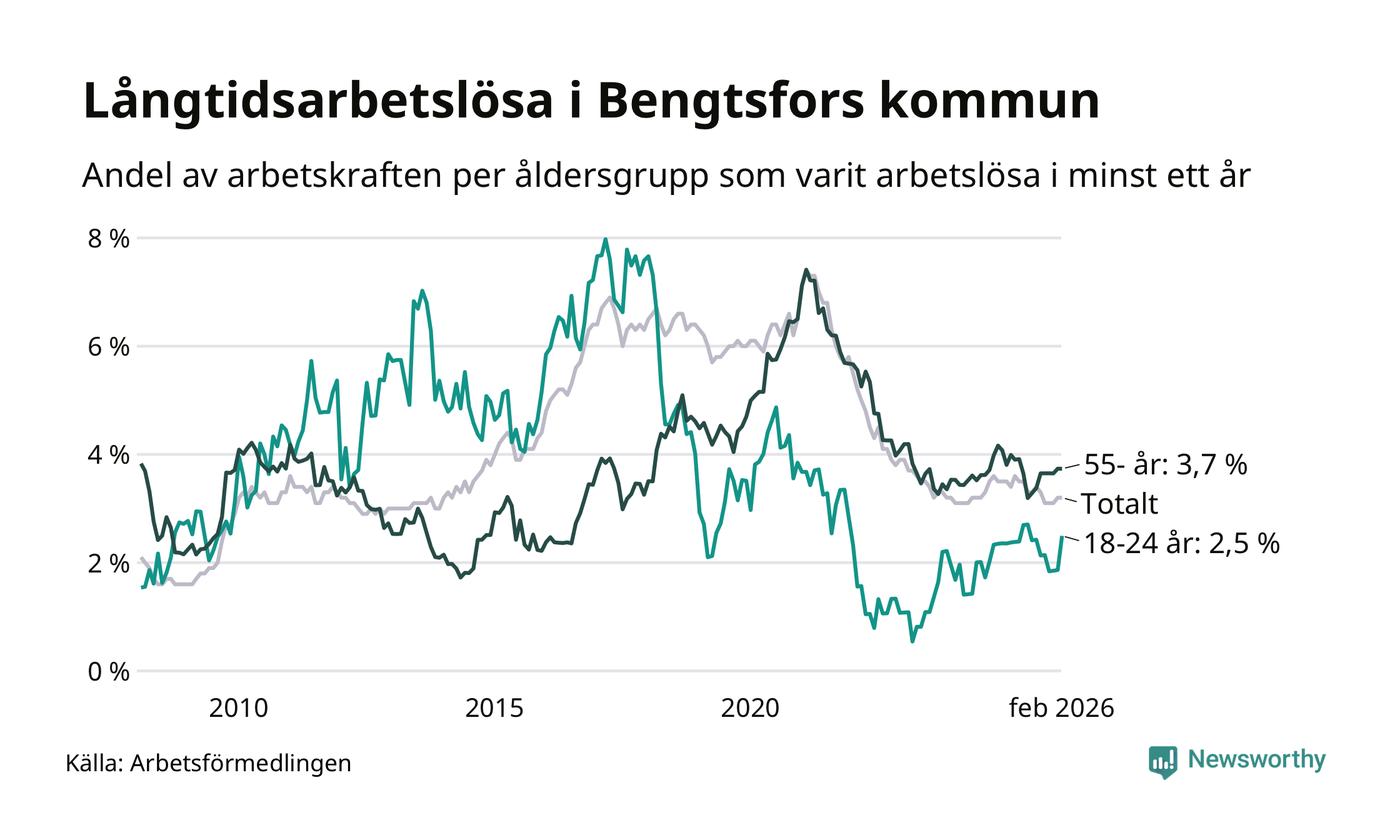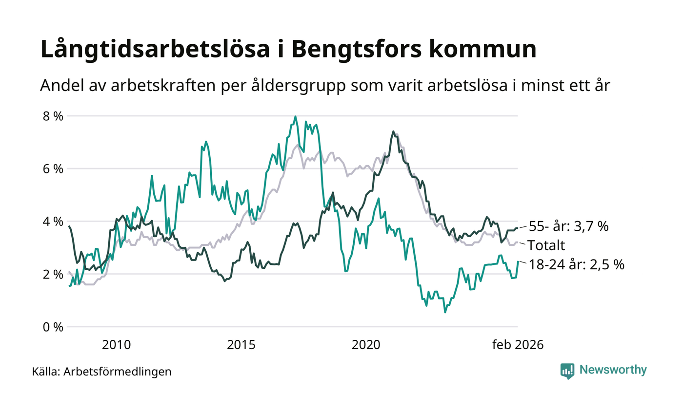 Av de 125 personerna som varit arbetslösa i mer än ett år i Bengtsfors kommun är 41 personer mellan 55 och 661 år och åtta är mellan 18 och 24 år. För den äldre gruppen är andelen arbetslösa 3,7 procent medan den i den yngre gruppen är 2,5 procent. Även i riket som helhet är långtidsarbetslösheten högre i gruppen äldre.