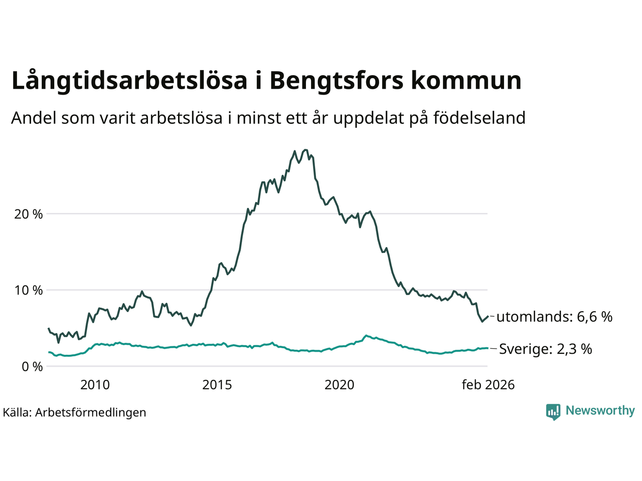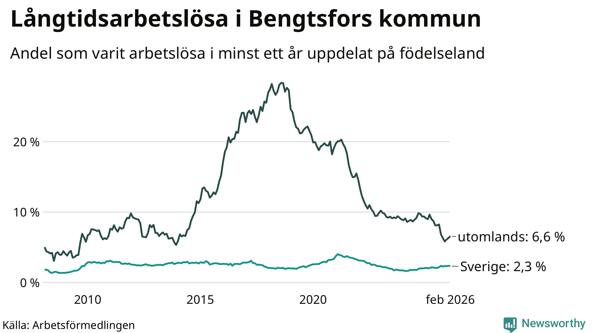 Graf: Andel arbetslösa uppdelat på födelseland i Bengtsfors