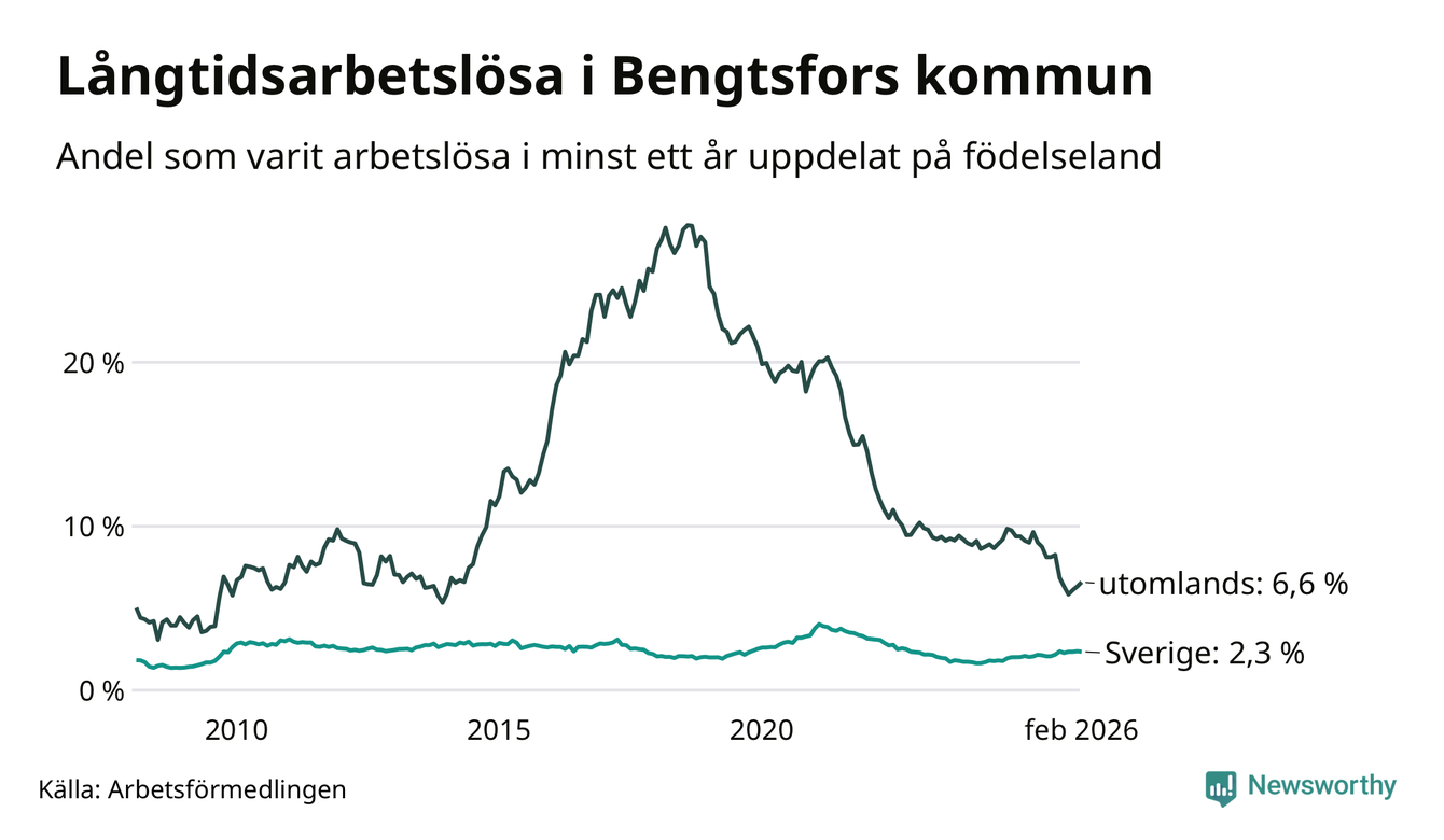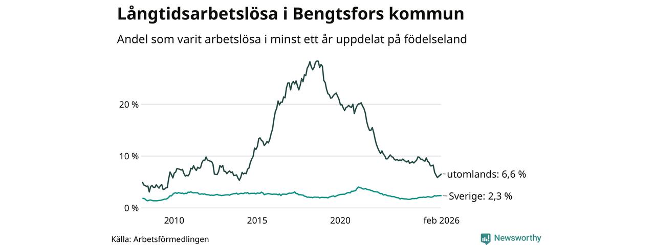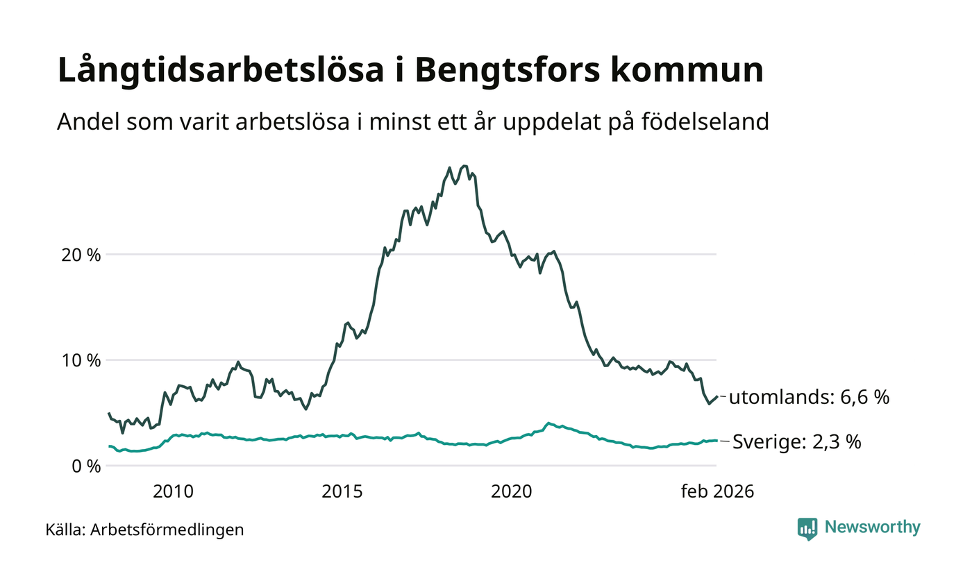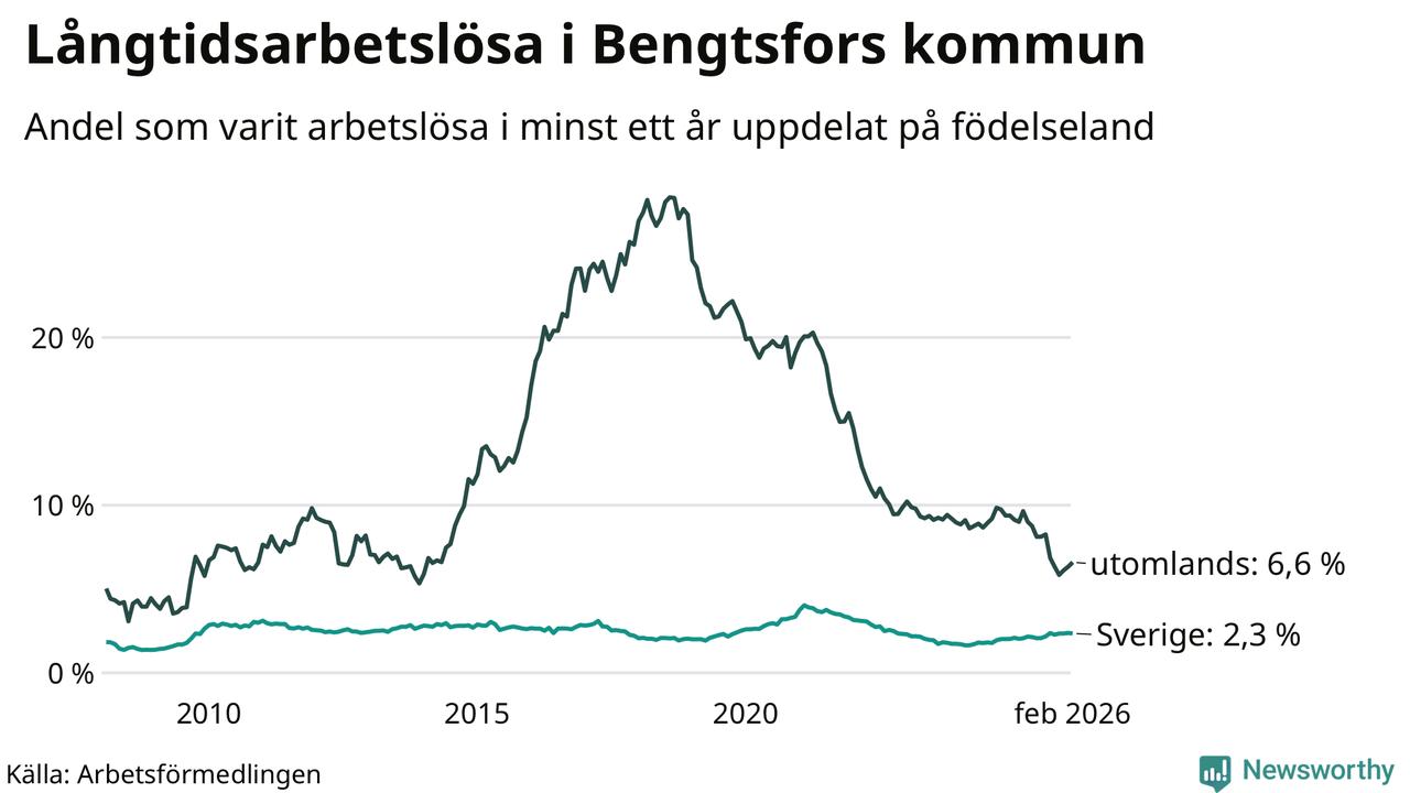 73 av de långtidsarbetslösa i Bengtsfors är födda i Sverige, medan 52 är födda utomlands. Det innebär att långtidsarbetslösheten bland Sverigefödda är 2,3 procent, medan den är tre gånger så hög – 6,6 procent – bland födda utomlands. Även i riket som helhet är arbetslösheten högre bland utrikesfödda.