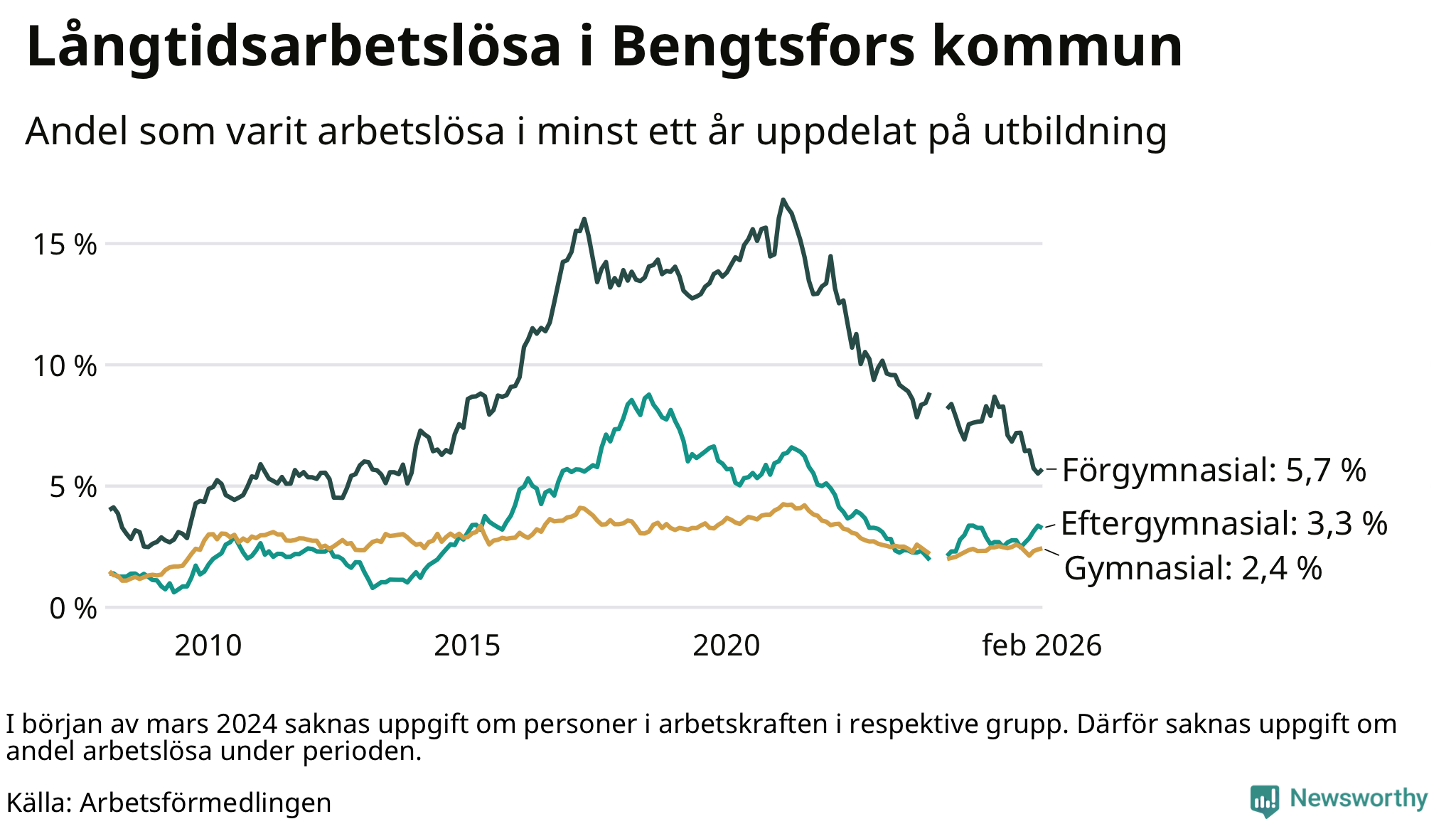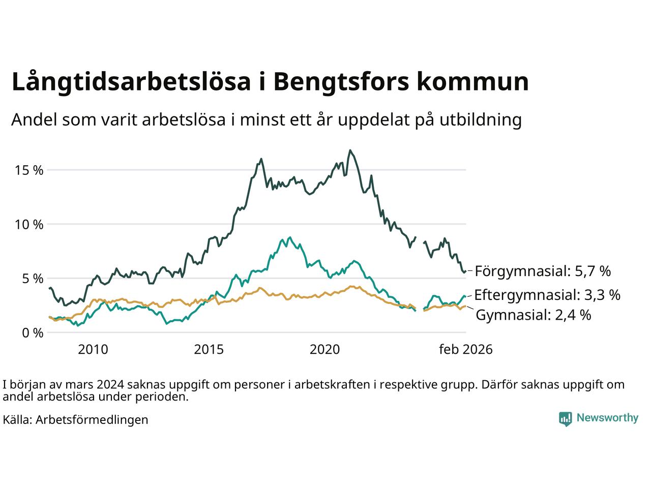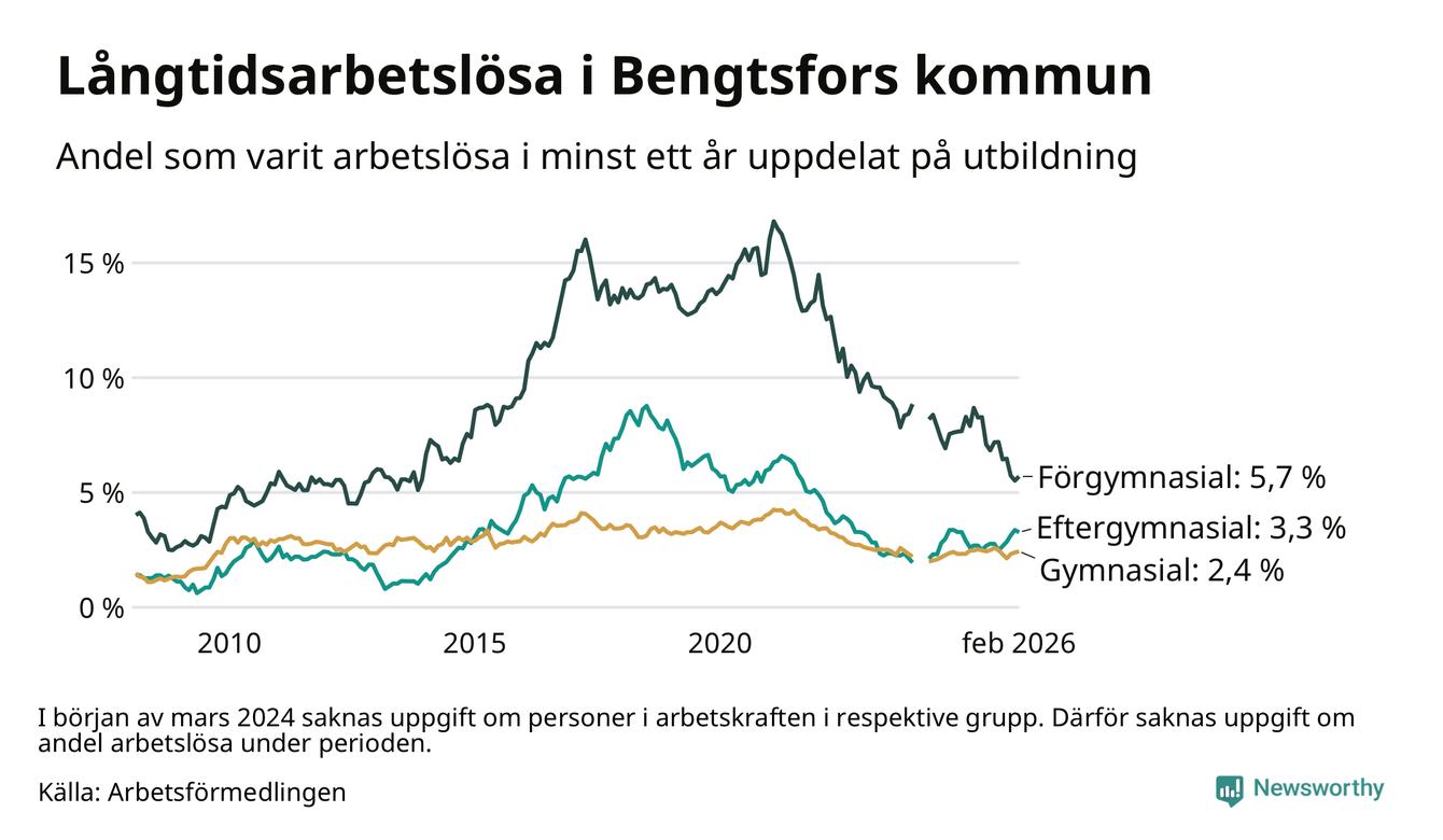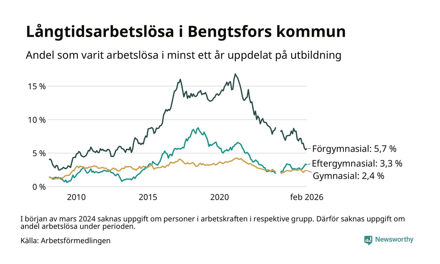 Graf: Andel arbetslösa i Bengtsfors som varit utan arbete i minst 12 månader