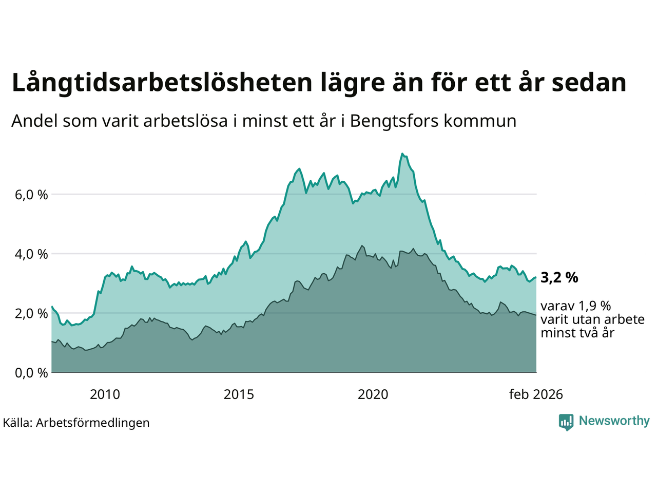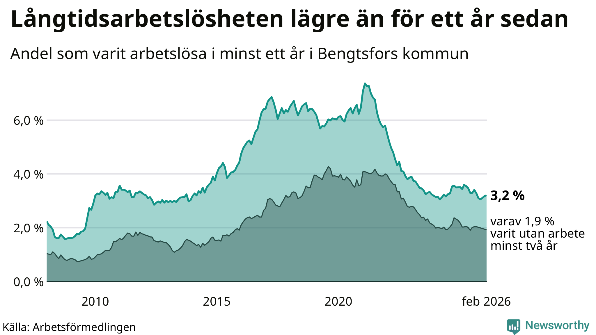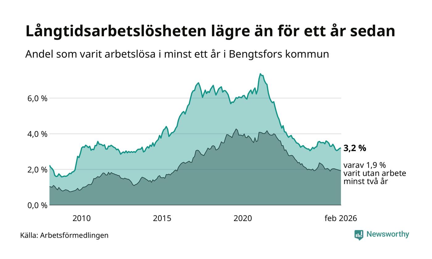 I februari hade 125 Bengtsforsbor varit arbetslösa i minst ett år, vilket är en fler än månaden innan. 125 personer motsvarar 3,2 procent av arbetskraften i kommunen – andelen långtidsarbetslösa är 0,2 procentenheter lägre än samma månad för ett år sedan.