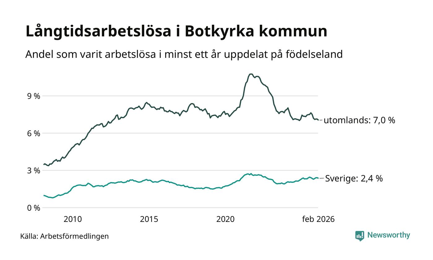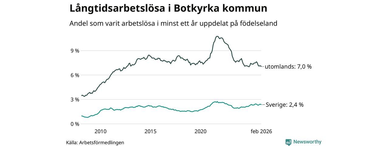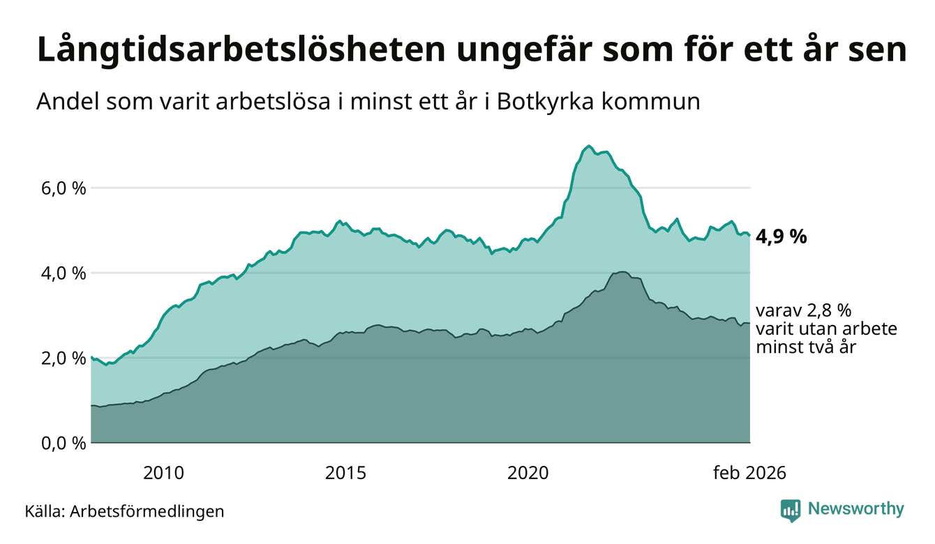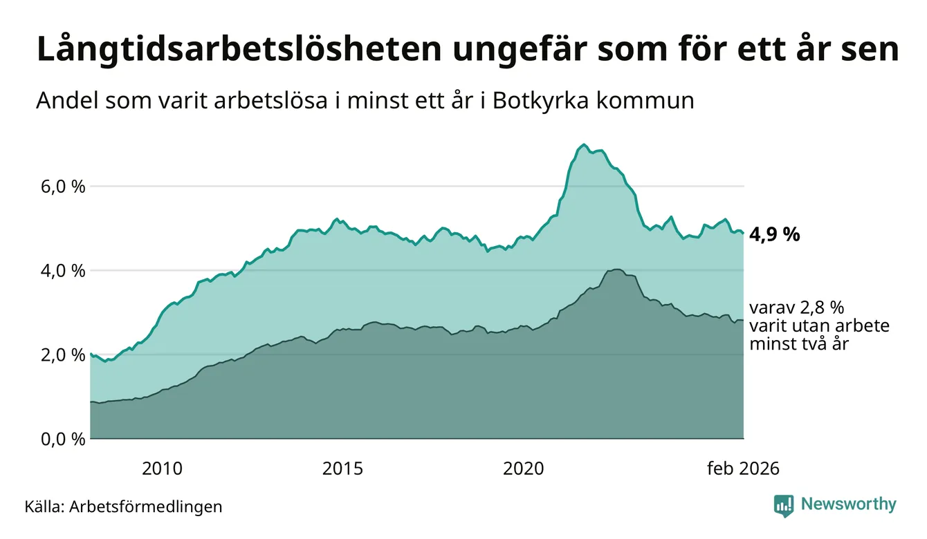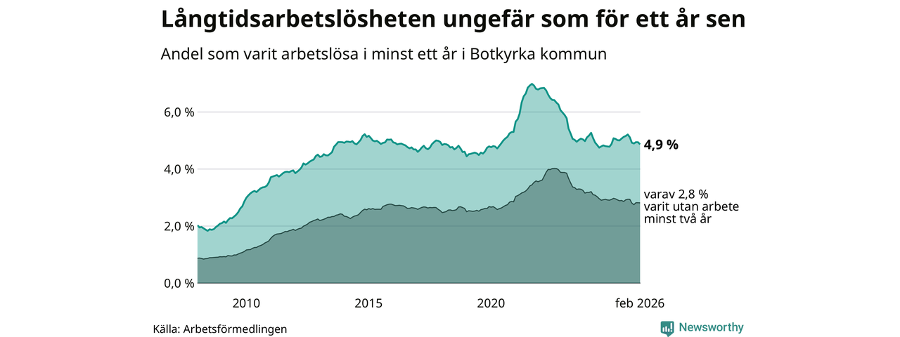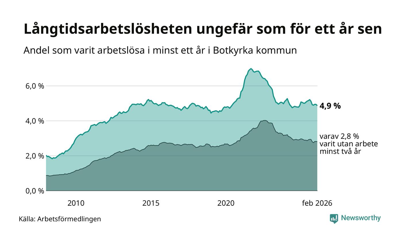 I februari hade 2 398 Botkyrkabor varit arbetslösa i minst ett år, vilket är 35 färre än månaden innan. 2 398 personer motsvarar 4,9 procent av arbetskraften i kommunen – andelen långtidsarbetslösa är ungefär på samma nivå som för ett år sedan. Botkyrka tillhör de kommuner som har högst andel långtidsarbetslösa i hela landet just nu.