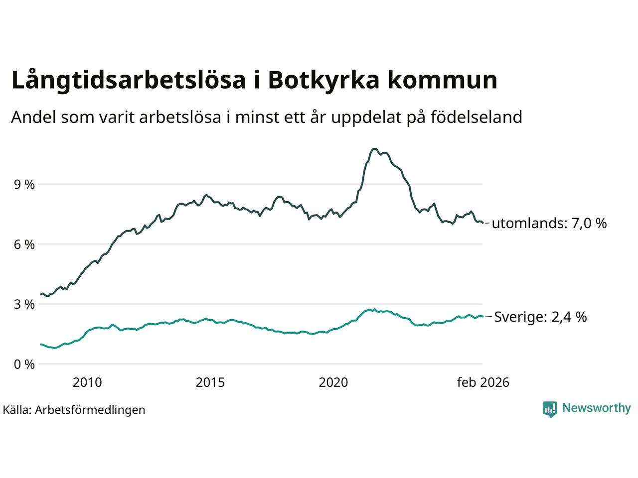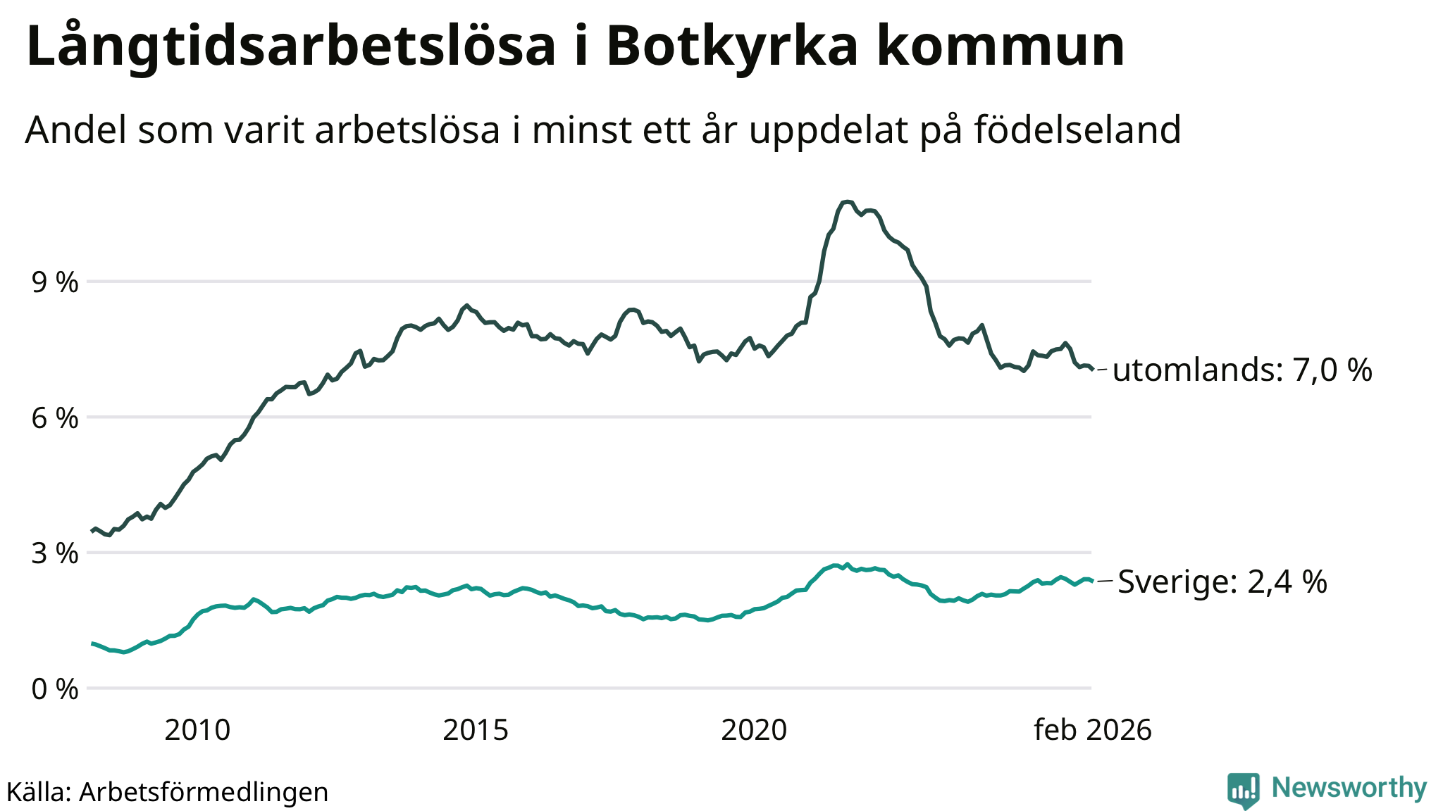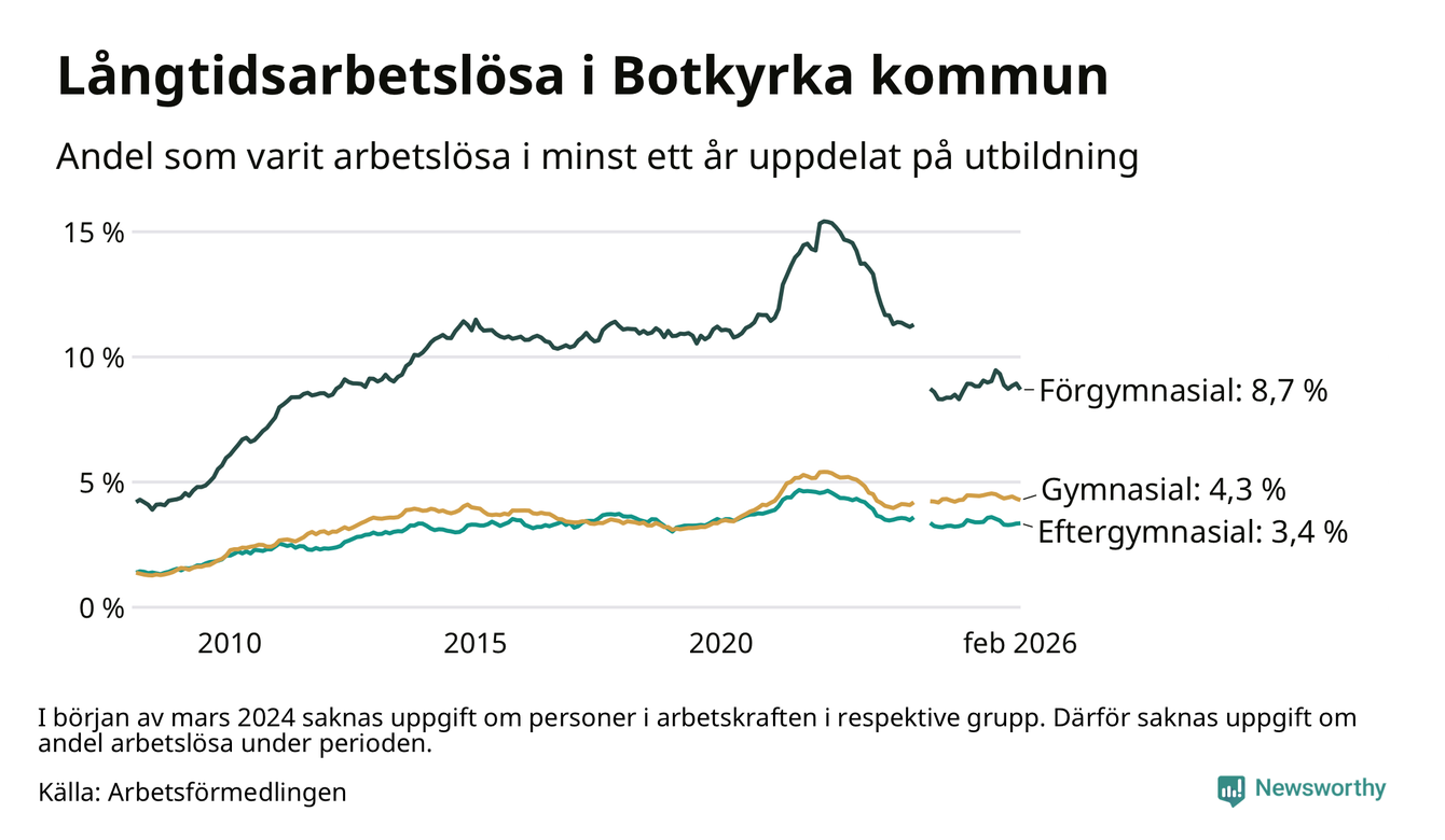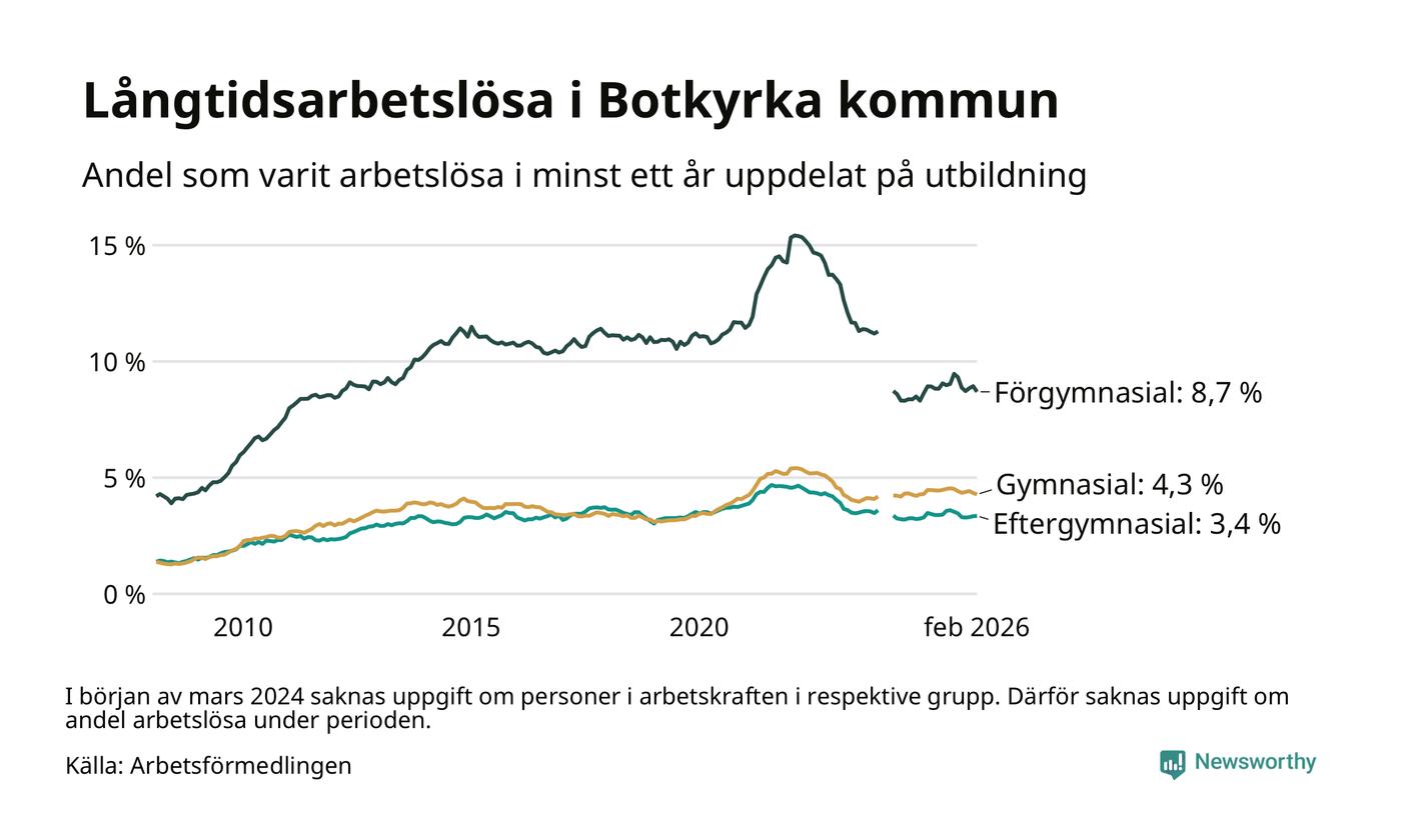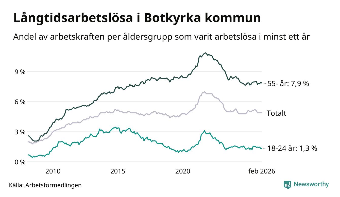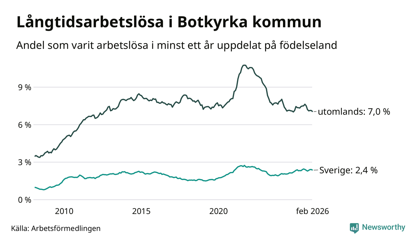 I februari hade 2 398 Botkyrkabor varit arbetslösa i minst ett år, vilket är 35 färre än månaden innan. 2 398 personer motsvarar 4,9 procent av arbetskraften i kommunen – andelen långtidsarbetslösa är ungefär på samma nivå som för ett år sedan. Botkyrka tillhör de kommuner som har högst andel långtidsarbetslösa i hela landet just nu.